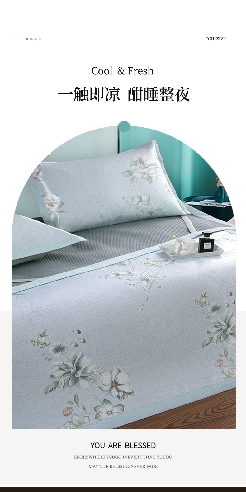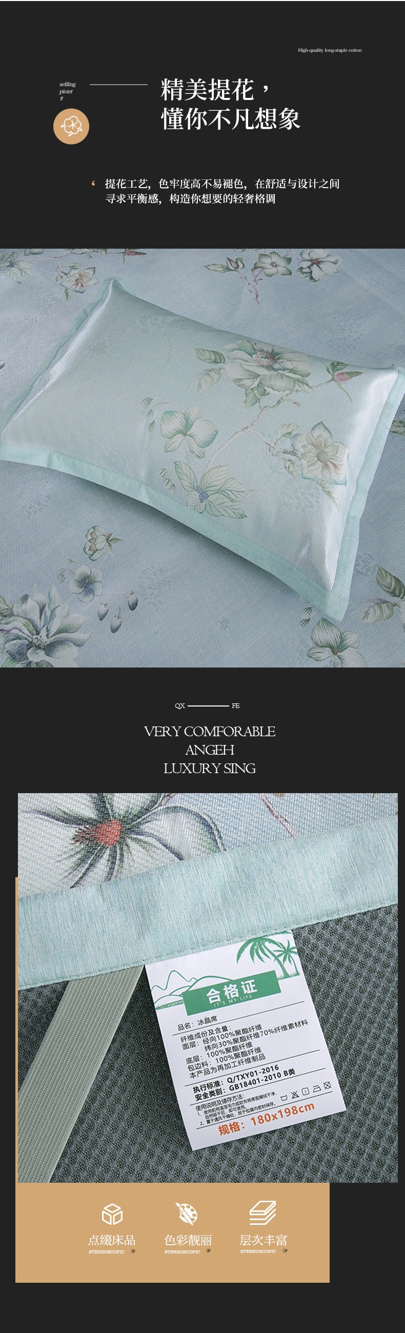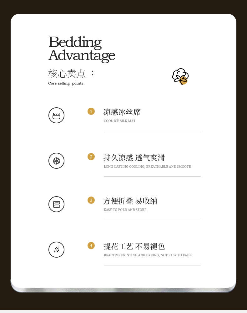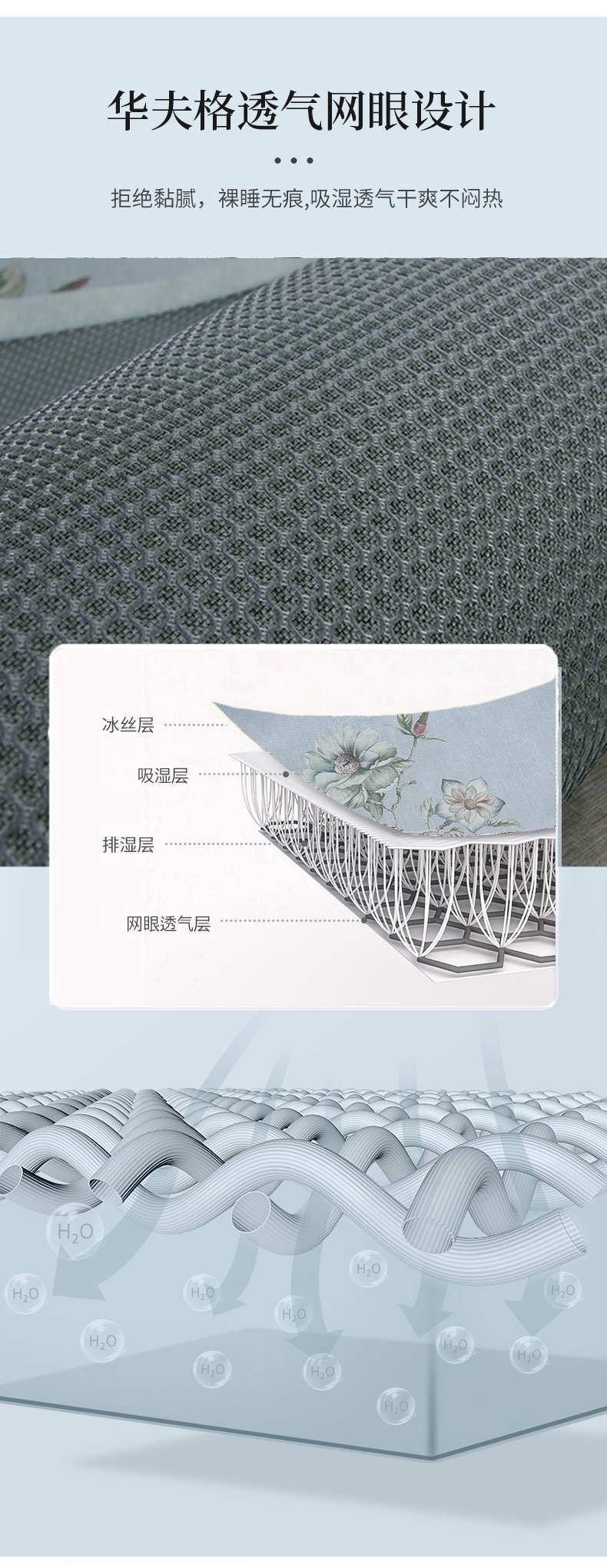 冰丝纤维自带降温功能,躺上体感温度直降3-5°C;燥热的夏天,也抵不过它的丝滑舒爽,;睡眠无拘束,触肤凉而不冰并且有良好的散热性能。