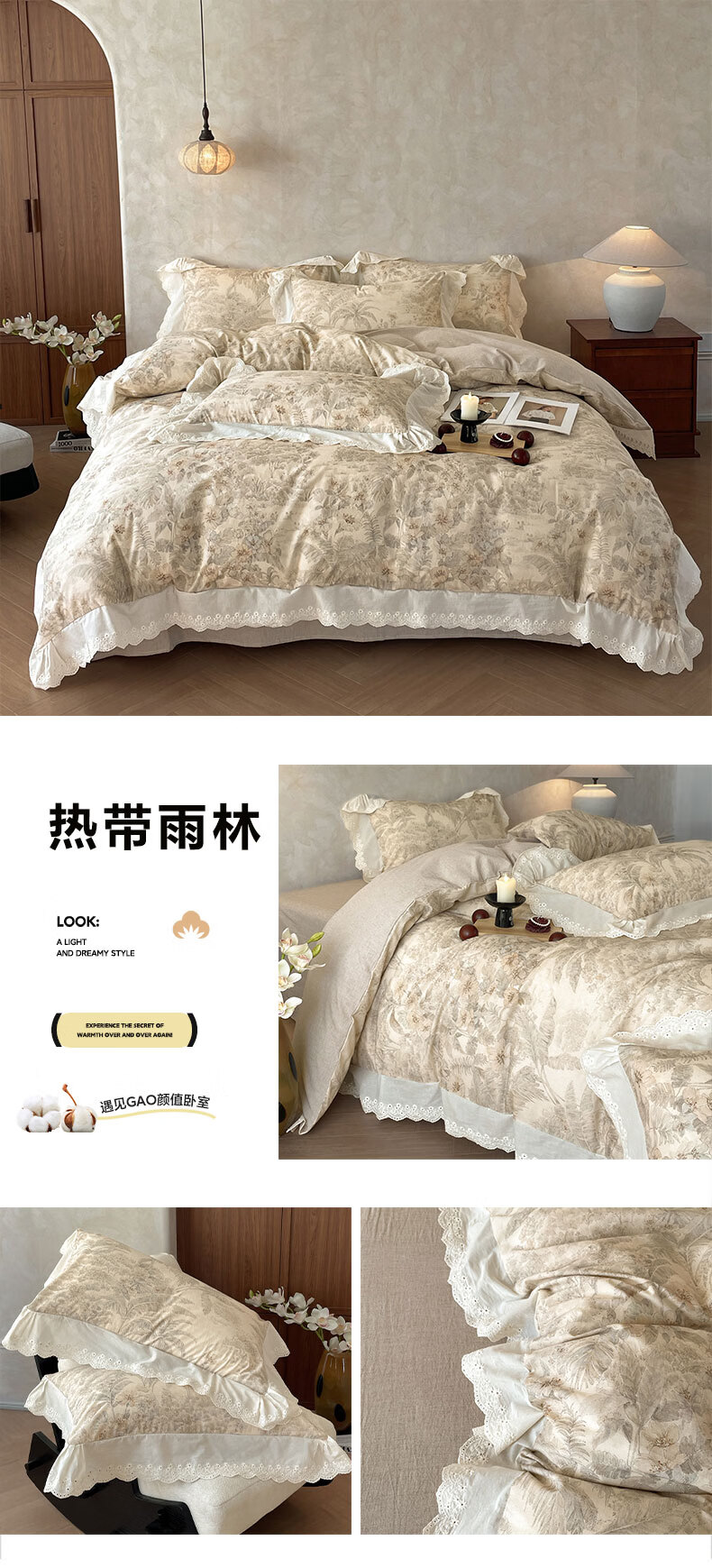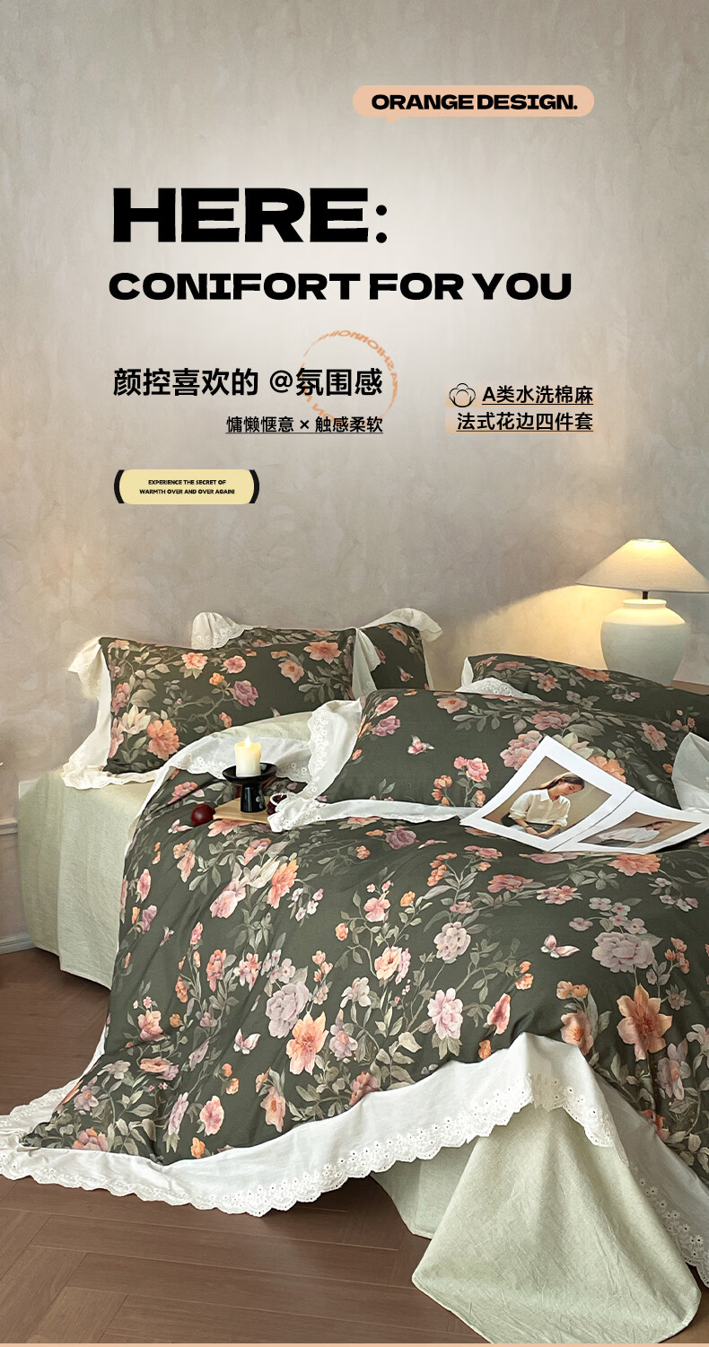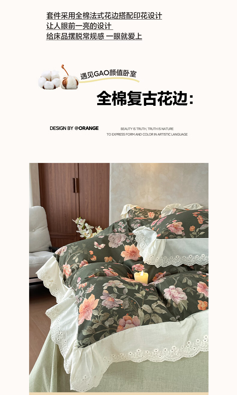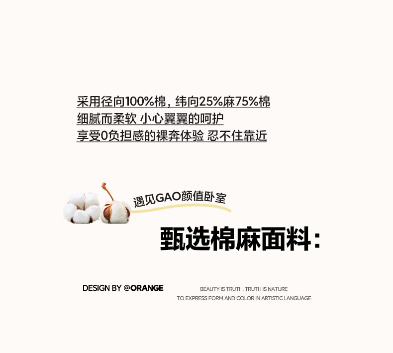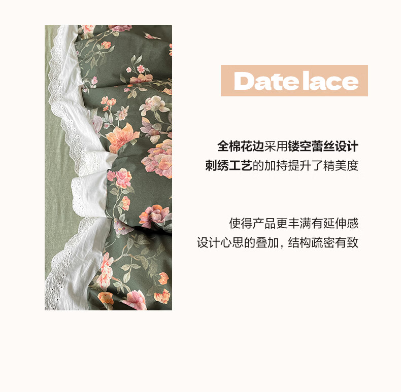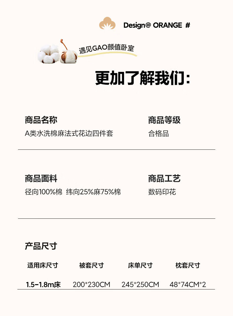 甄选棉麻面料,采用径向100%棉,纬向25%麻75;棉细腻而柔软小心翼翼的呵护享受0负担感的裸奔体验 ;套件采用全棉法式花边搭配印花设计让人眼前一亮的设计