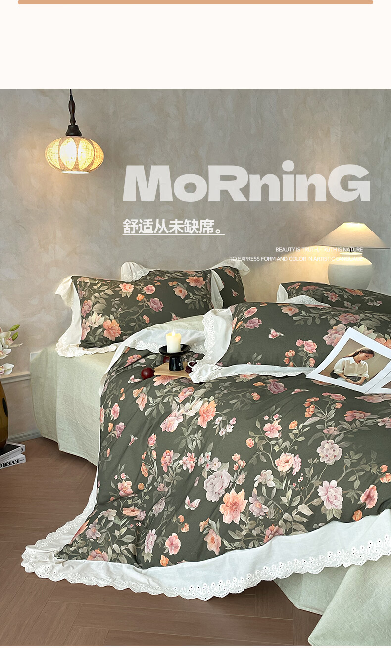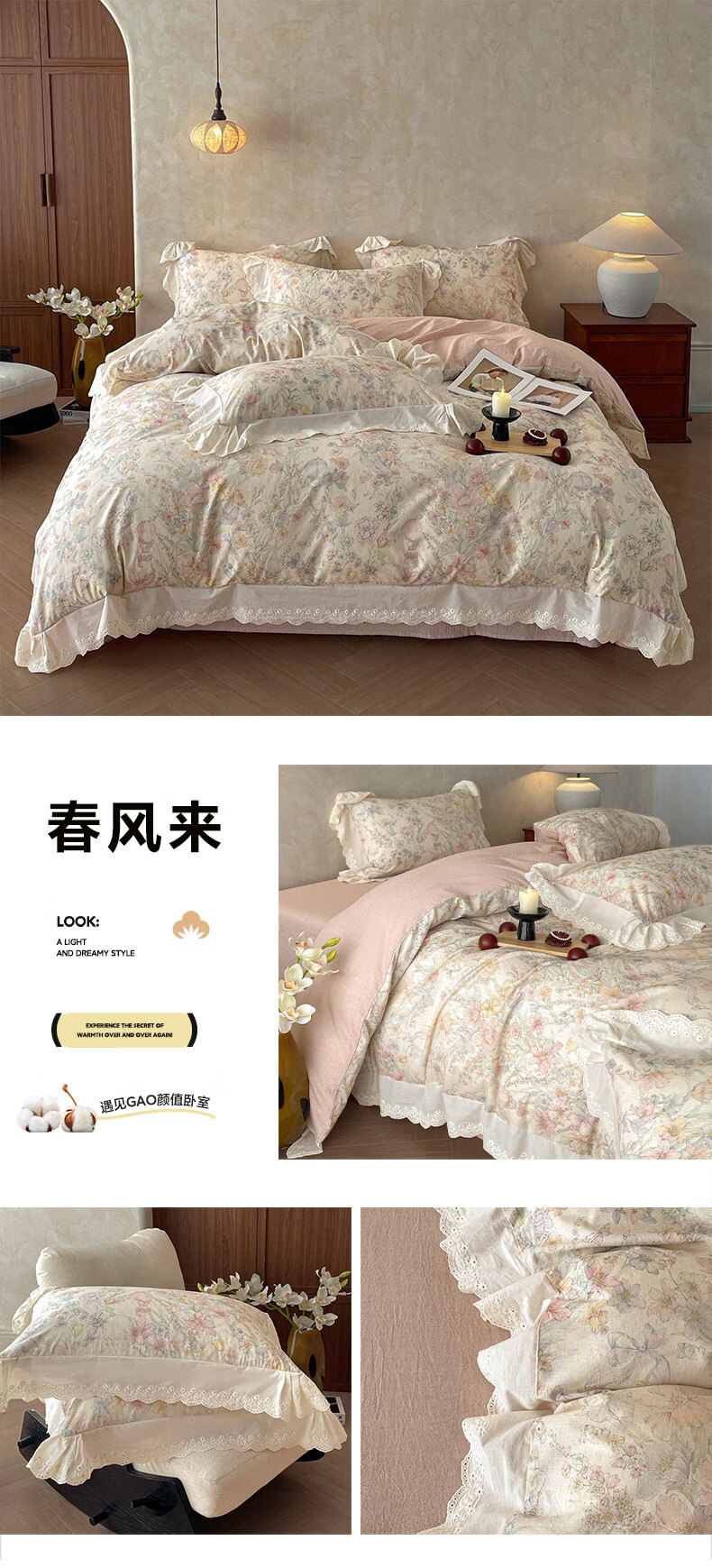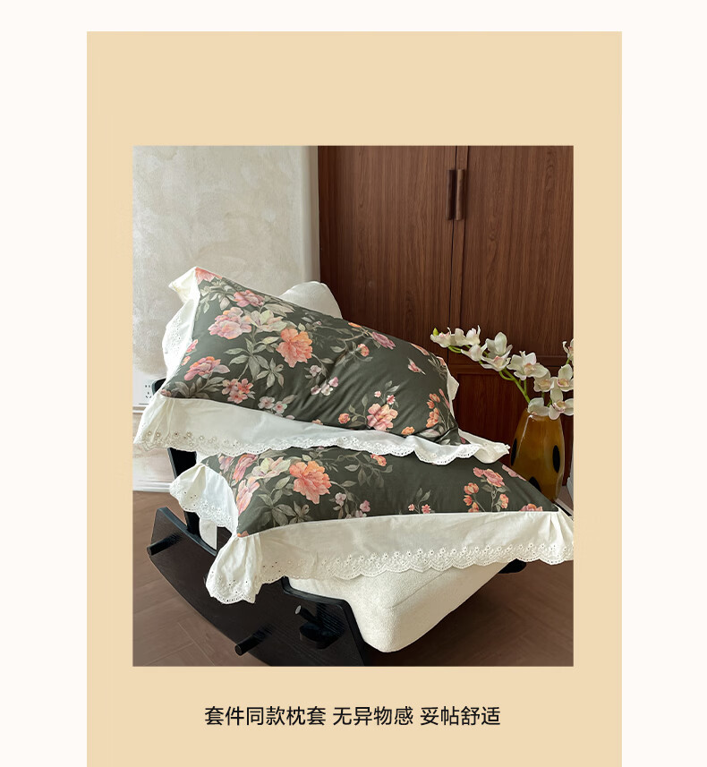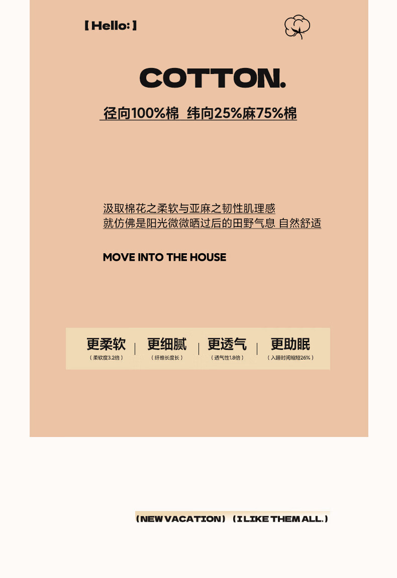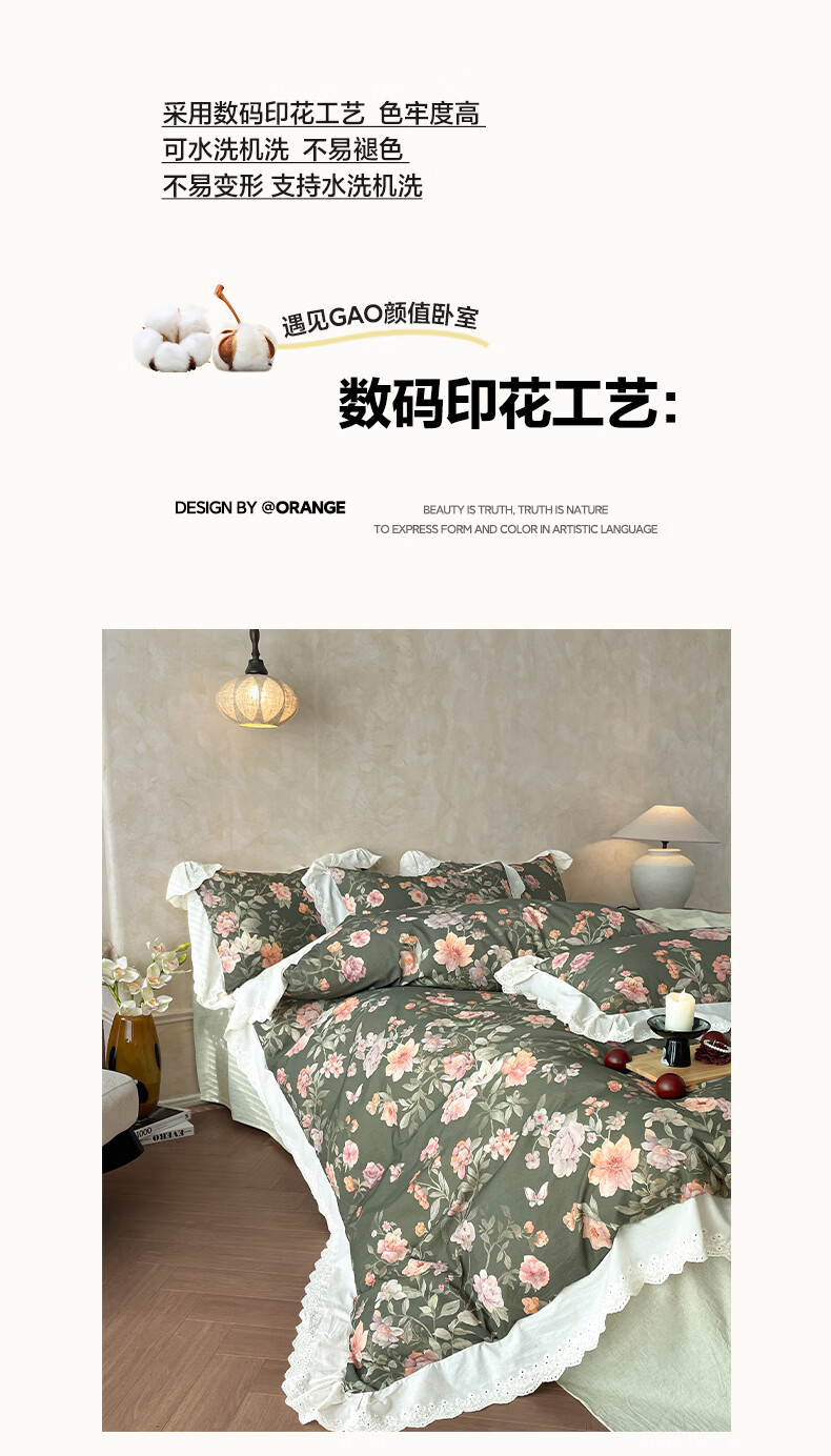 甄选棉麻面料,采用径向100%棉,纬向25%麻75;棉细腻而柔软小心翼翼的呵护享受0负担感的裸奔体验 ;套件采用全棉法式花边搭配印花设计让人眼前一亮的设计