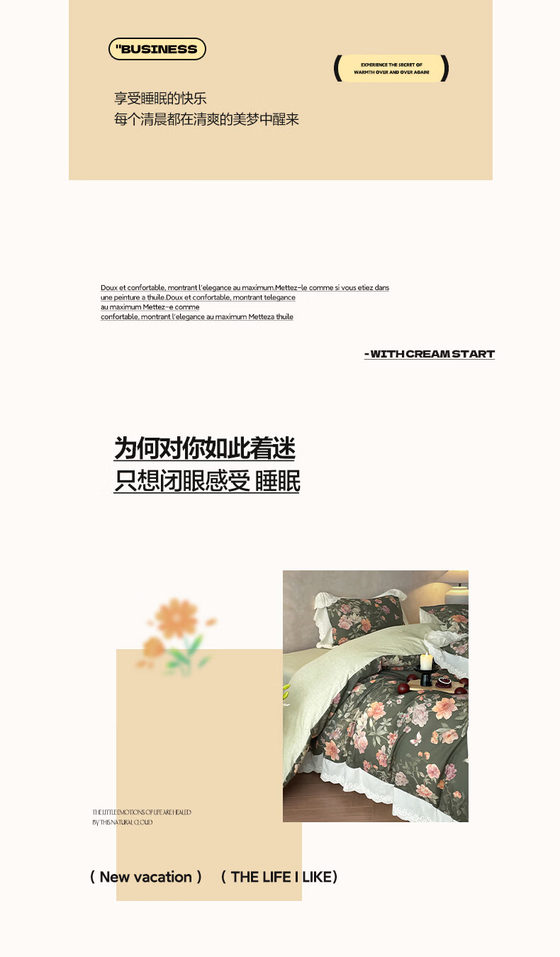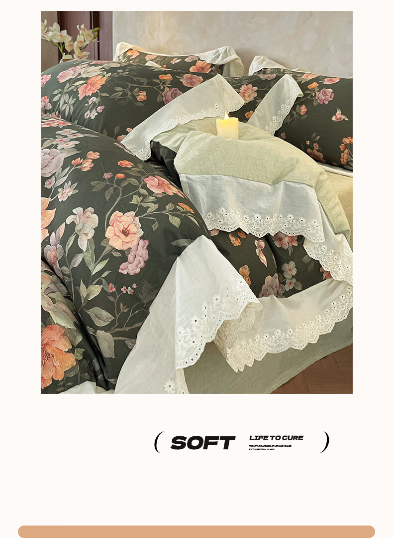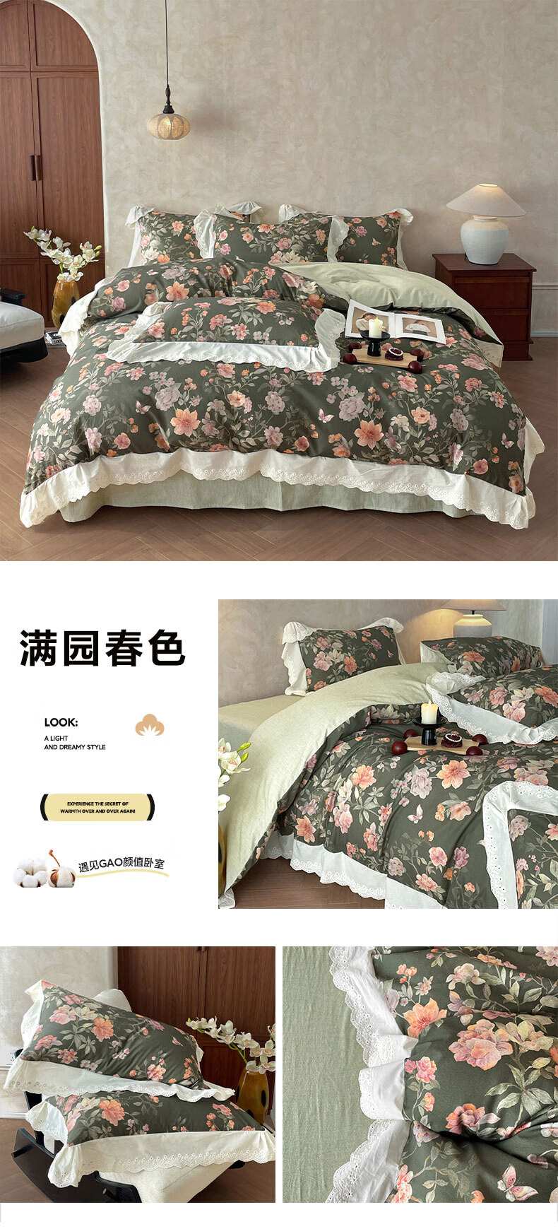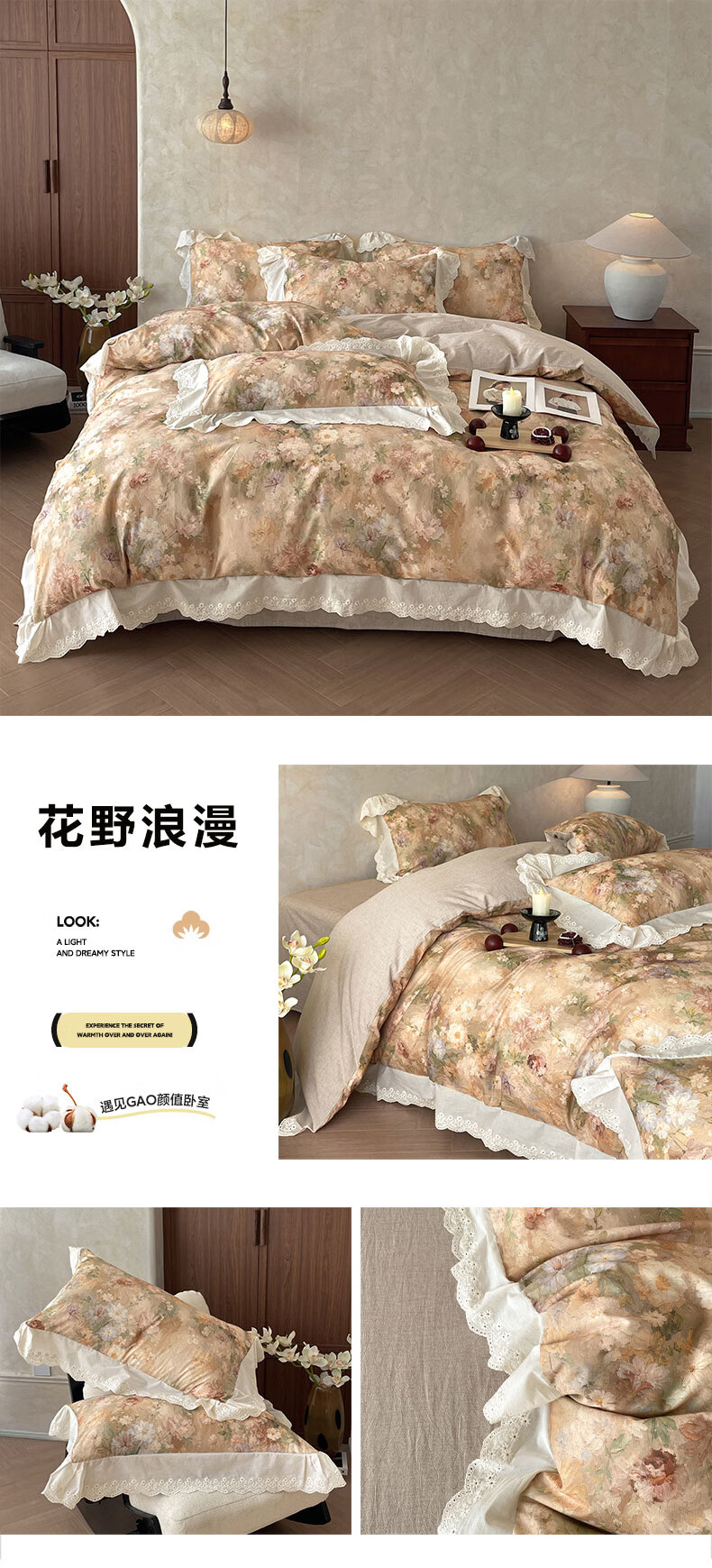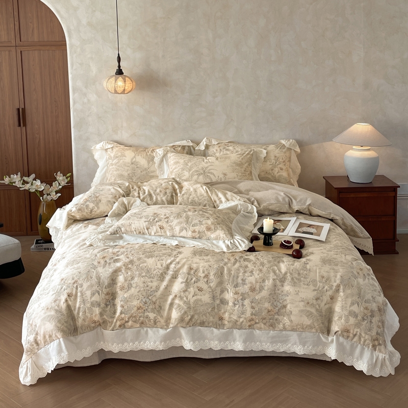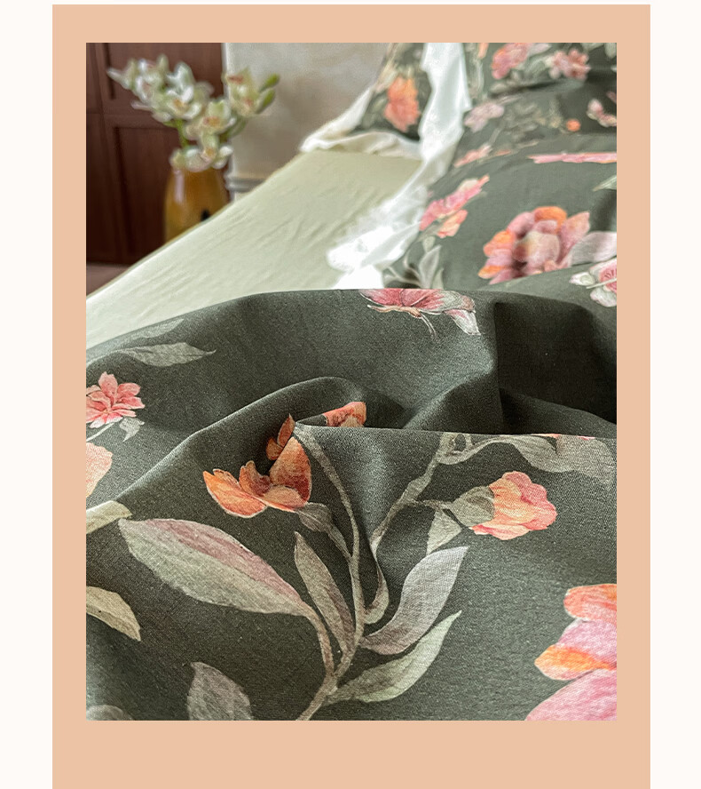 甄选棉麻面料,采用径向100%棉,纬向25%麻75;棉细腻而柔软小心翼翼的呵护享受0负担感的裸奔体验 ;套件采用全棉法式花边搭配印花设计让人眼前一亮的设计
