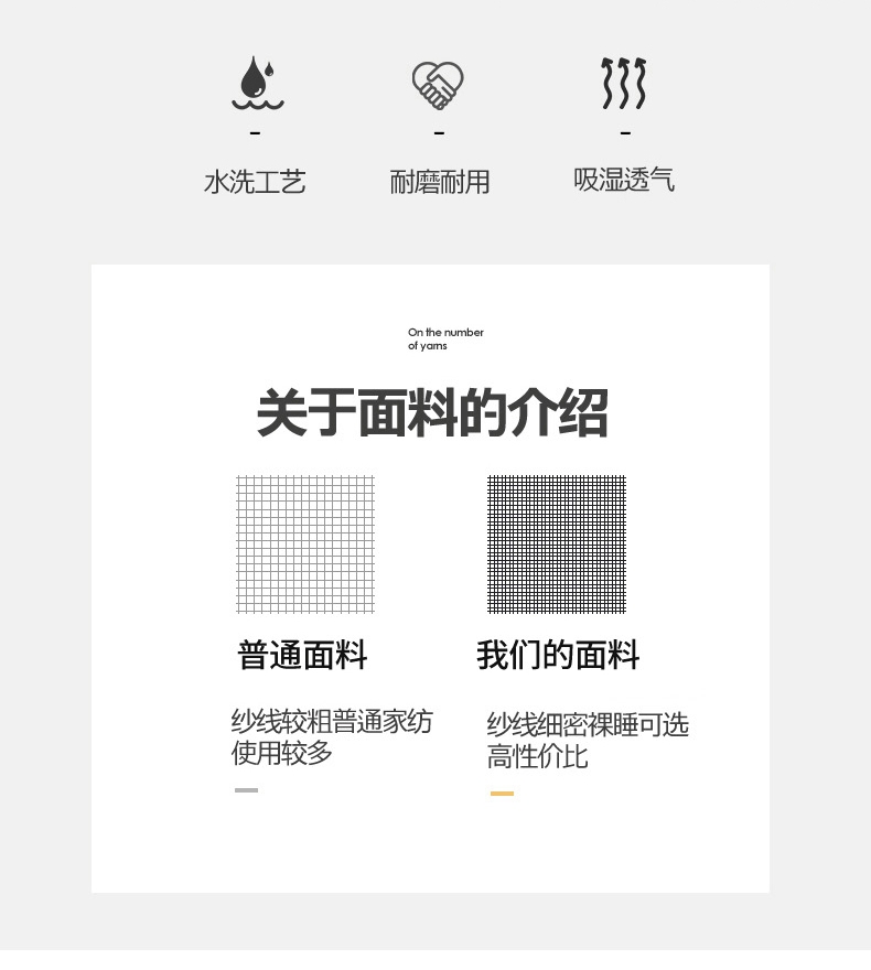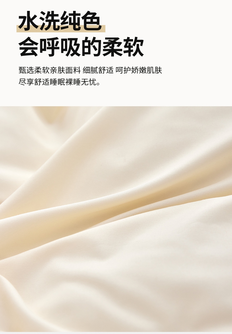 采用生态抗菌水洗棉面料,柔软亲肤;面料细腻顺滑,裸睡安心,四季可用。;机洗不易褪色、不起球,居家睡眠更舒适。