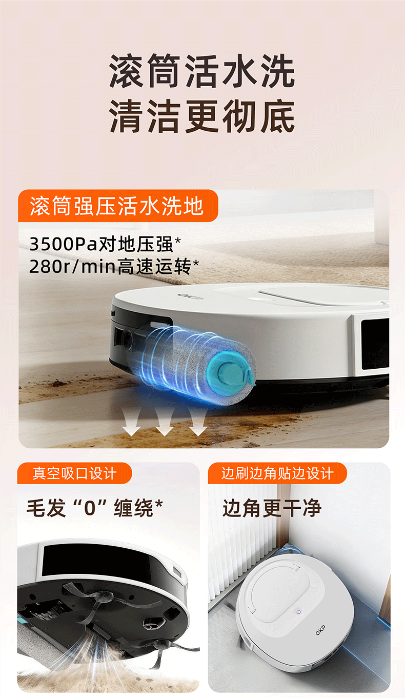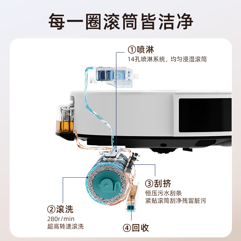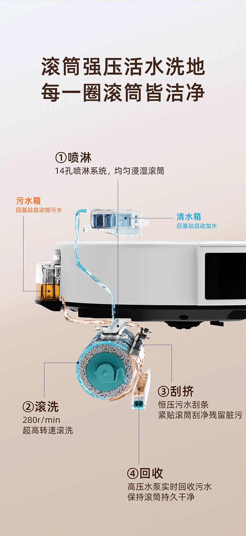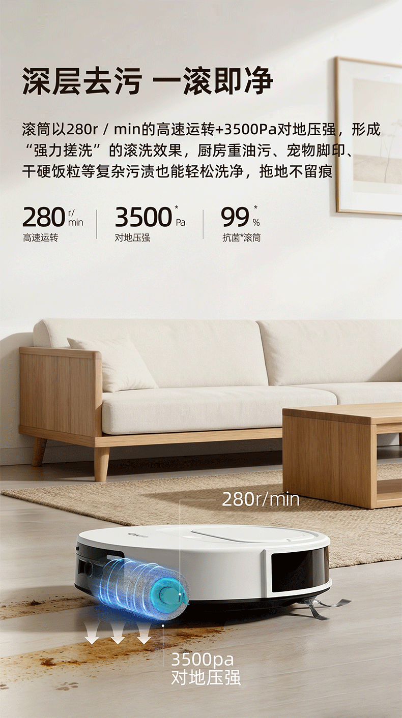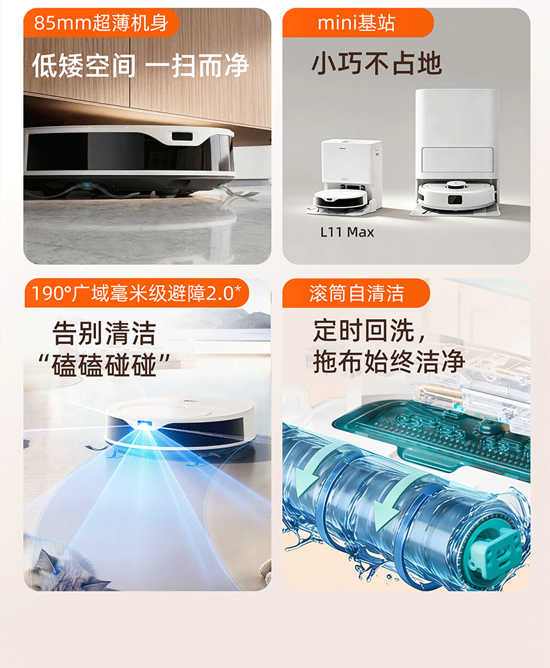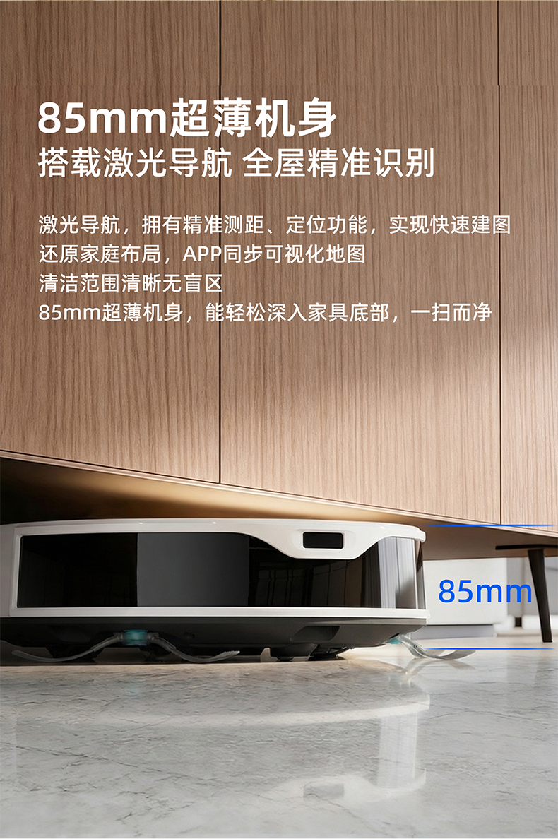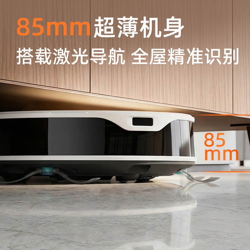 ToF激光导航 + PSD 毫米级避障,精准建图;4000Pa 大吸力 + 真空无滚刷设计,彻底告别;活水滚筒196mm拖地,顽固污渍一滚而净;85mm 超薄机身,深入低矮空间无死角;滚筒自清洁基站,自然风干滚筒