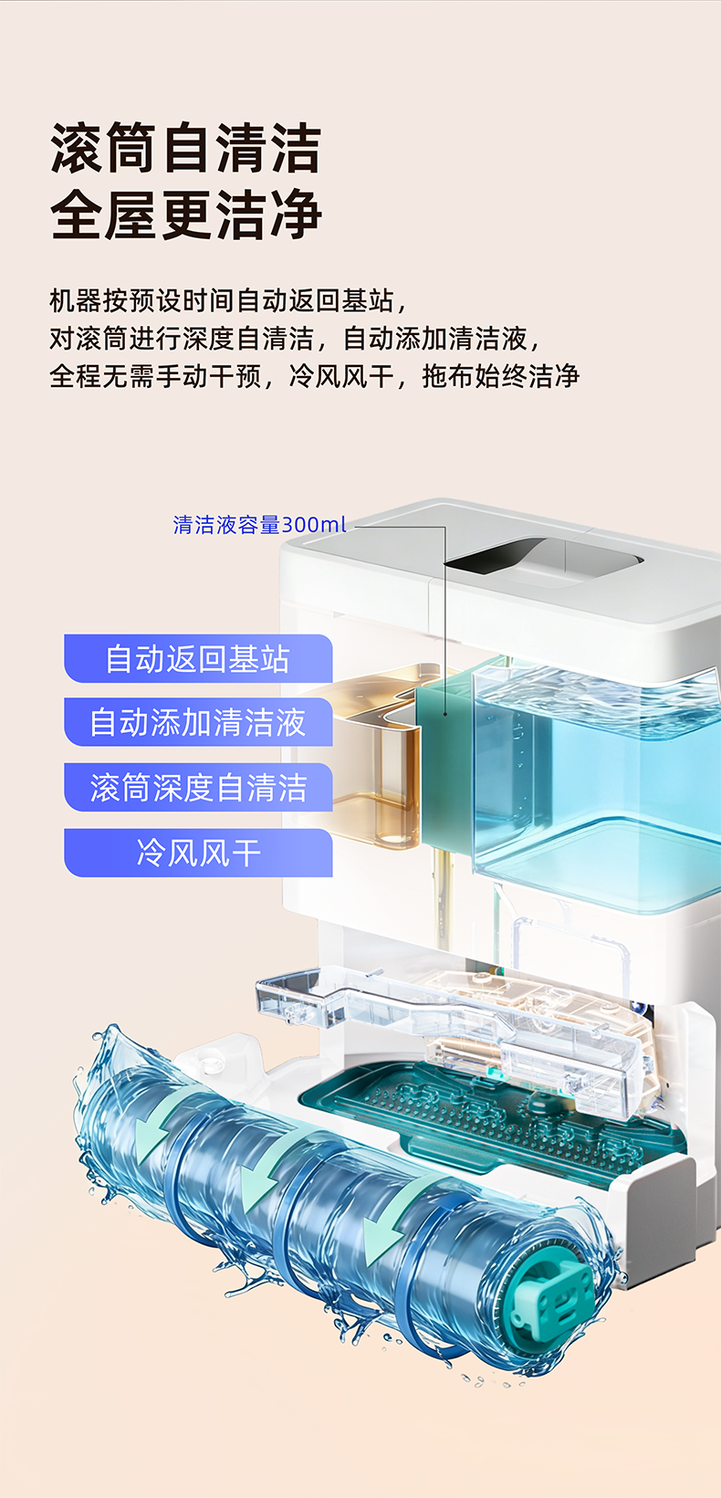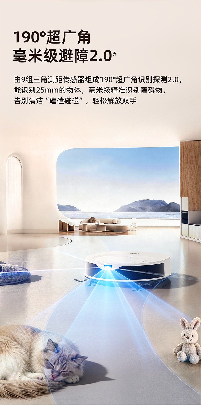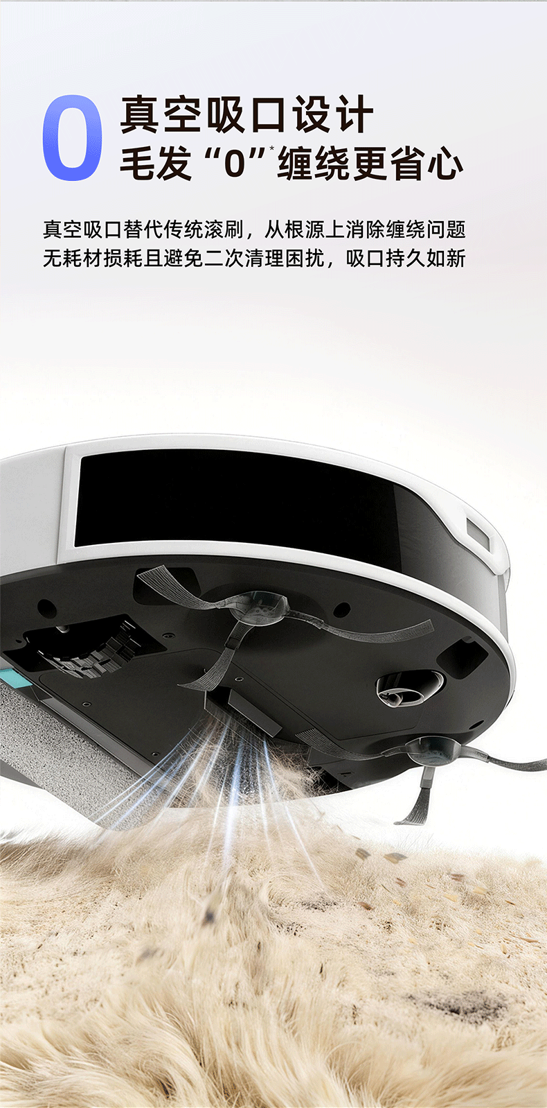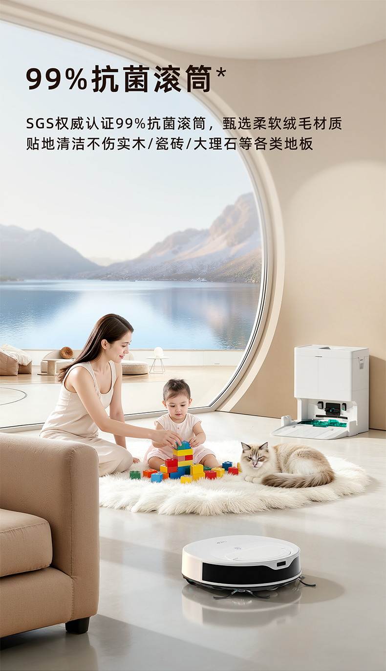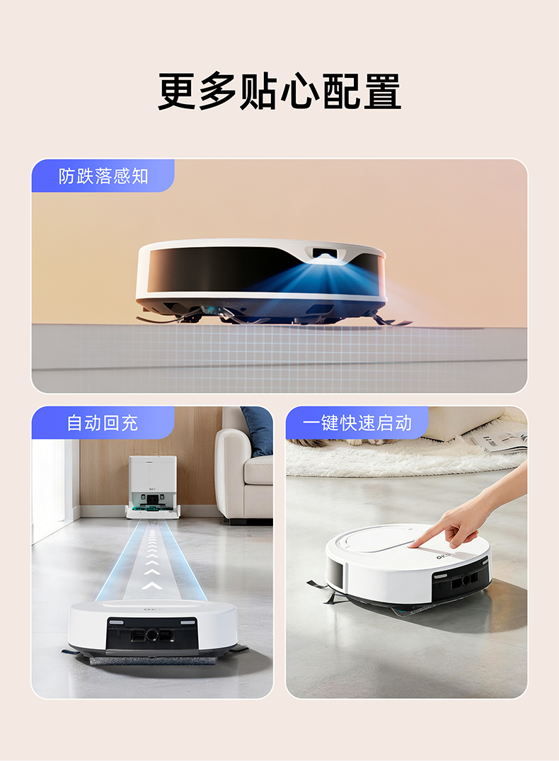ToF激光导航 + PSD 毫米级避障,精准建图;4000Pa 大吸力 + 真空无滚刷设计,彻底告别;活水滚筒196mm拖地,顽固污渍一滚而净;85mm 超薄机身,深入低矮空间无死角;滚筒自清洁基站,自然风干滚筒