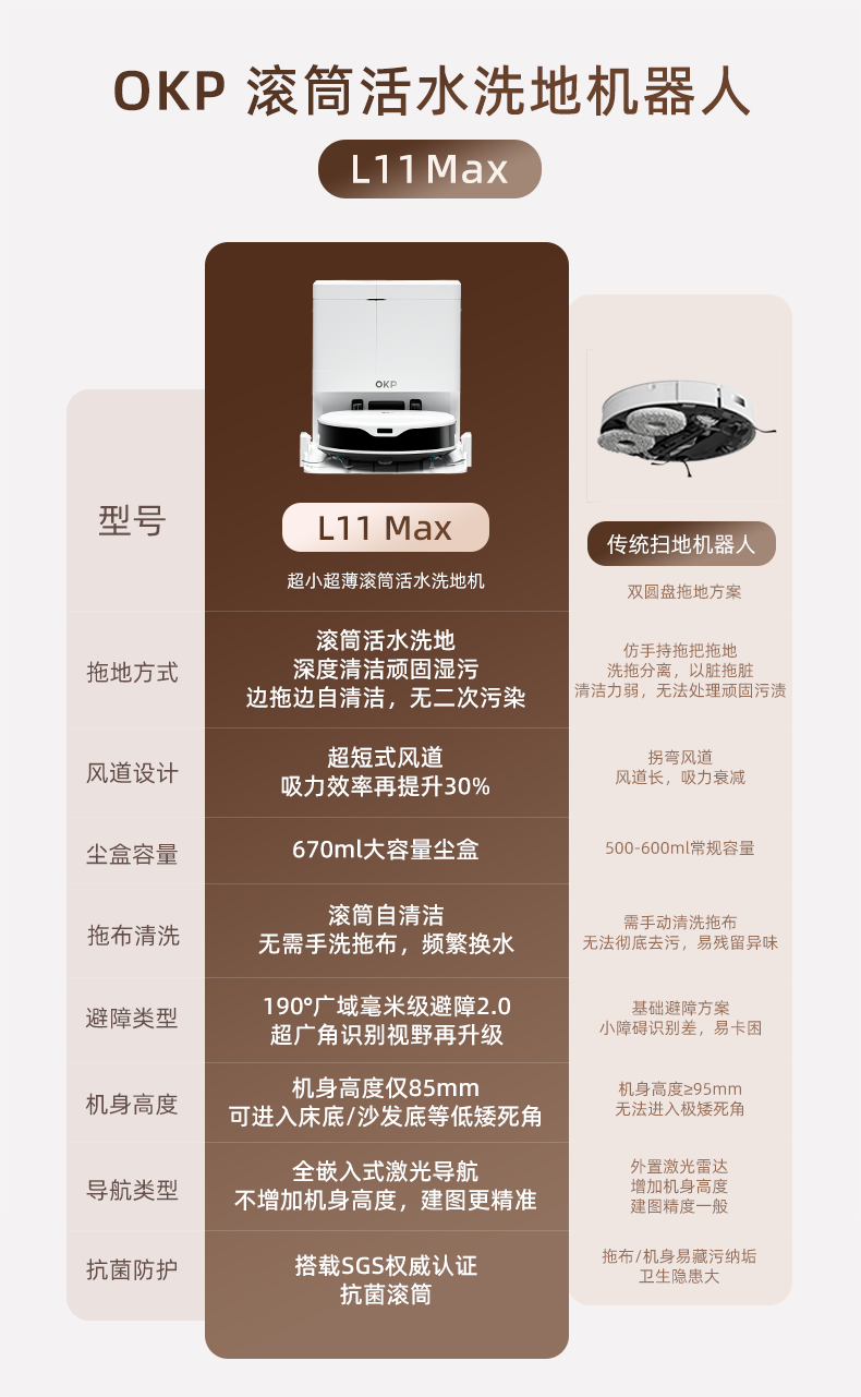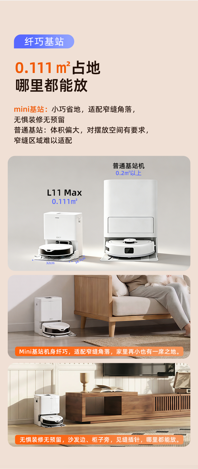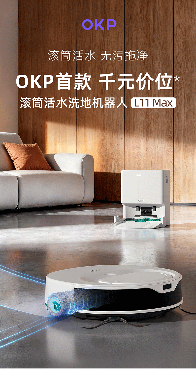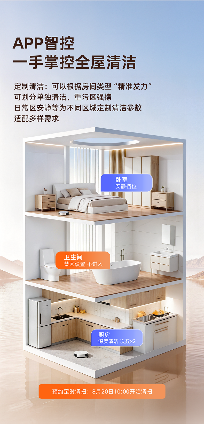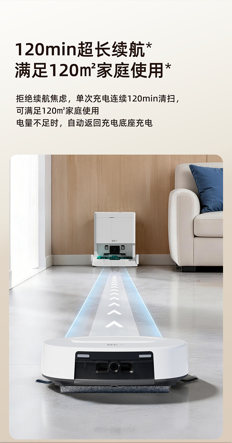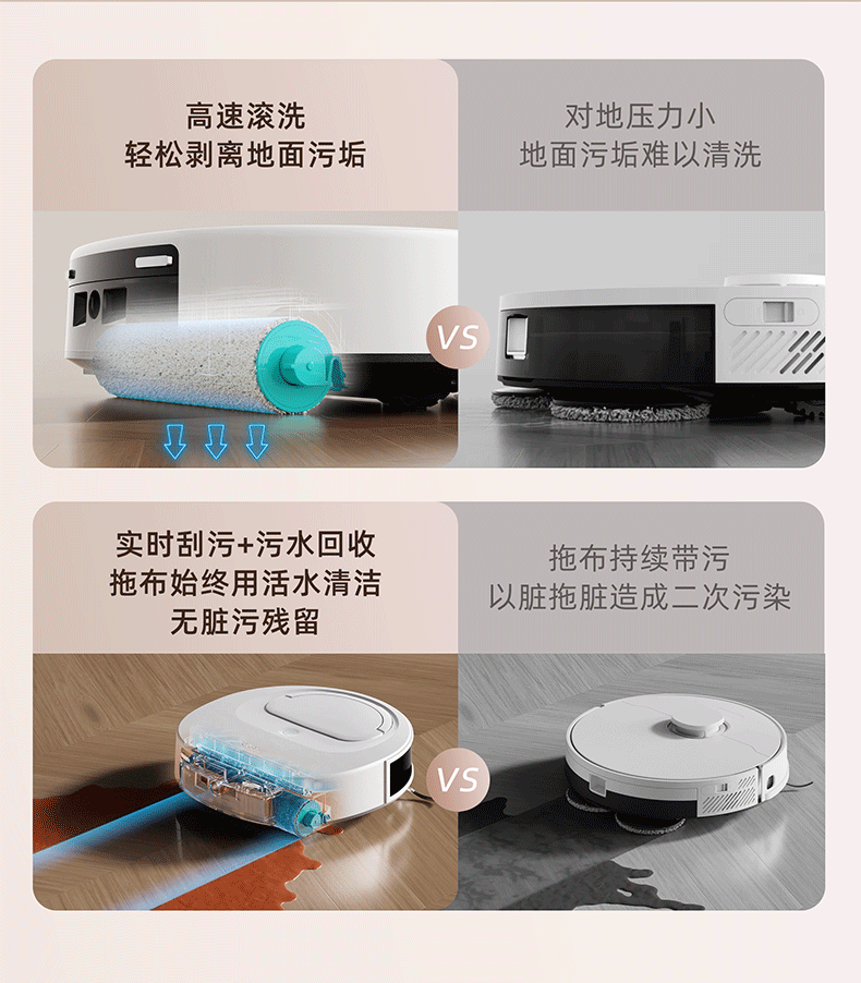 ToF激光导航 + PSD 毫米级避障,精准建图;4000Pa 大吸力 + 真空无滚刷设计,彻底告别;活水滚筒196mm拖地,顽固污渍一滚而净;85mm 超薄机身,深入低矮空间无死角;滚筒自清洁基站,自然风干滚筒