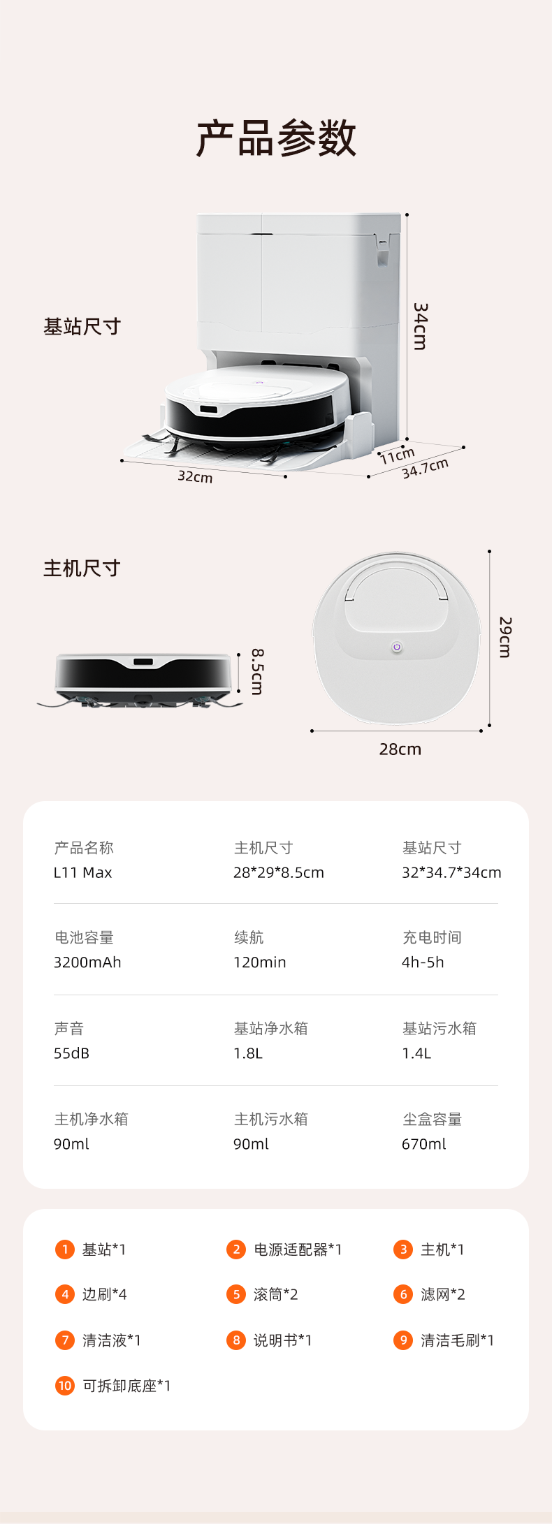 配置清单:基站 * 1 电源适配器 * 1 主机 * 1 边刷 * 4 滚筒 * 2 滤网 * 2 清洁液 * 1 说明书 * 1 清洁毛刷 * 1 可拆卸底座 * 1