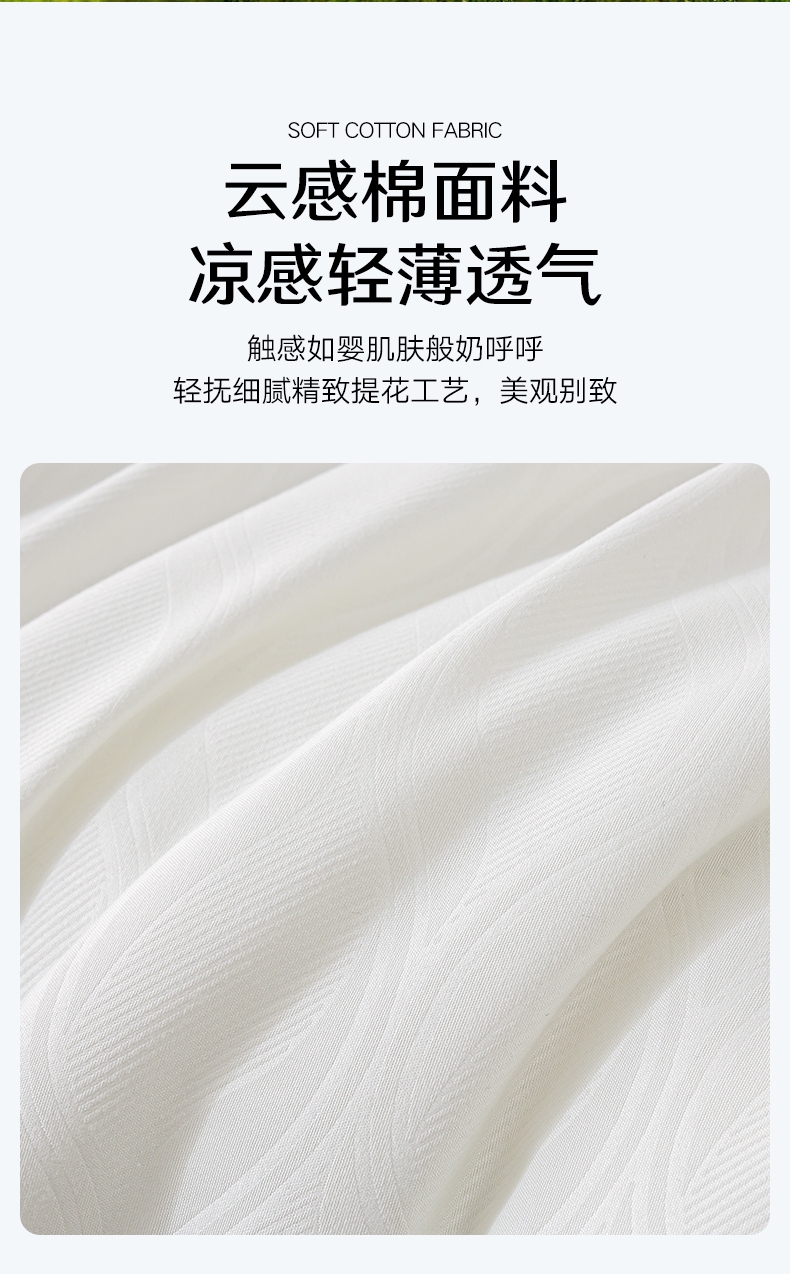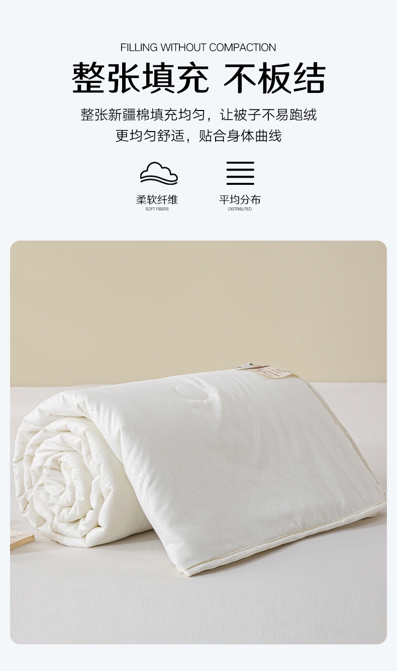 采用水洗提花面料作成的面料,亲肤舒适透气性强;新疆棉花填充,柔软舒适;活性印染工艺 高级感十足压花工