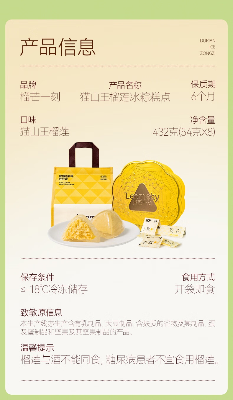 配置:猫山王榴莲冰粽54克*8枚*1盒 【含礼品袋】