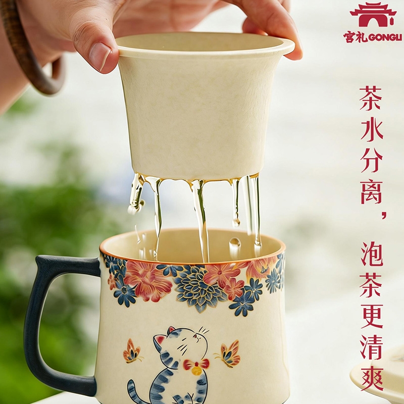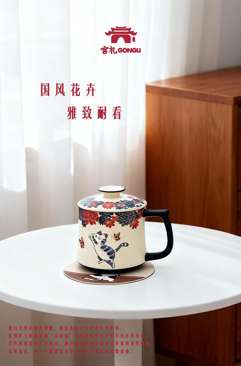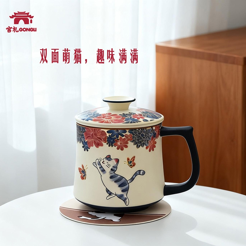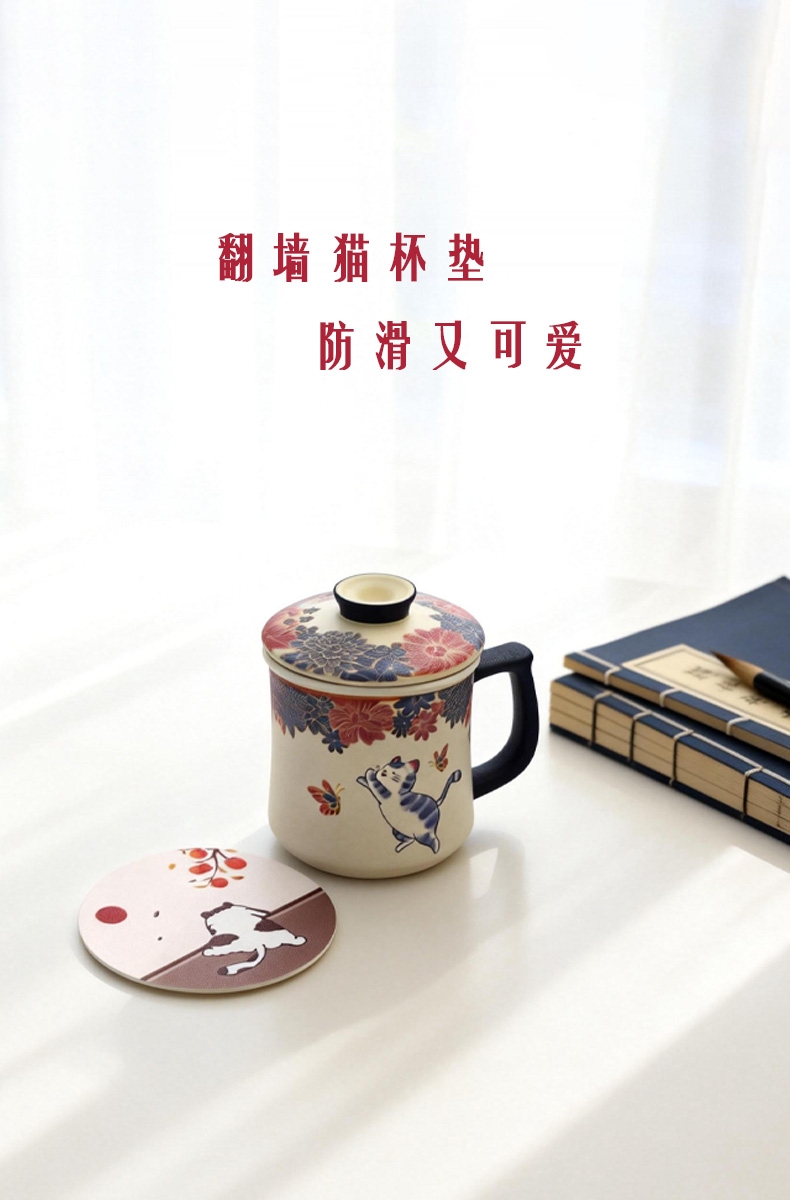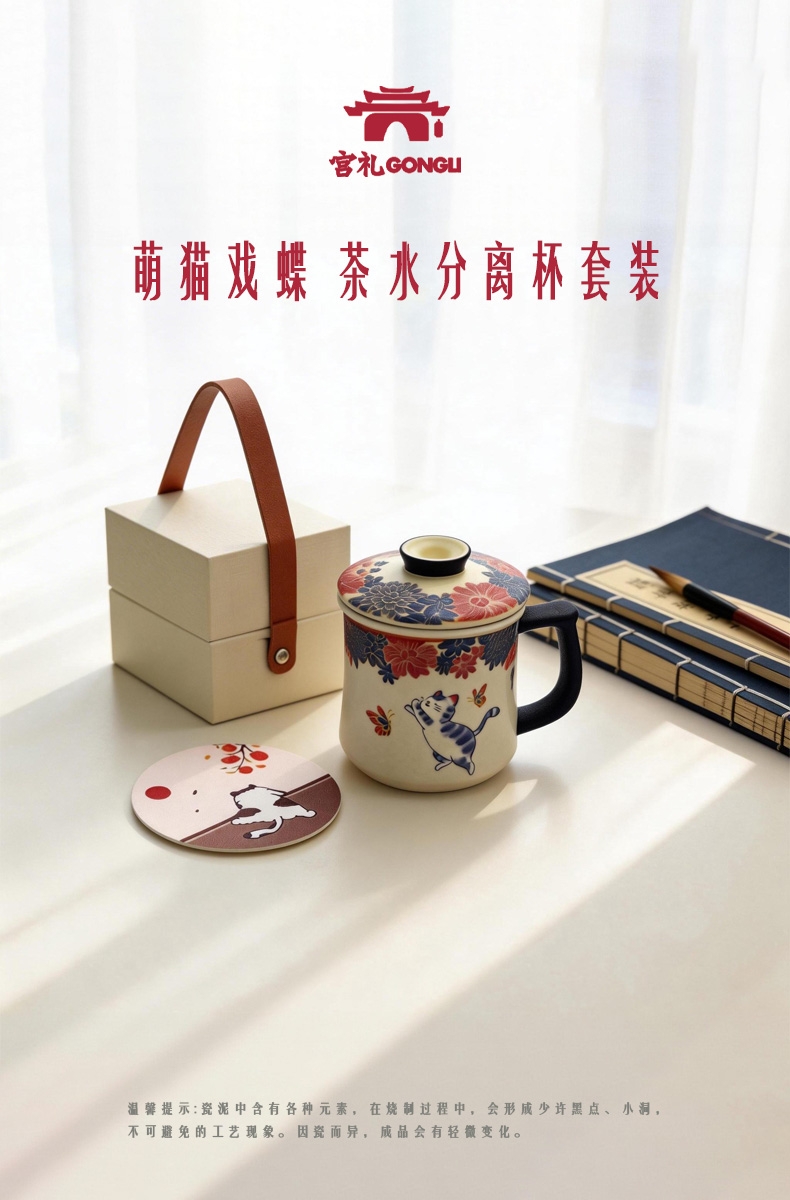 宫礼 萌猫戏蝶茶水分离杯皮革杯垫套装