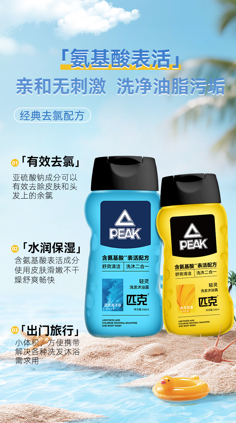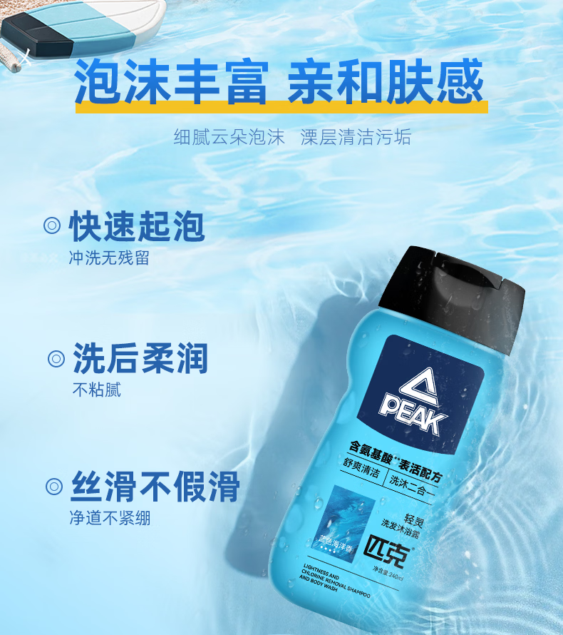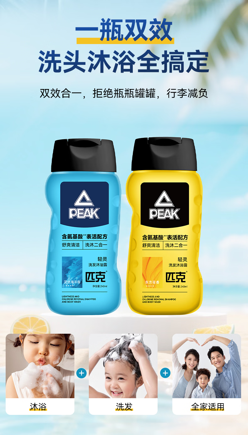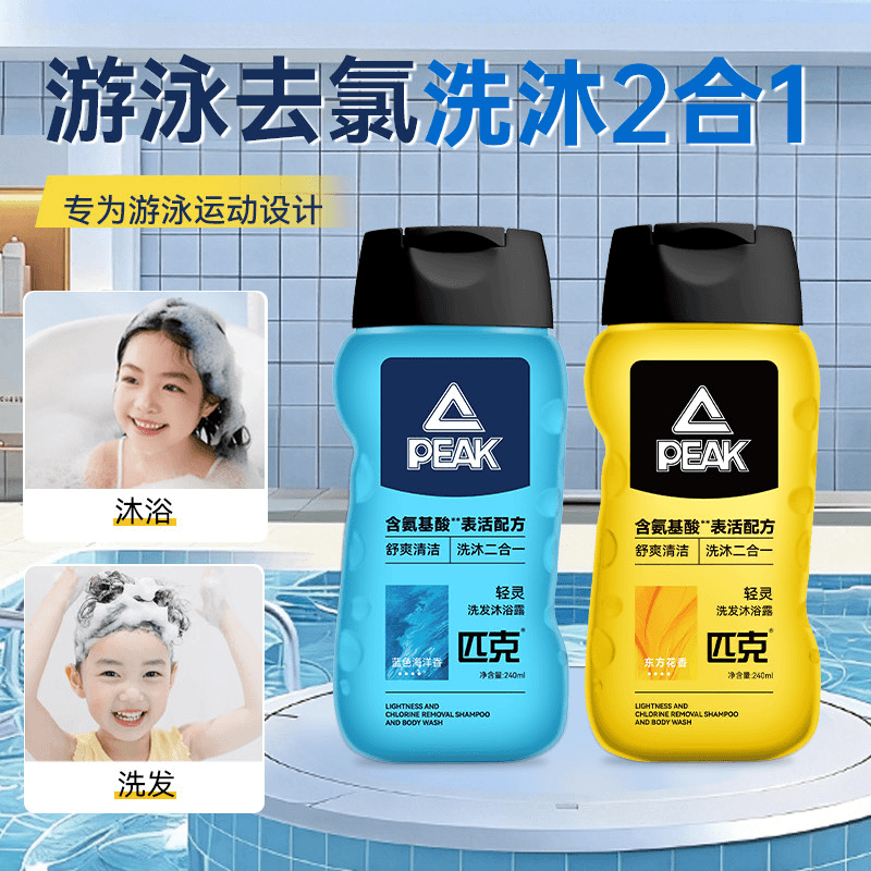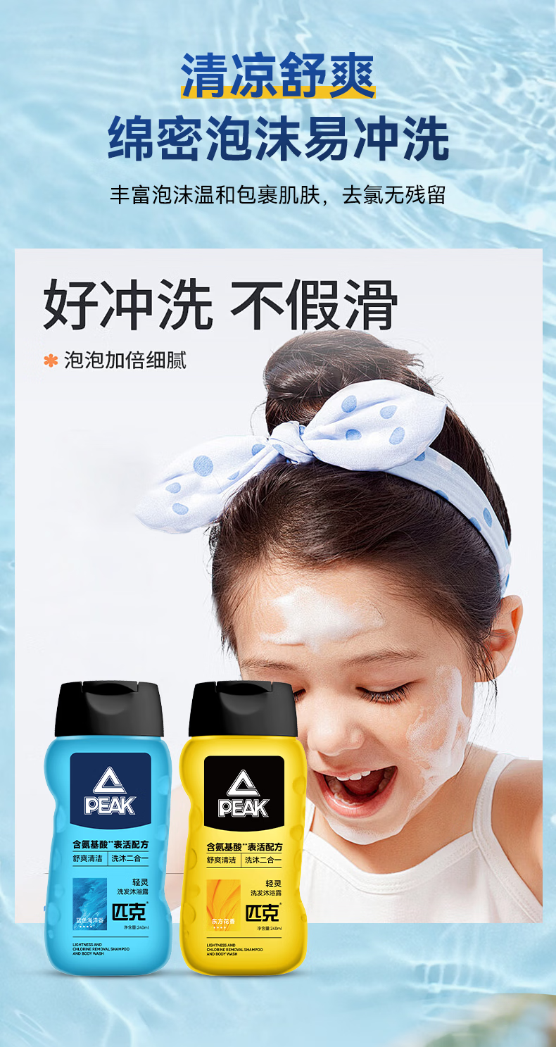 洗发沐浴二合一,全家都能用(强调儿童也能用);舒缓锁水、保湿专利成分,肌肤清爽不干燥;氨基酸配方专为游泳设计,温和净澈有效去氯不伤肤