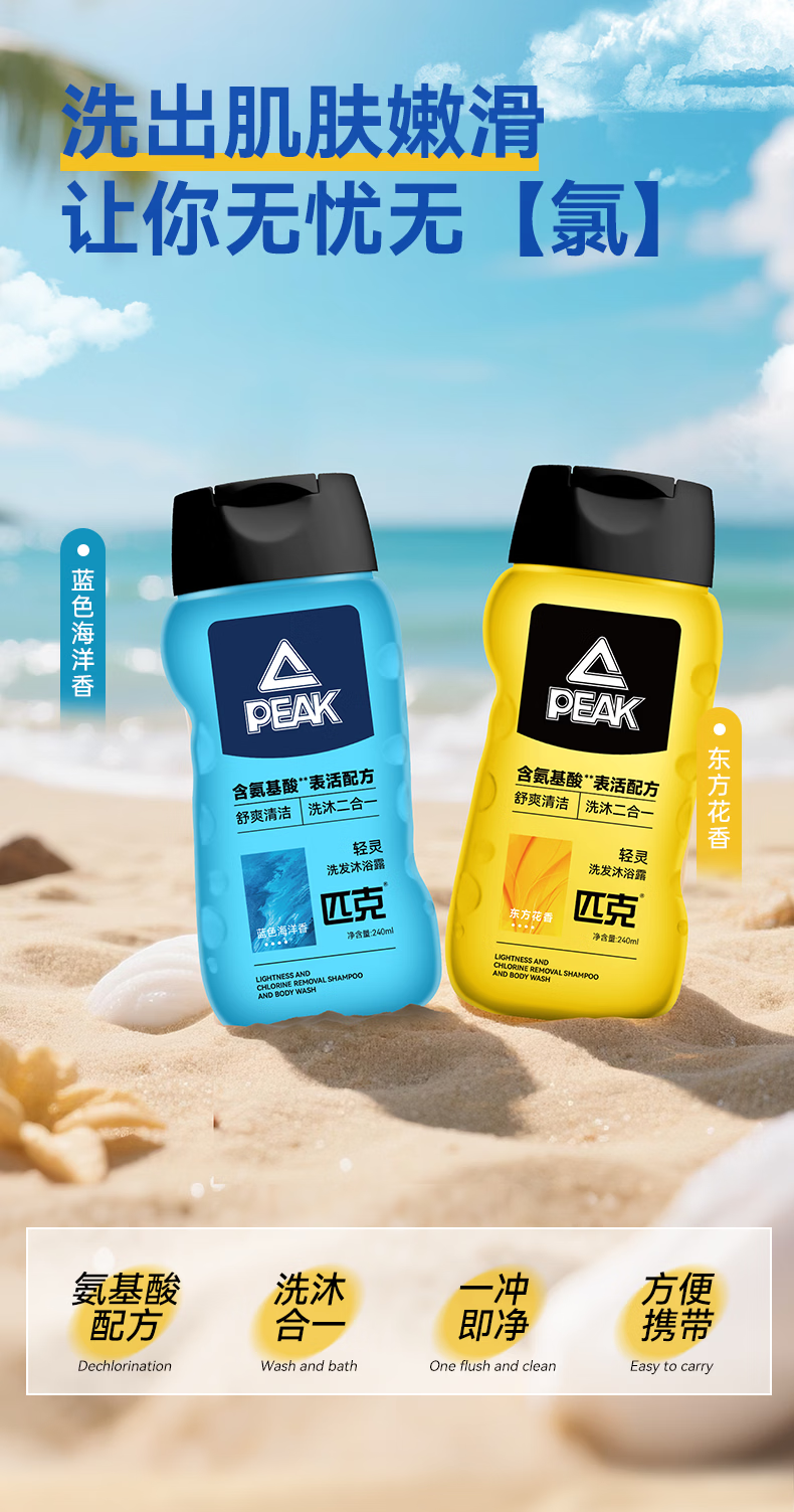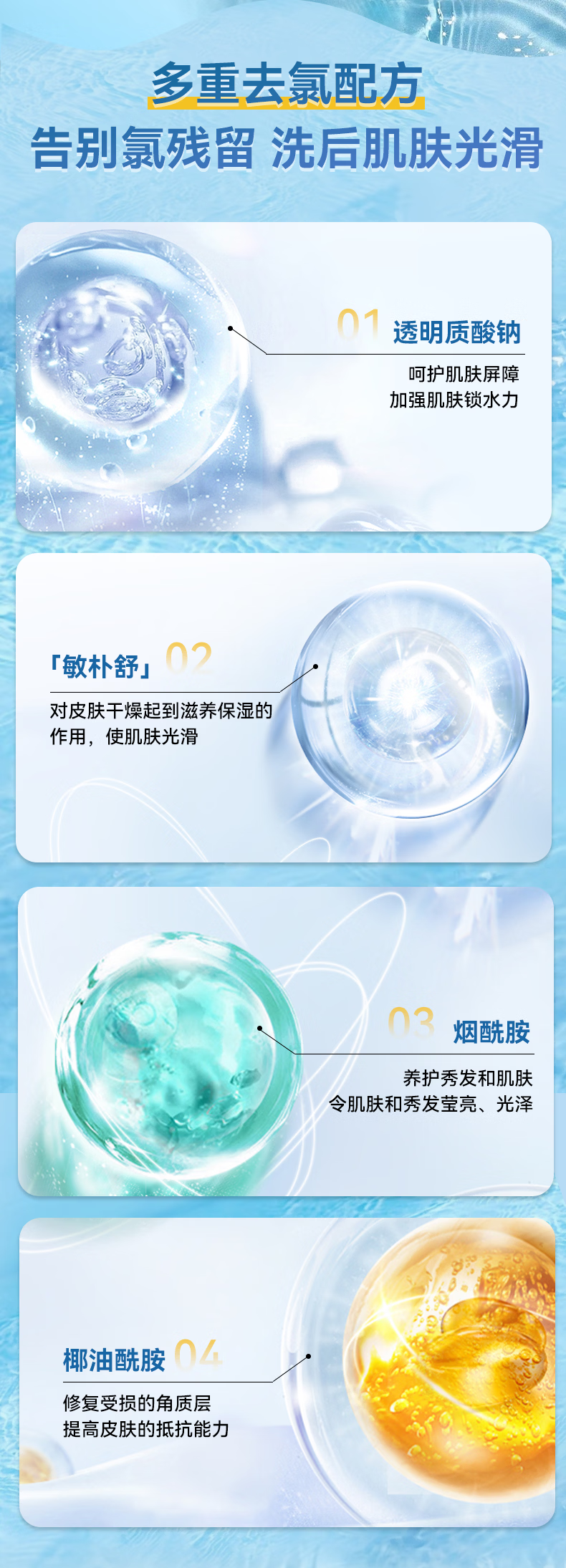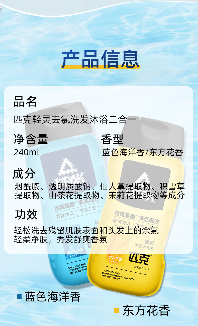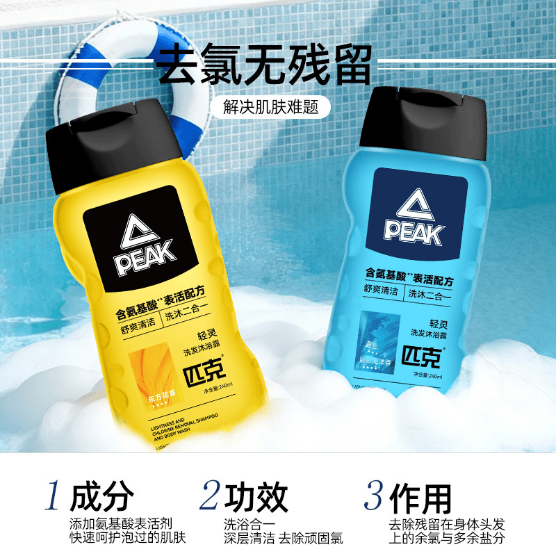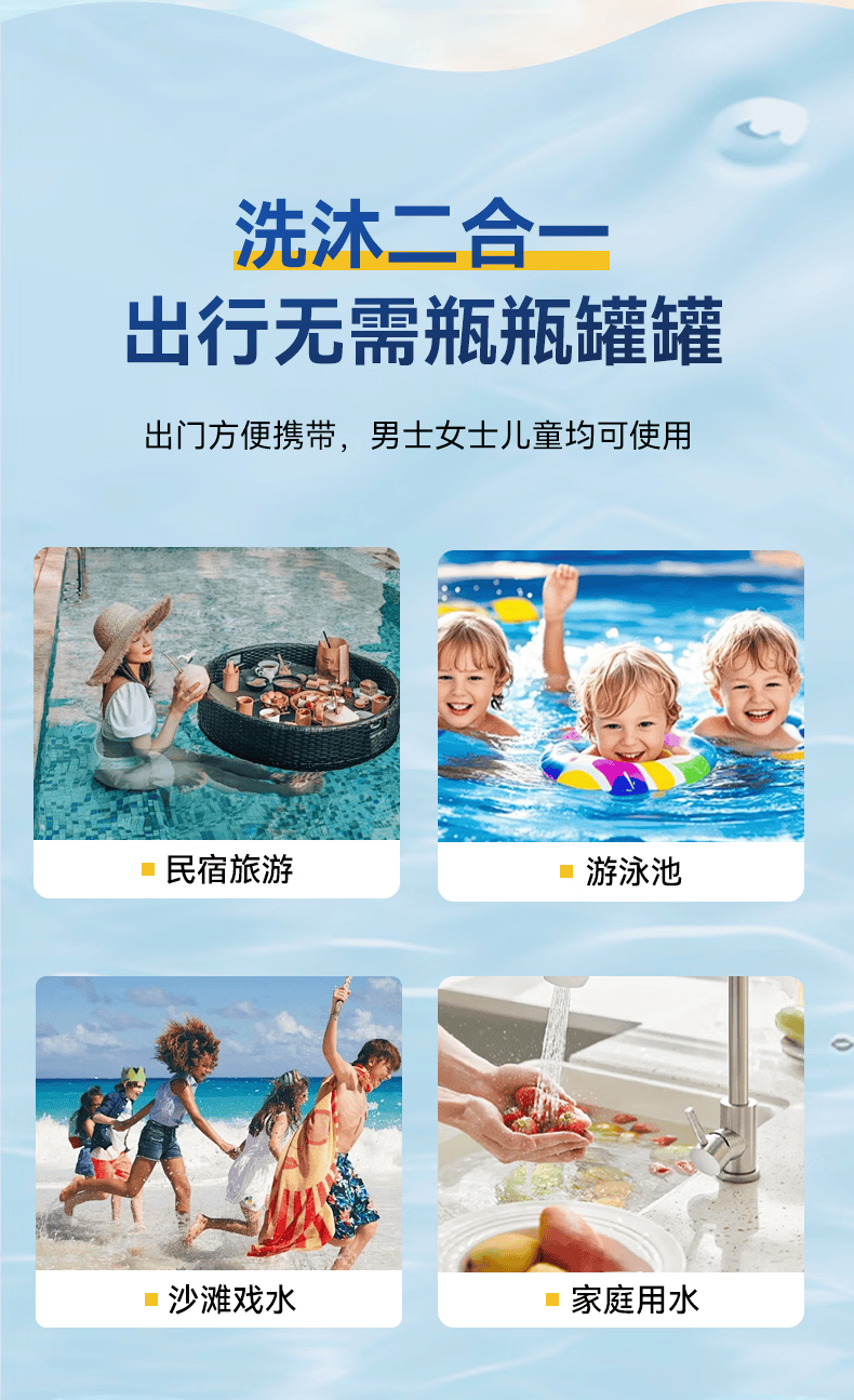 洗发沐浴二合一,全家都能用(强调儿童也能用);舒缓锁水、保湿专利成分,肌肤清爽不干燥;氨基酸配方专为游泳设计,温和净澈有效去氯不伤肤