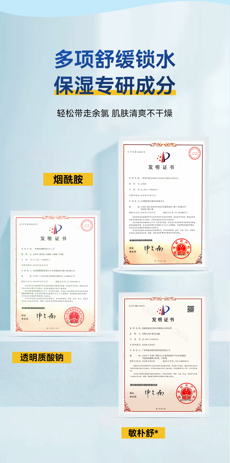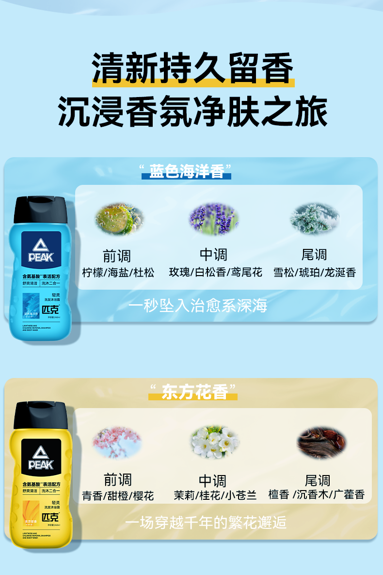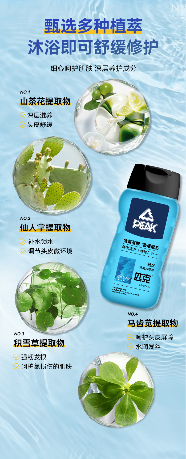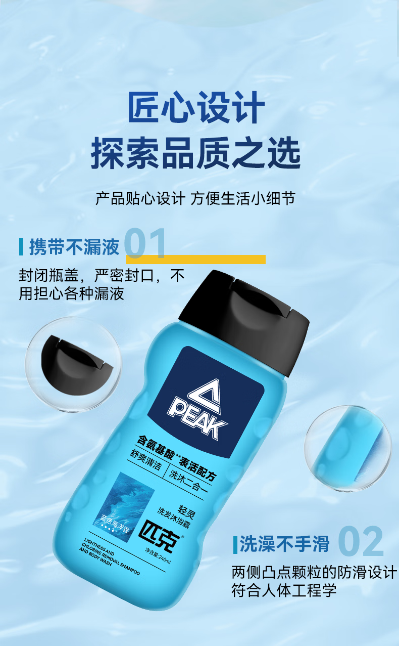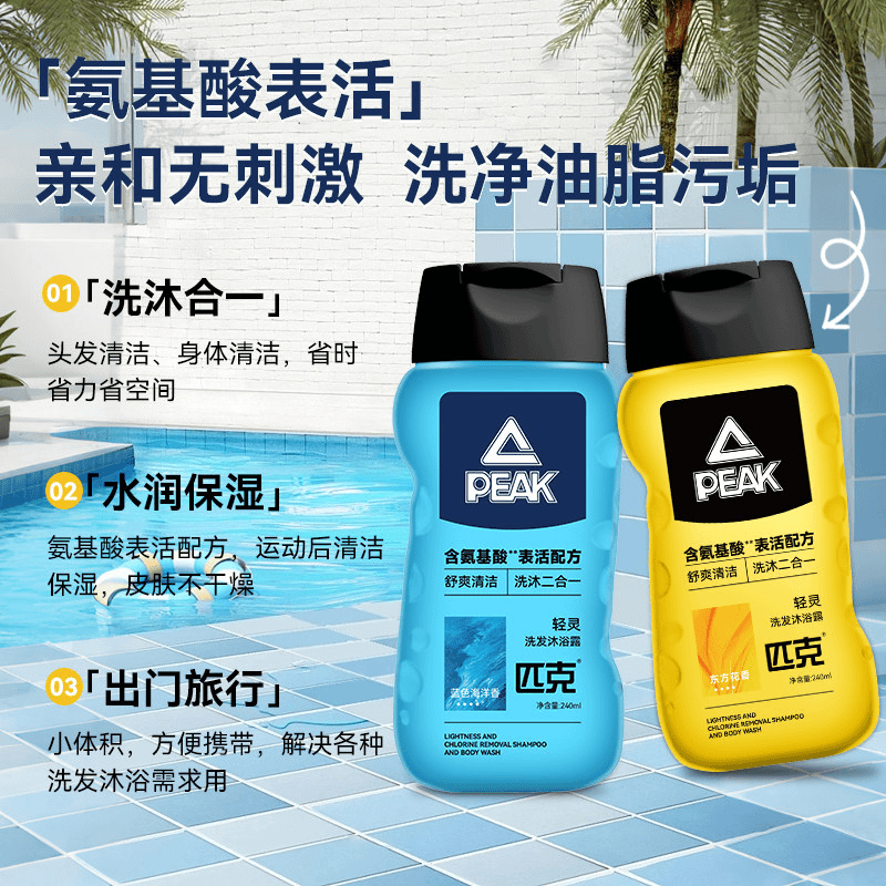 洗发沐浴二合一,全家都能用(强调儿童也能用);舒缓锁水、保湿专利成分,肌肤清爽不干燥;氨基酸配方专为游泳设计,温和净澈有效去氯不伤肤