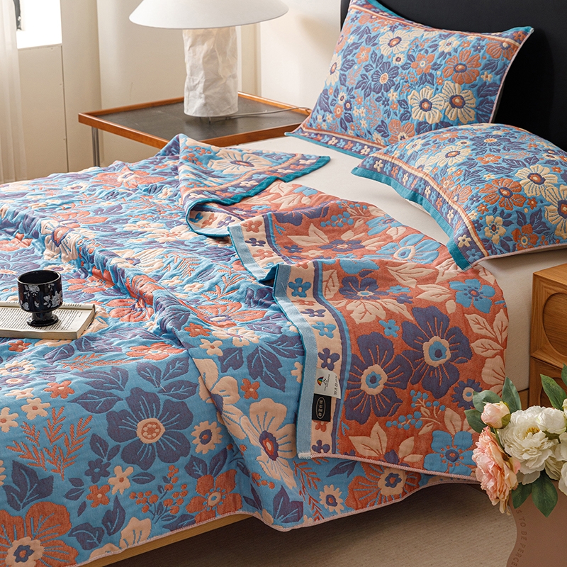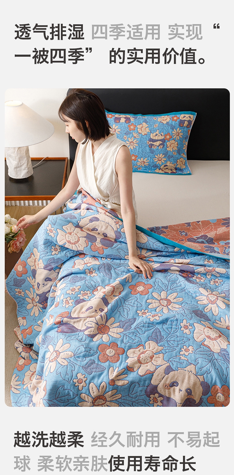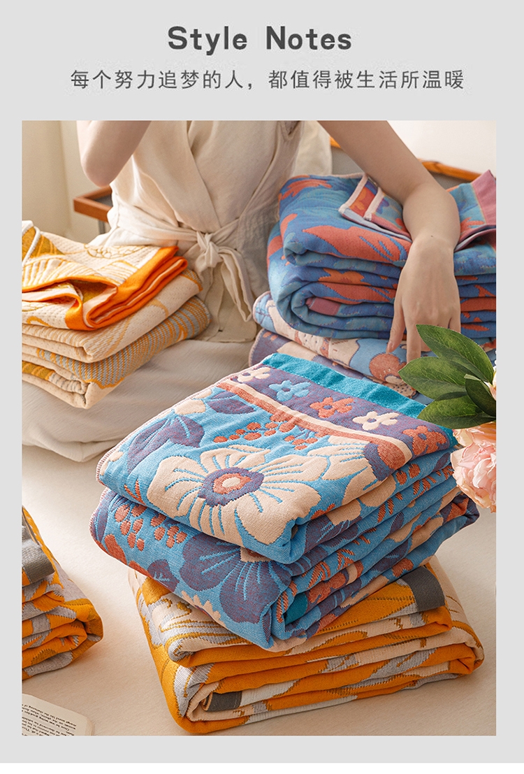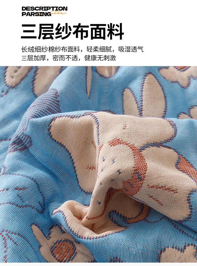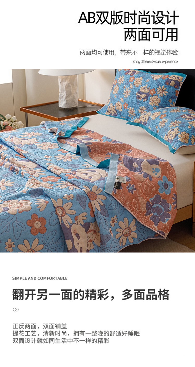 产品采用长绒细纱,纱布内层夹棉,更加绵软亲肤透气;;色织提花工艺,环保植物染料,先染色再织不掉色;AB双版时尚设计,两面可用,带来不一样的视觉体验