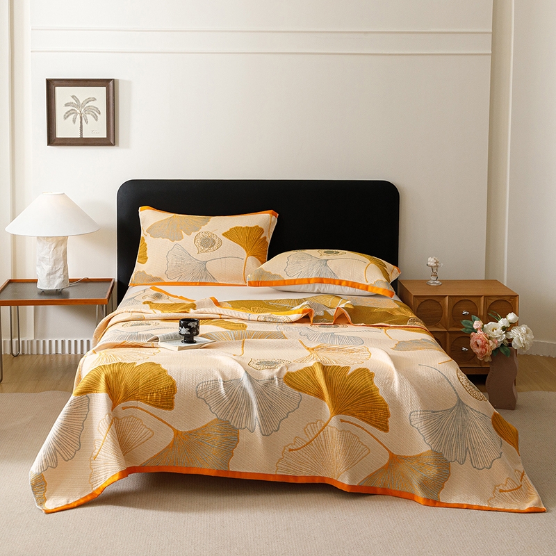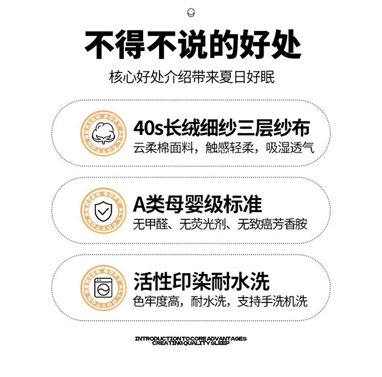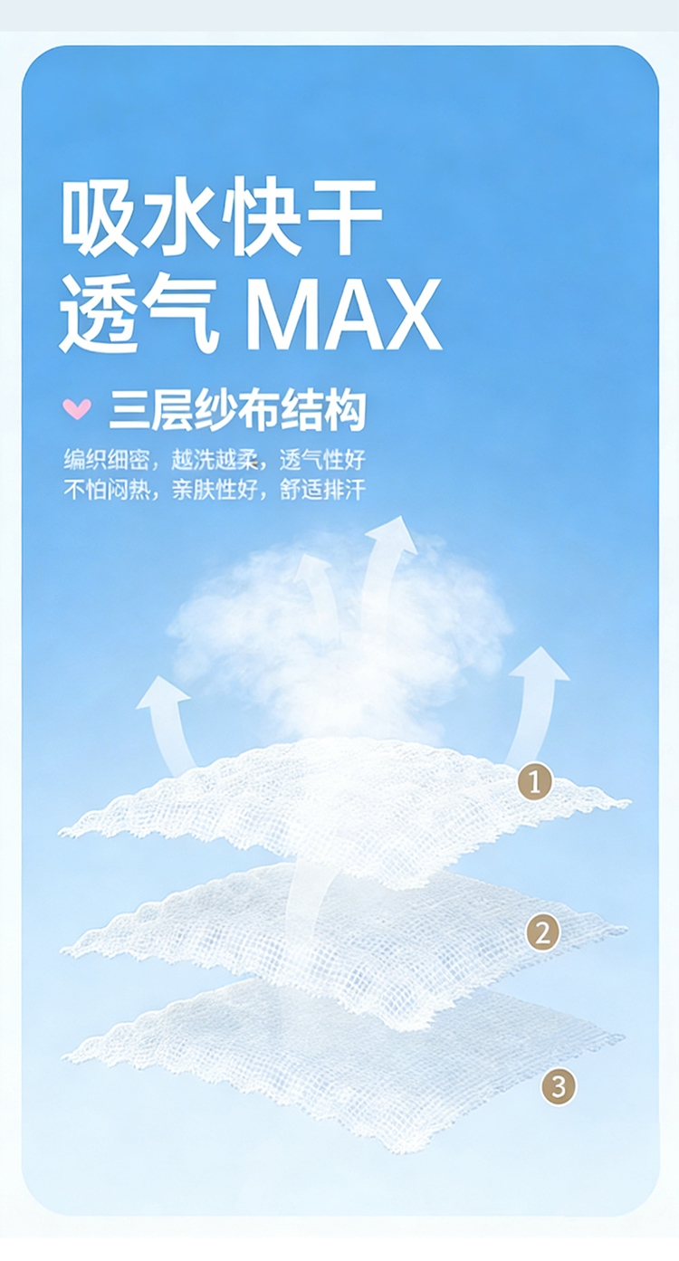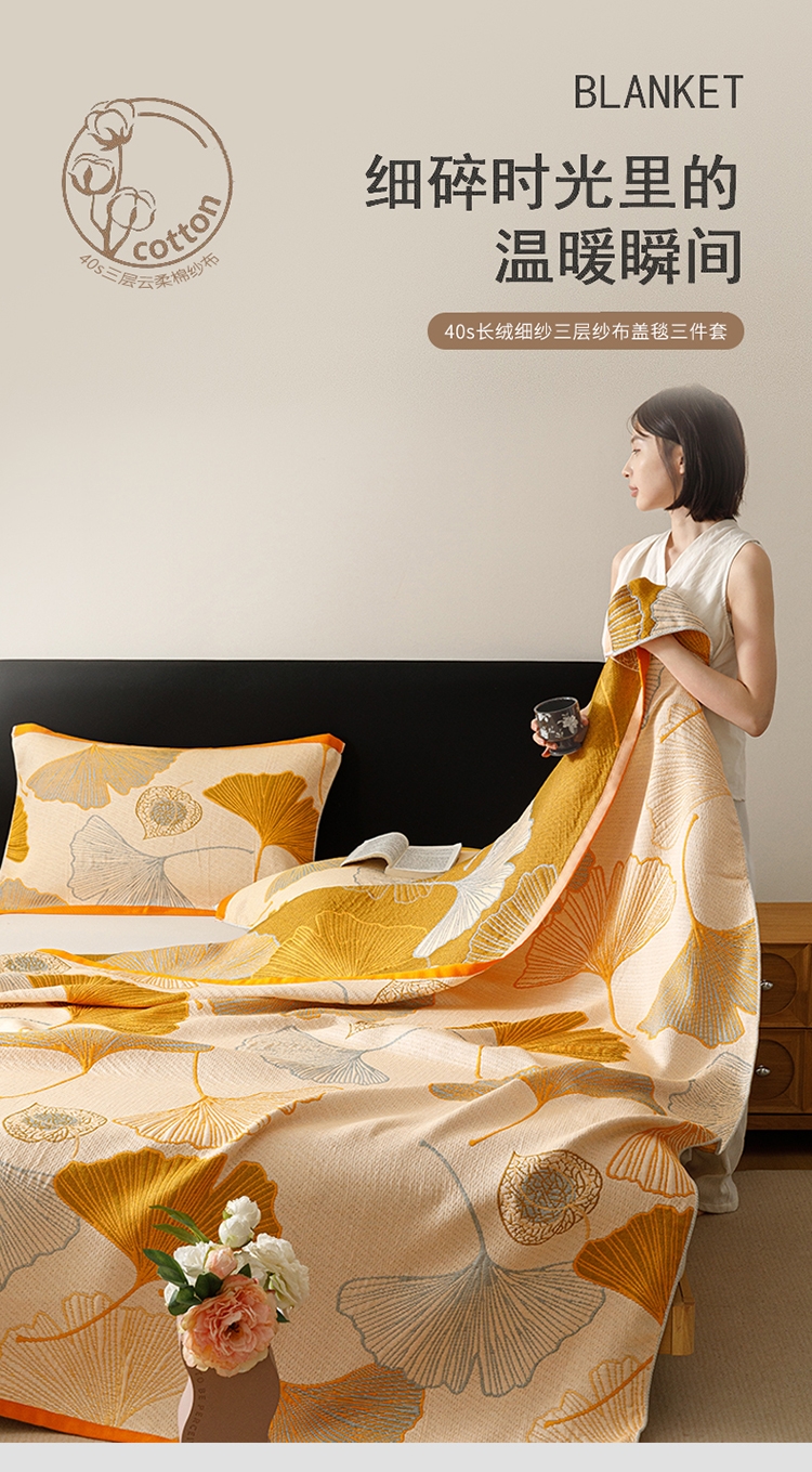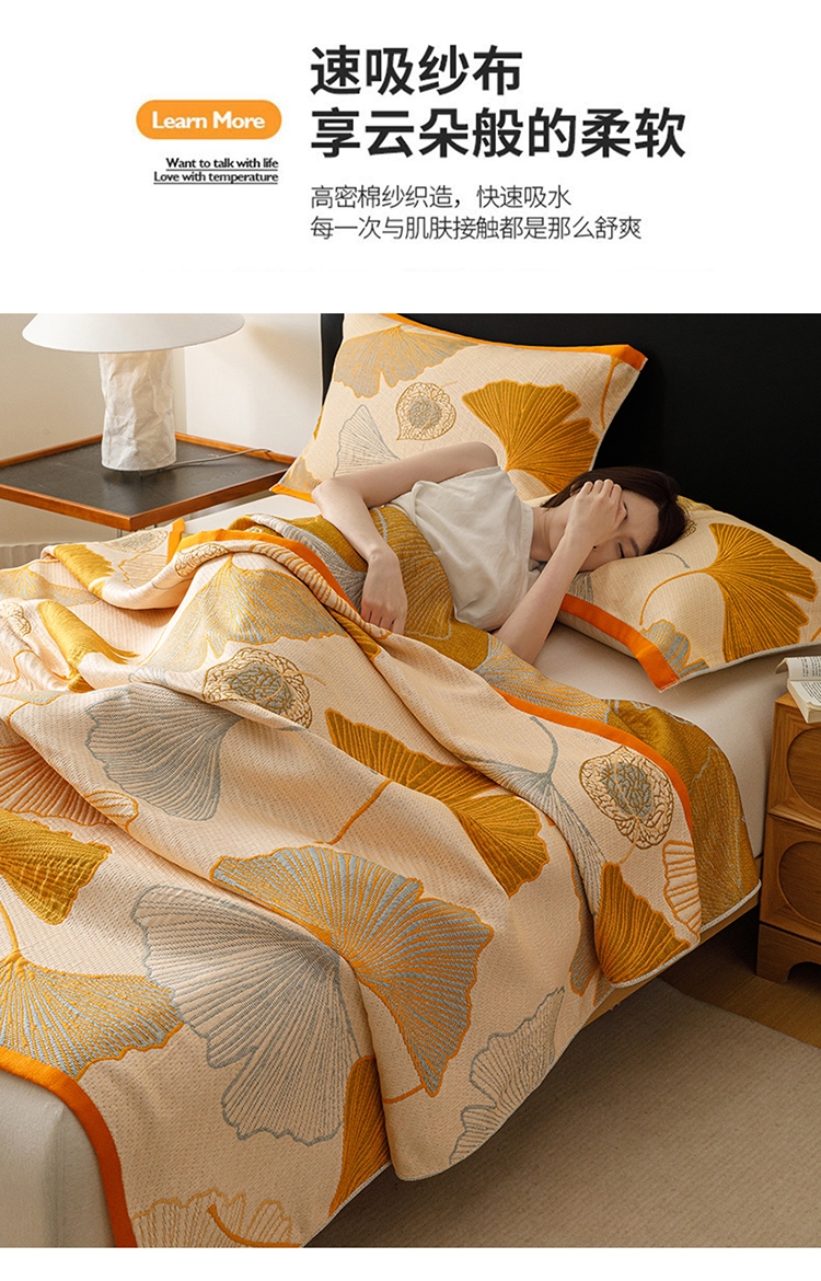 产品采用长绒细纱,纱布内层夹棉,更加绵软亲肤透气;;色织提花工艺,环保植物染料,先染色再织不掉色;AB双版时尚设计,两面可用,带来不一样的视觉体验