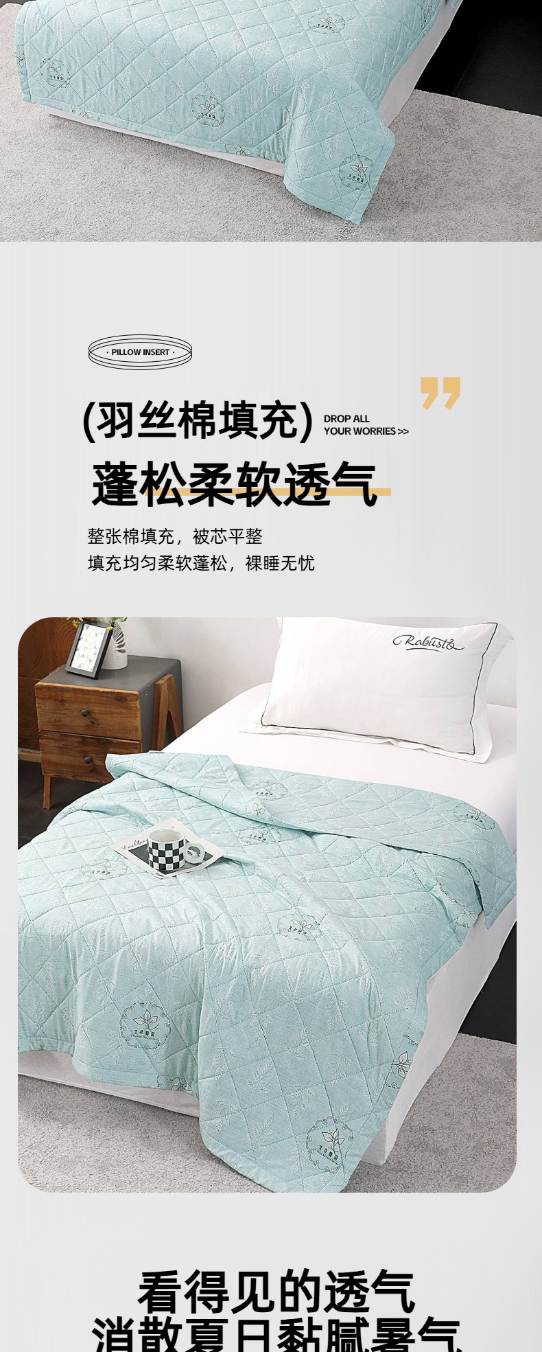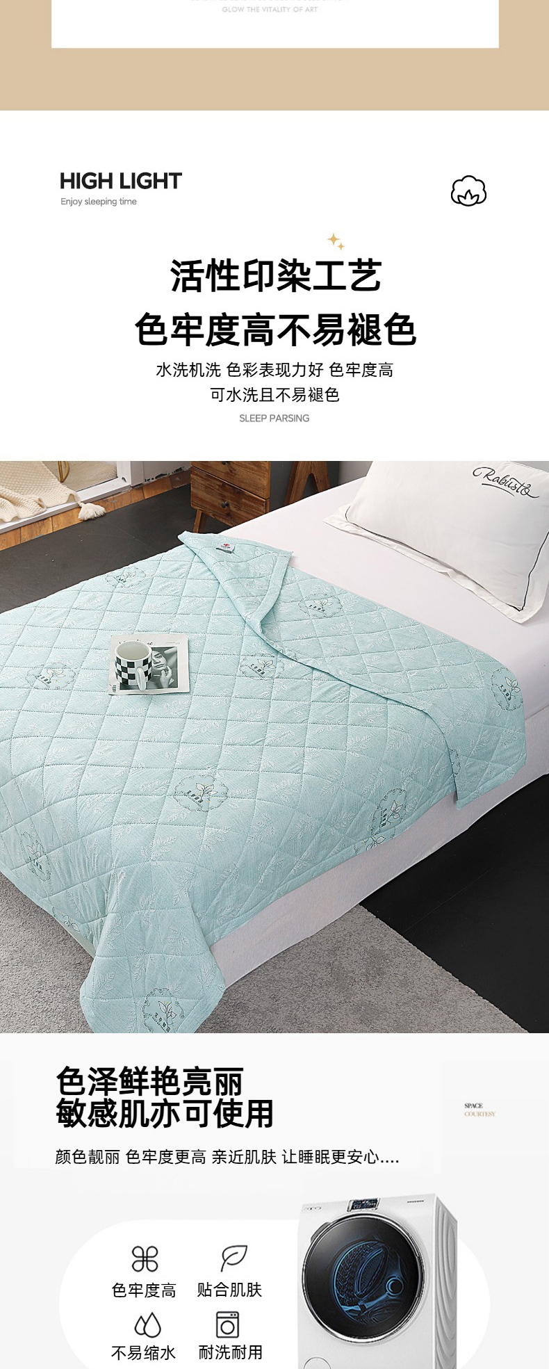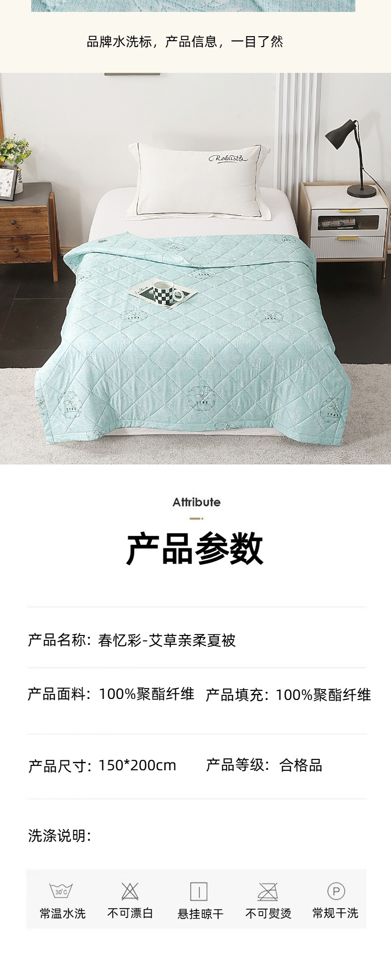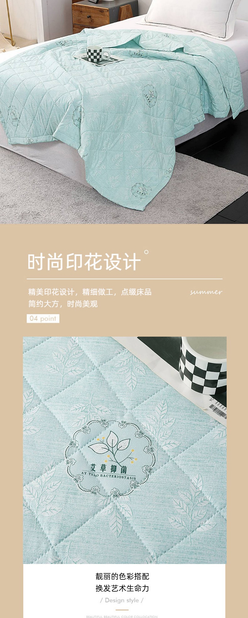 甄选水洗棉面料,贴身亲肤不闷热;手感细腻,采用环保印染工艺;添加艾草助剂,健康环保,夏日睡眠更舒心。
