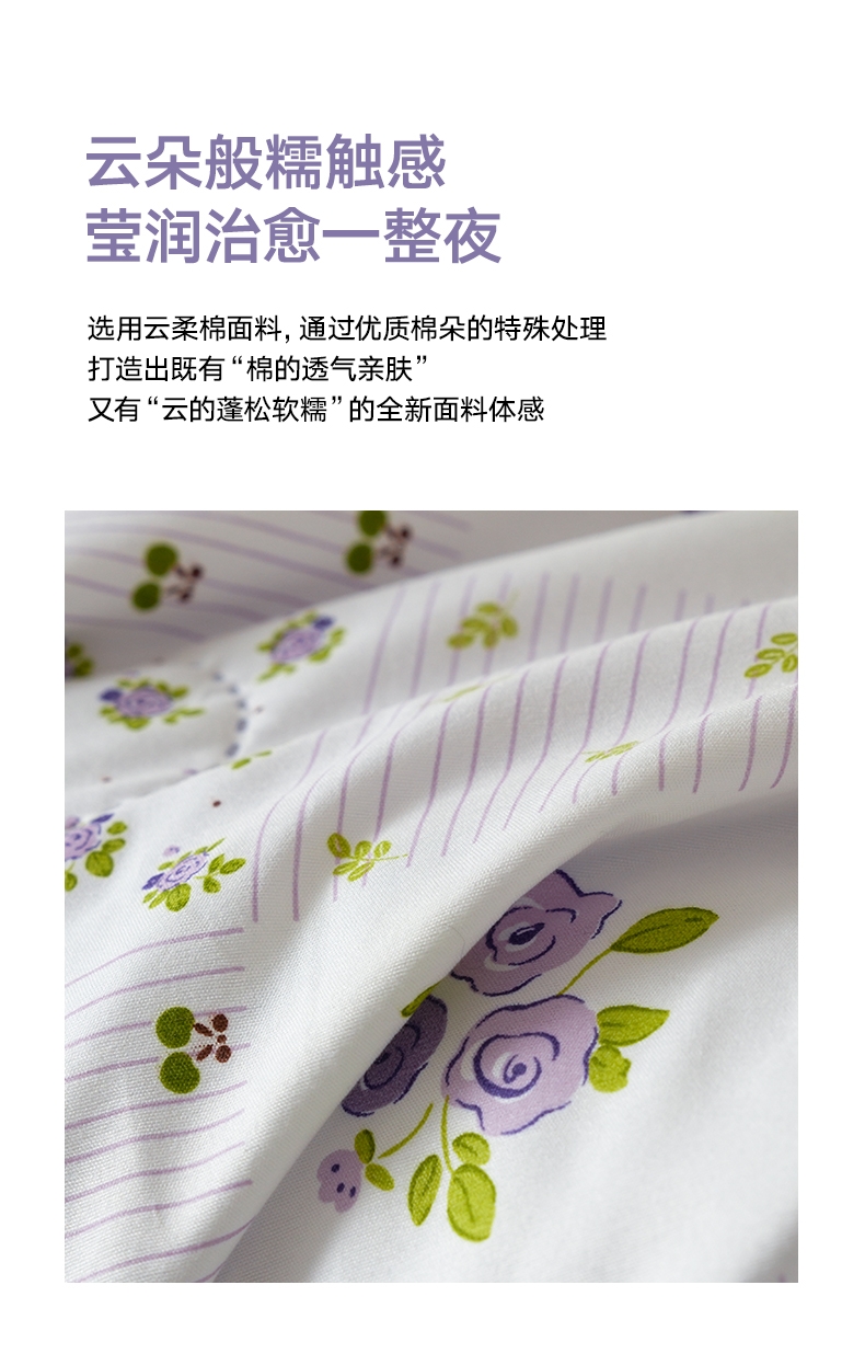 采用柔软舒适的云柔棉制作成的面料,亲肤舒适透气性强;优质薄荷纤维,植物萃取 温和不刺激 柔软亲肤 导湿;活性印染工艺 高级感十足压花工艺