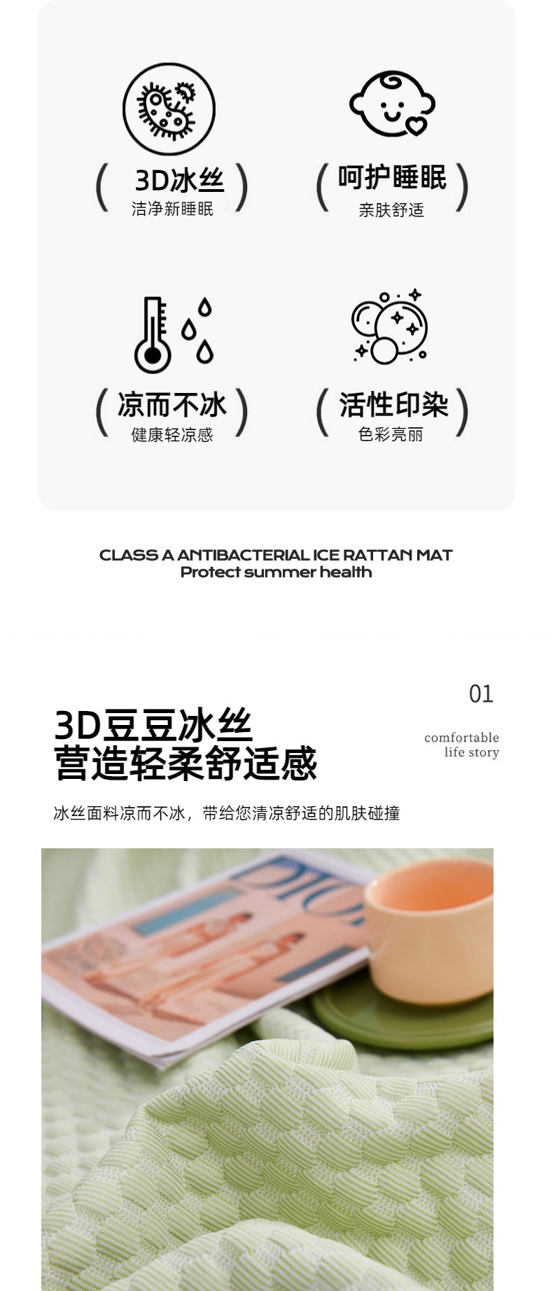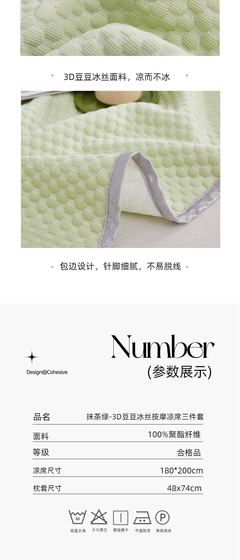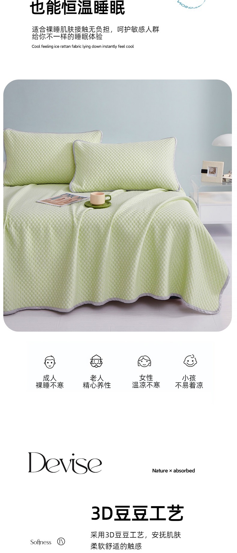 凉而不冰,吸湿透气;;优雅大气花纹,彰显品质;柔软不夹发,席面光滑,清爽不沾身;