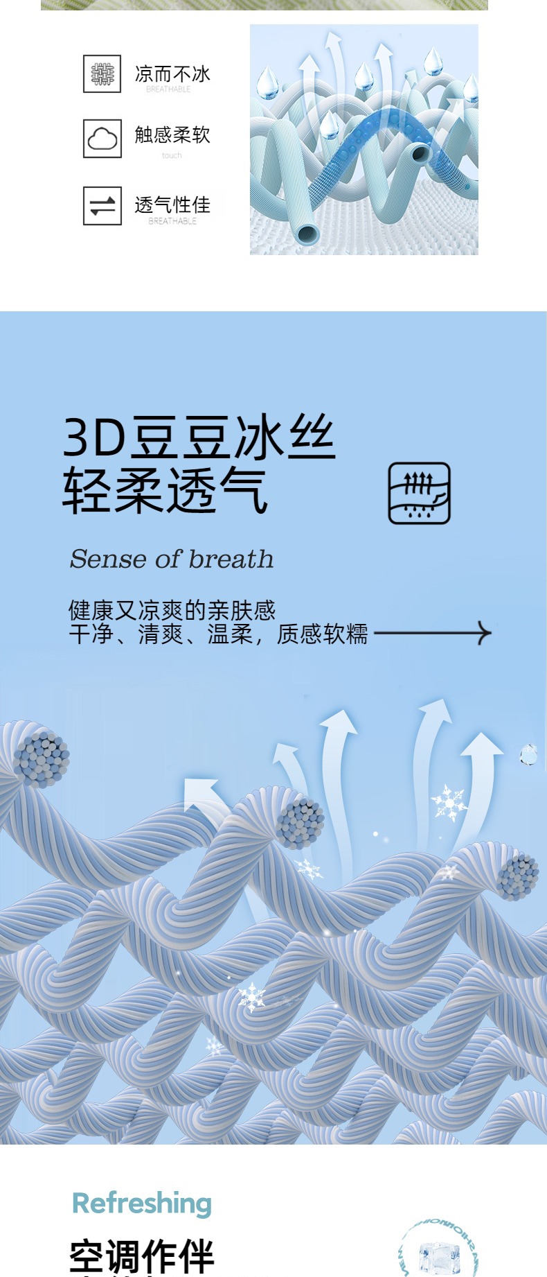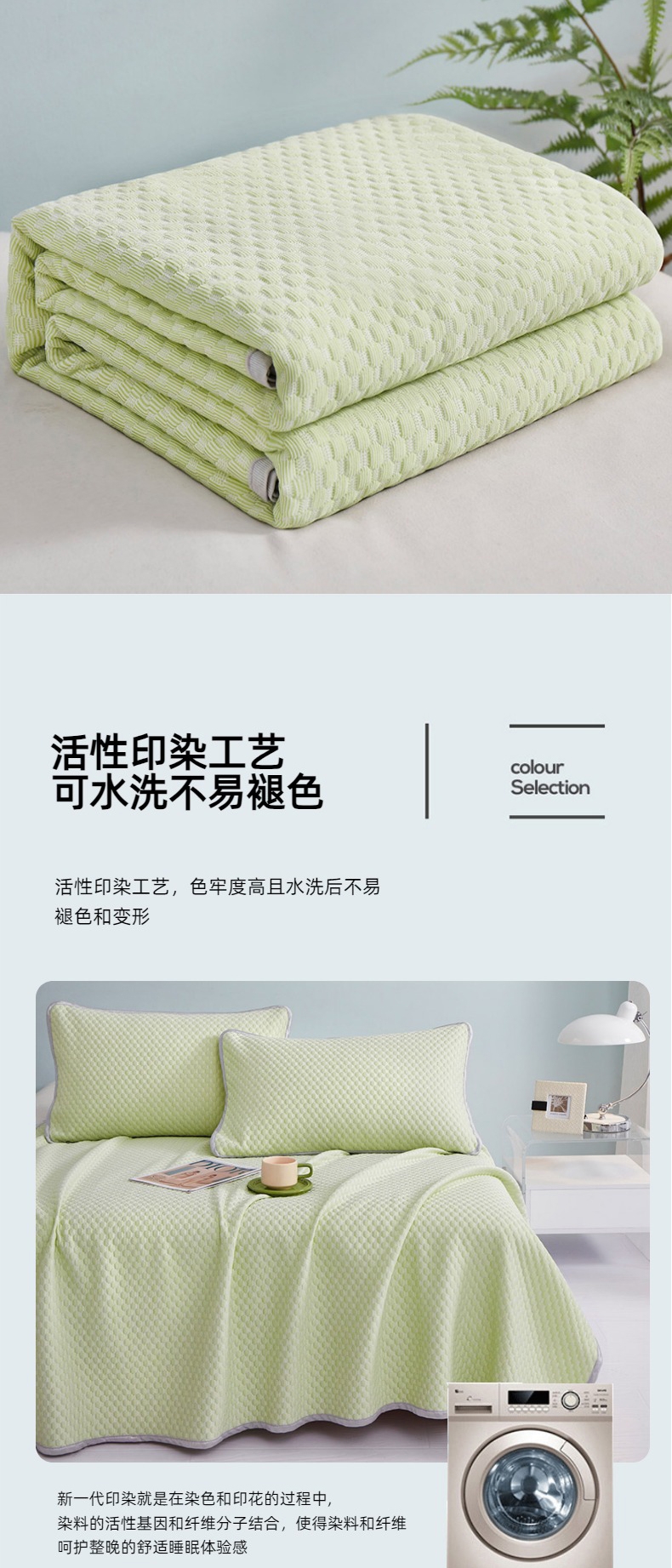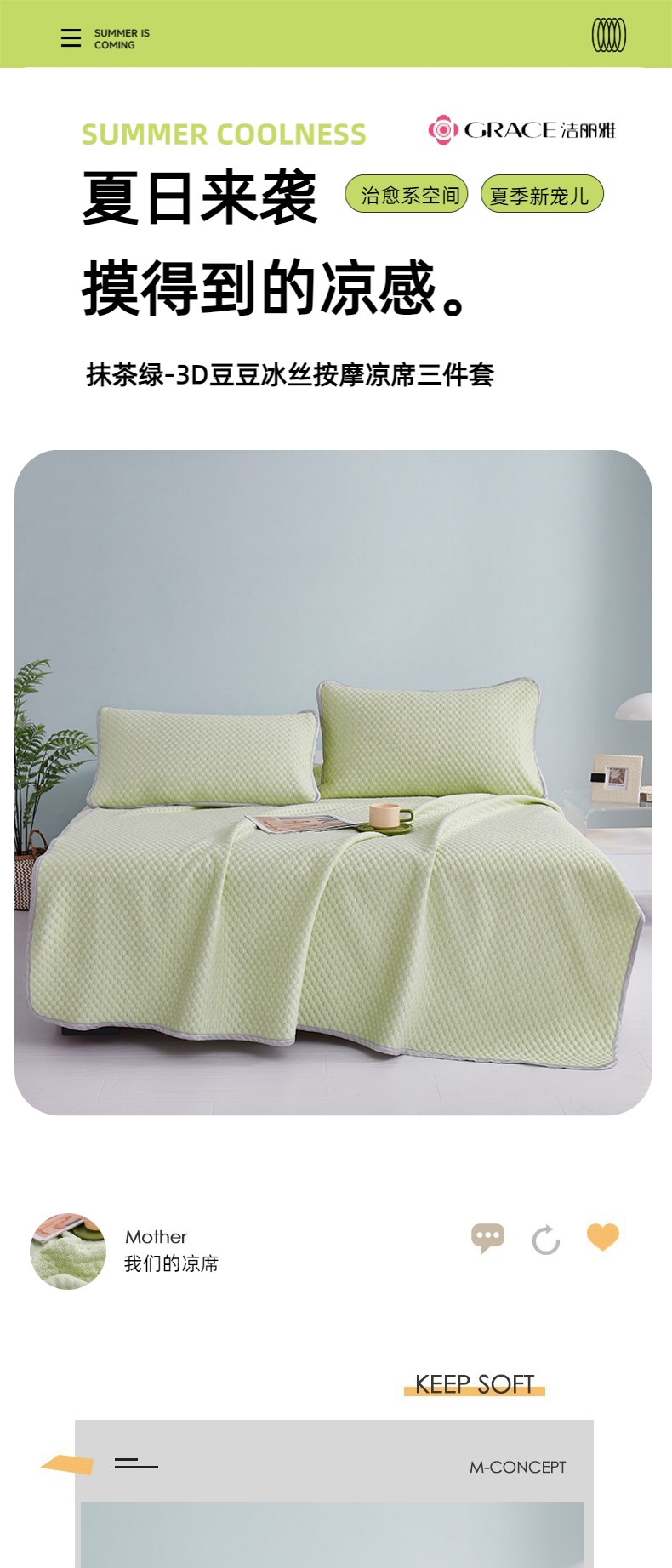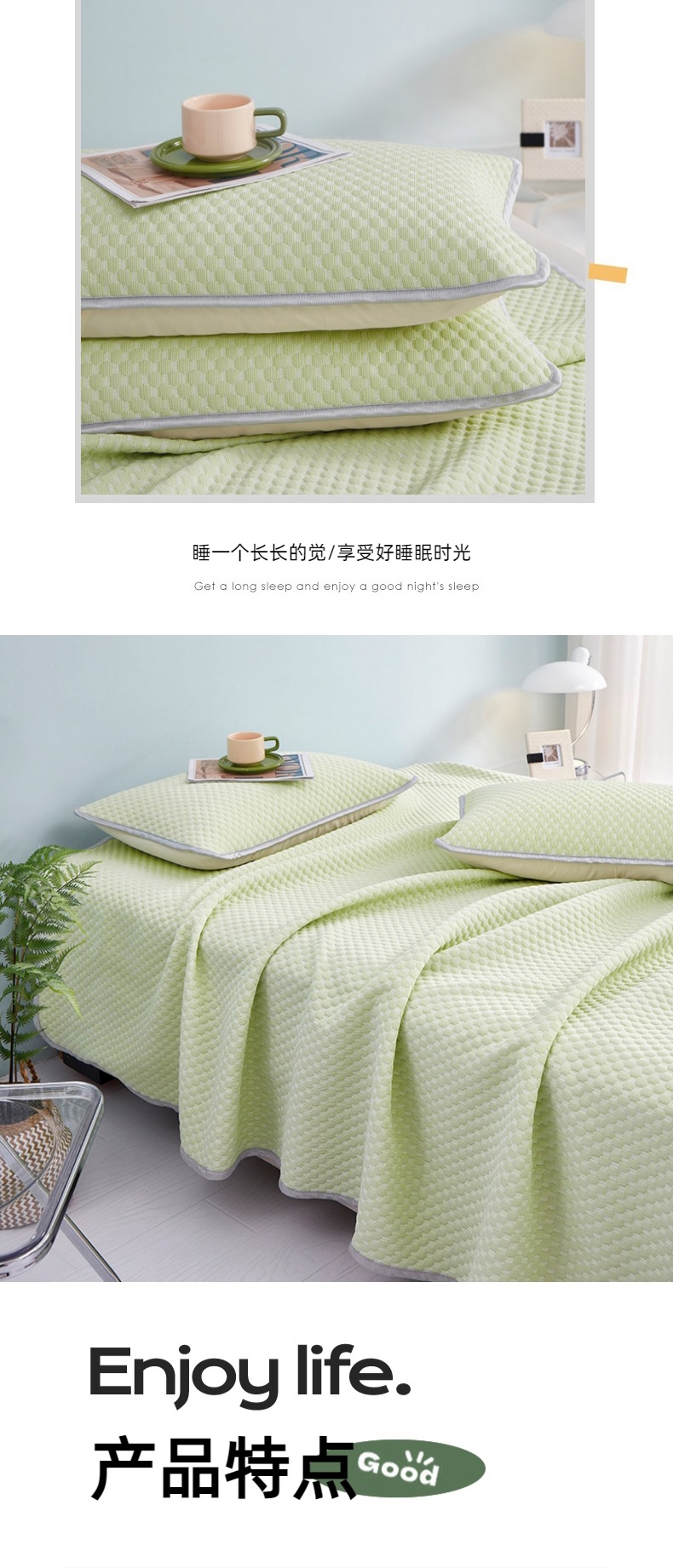 凉而不冰,吸湿透气;;优雅大气花纹,彰显品质;柔软不夹发,席面光滑,清爽不沾身;