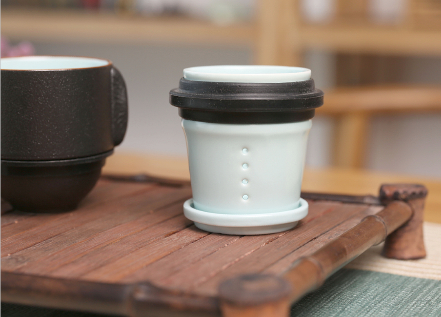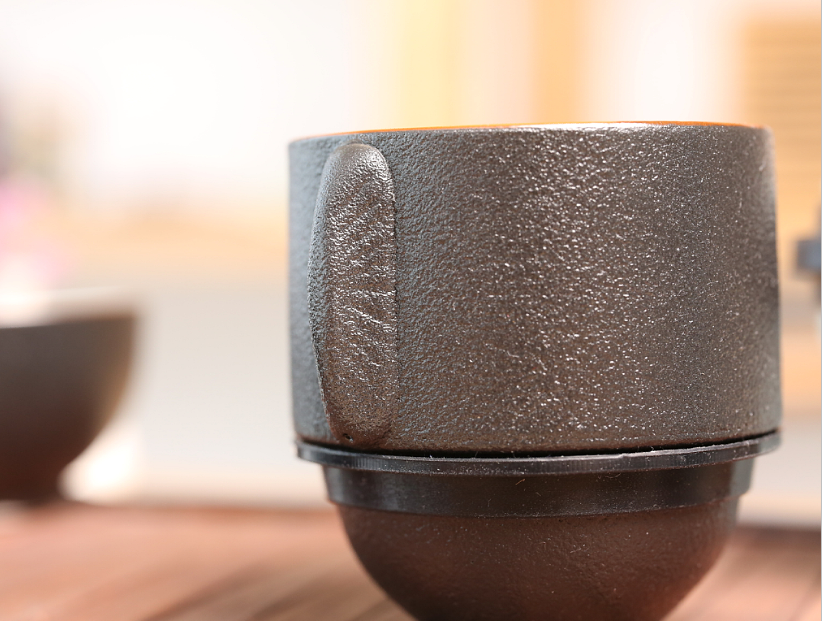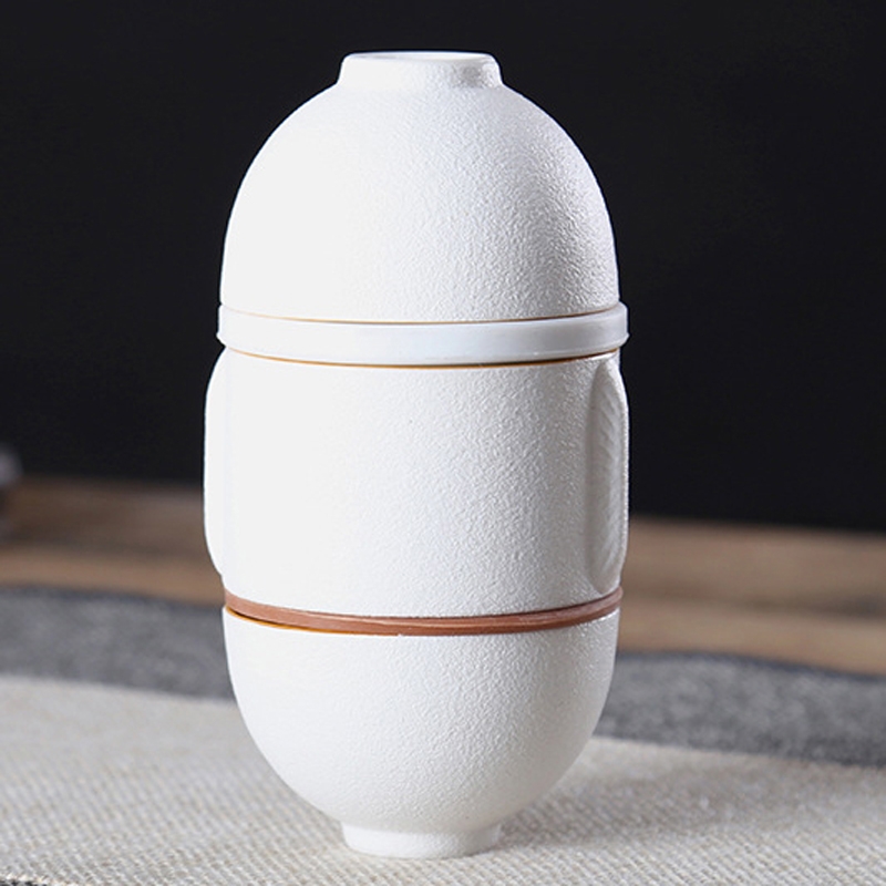 两个杯子可与壶上下重叠组合,茶隔也放置其中;方便携带,简单实用。高雅时尚。简洁大方。;表面有珍珠般细小颗粒,触感舒适。