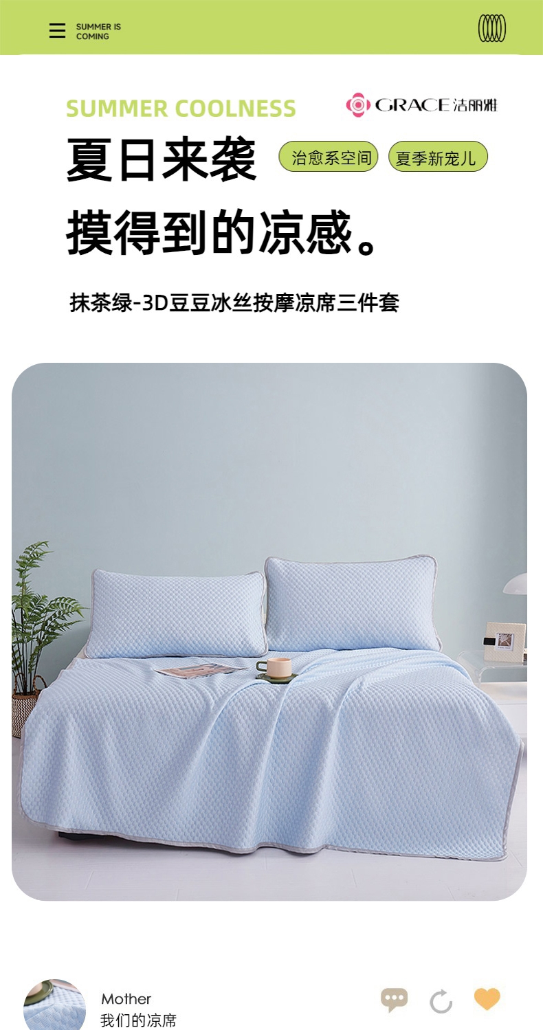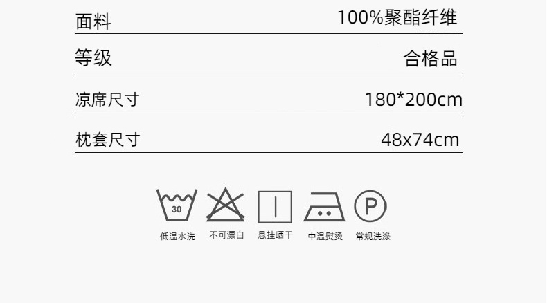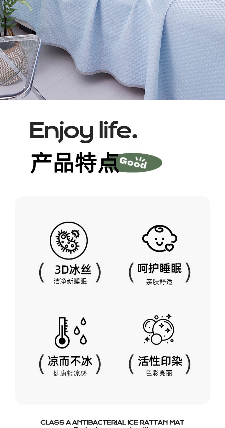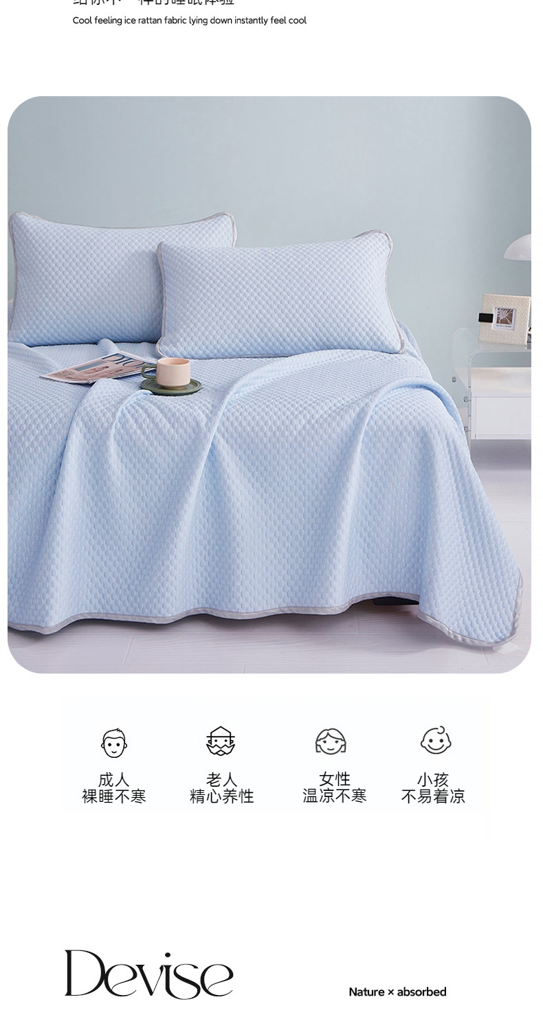 凉而不冰,吸湿透气;优雅大气花纹,彰显品质;柔软不夹发,席面光滑,清爽不沾身;