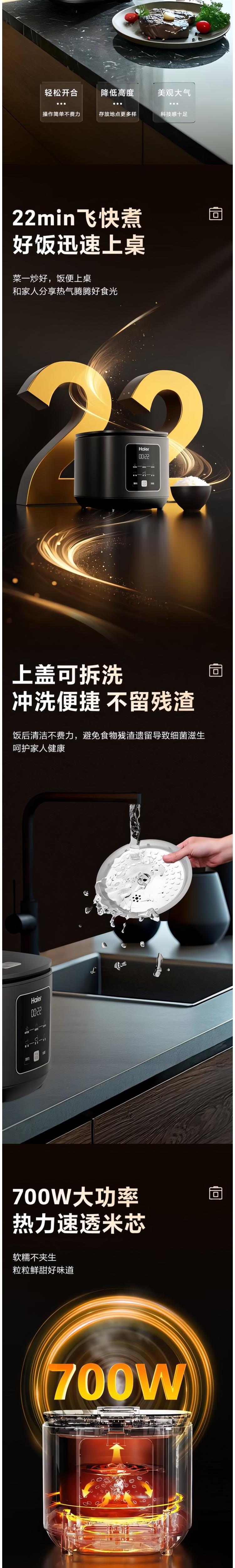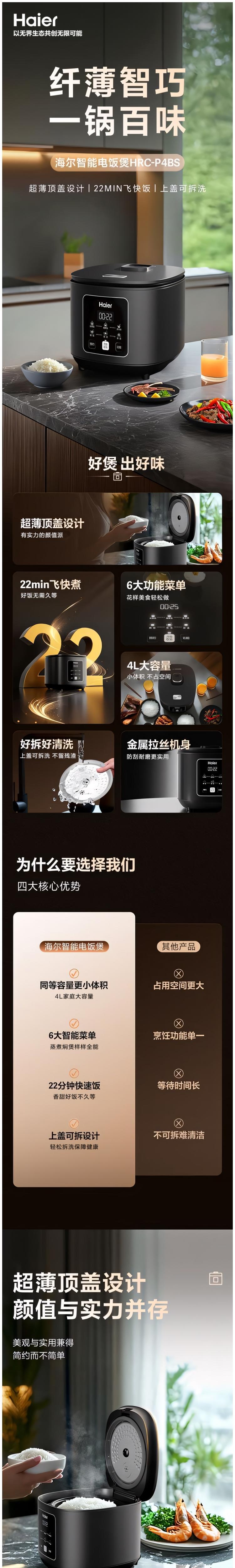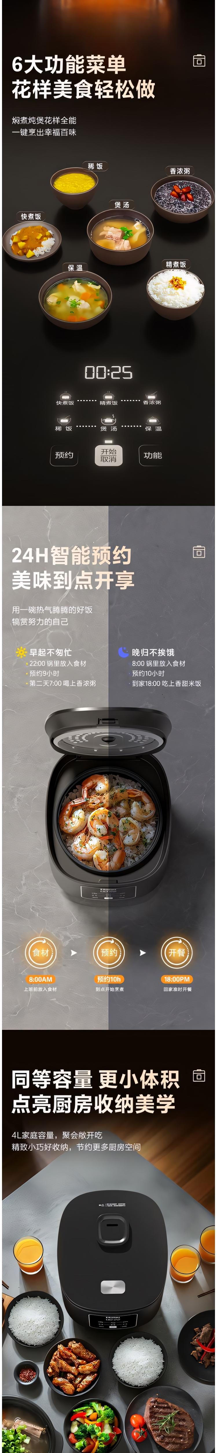 超薄顶盖设计,科技感十足;5大烹饪功能,极简操作;相同容量,更小体积,空间节约