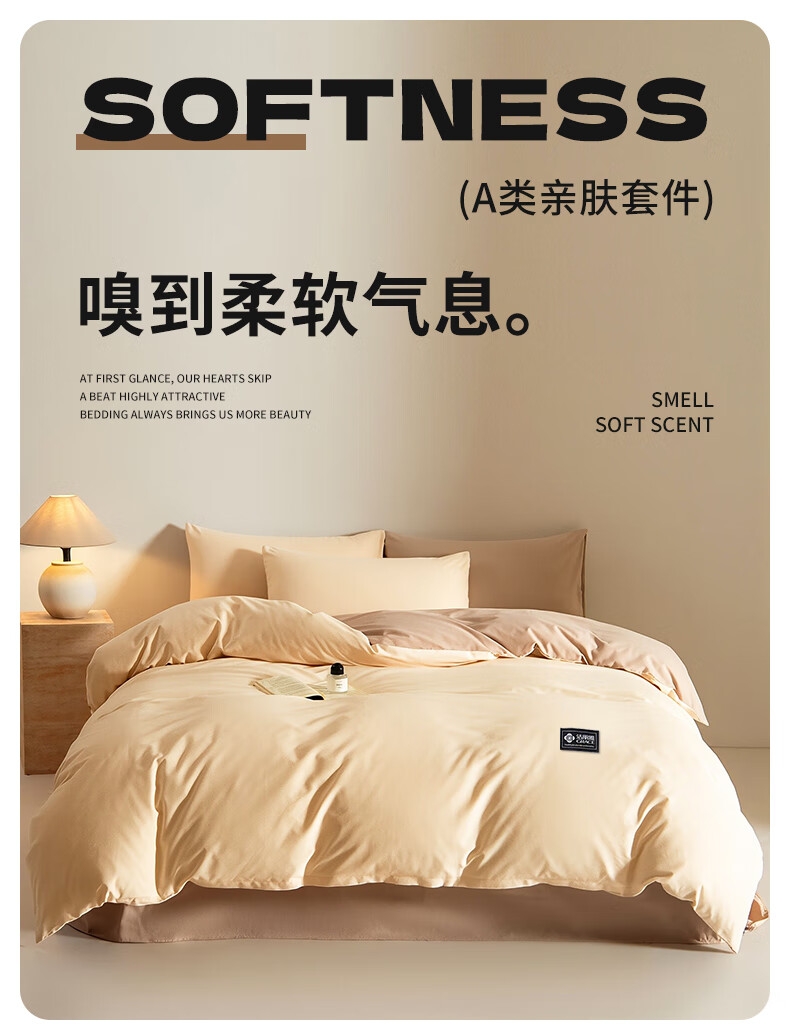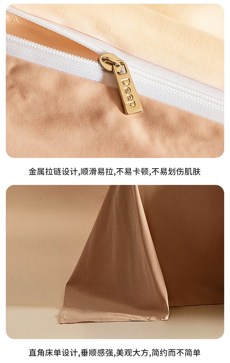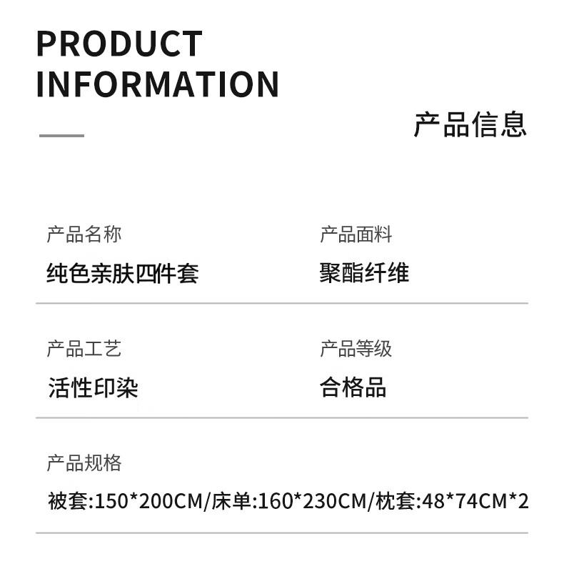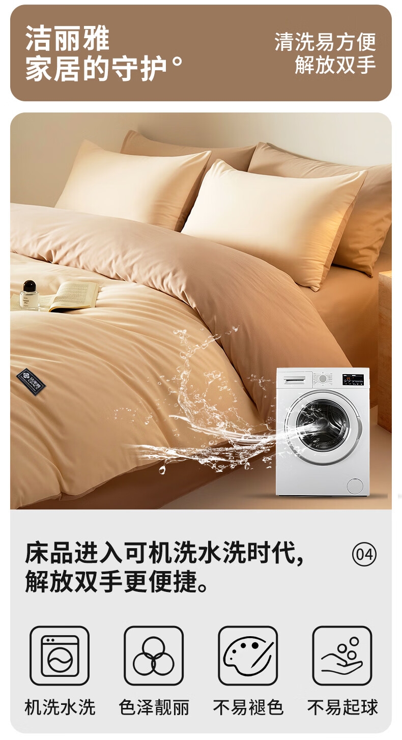 柔软亲肤、透气吸湿,贴身舒适不闷汗;做工工整,走线细密,被套隐形拉链;机洗不易褪色、不起球,居家睡眠更舒适。