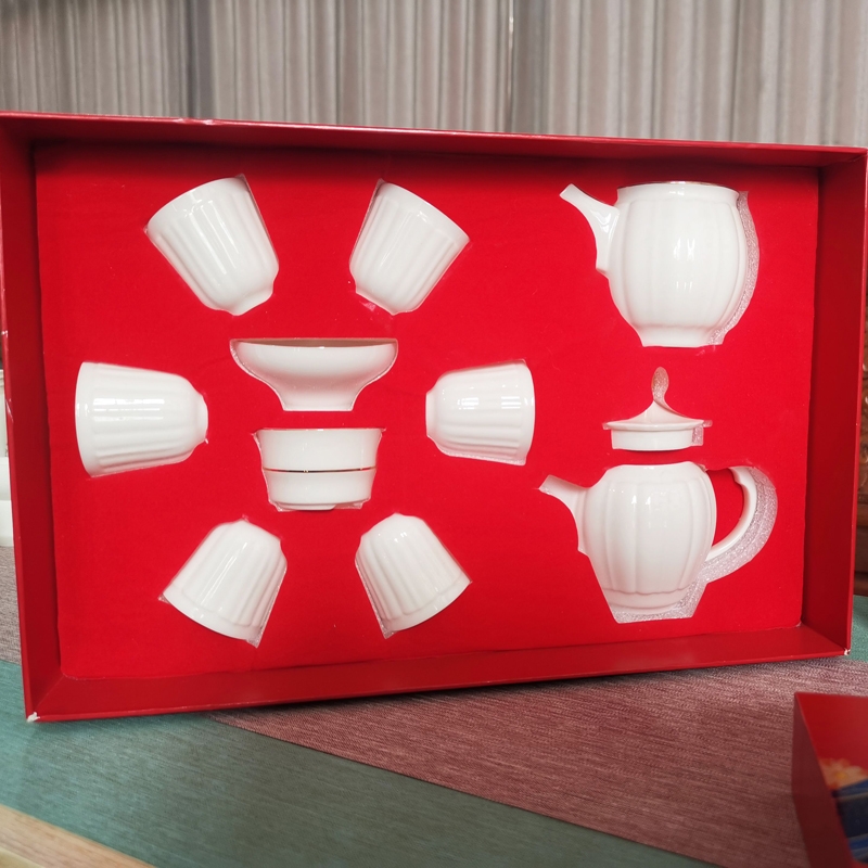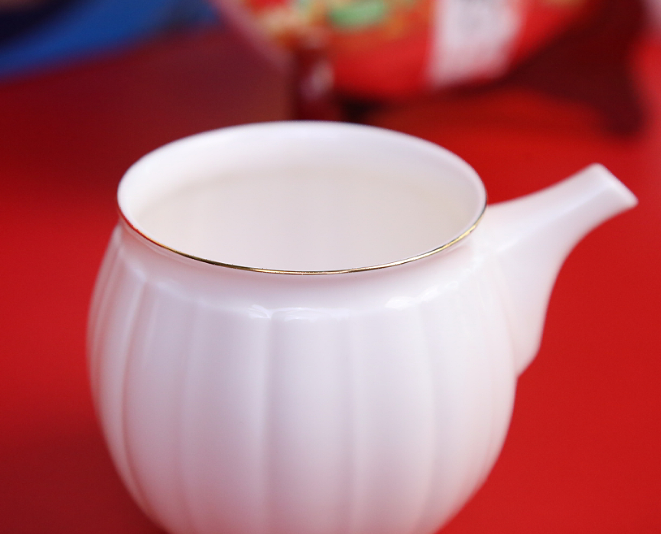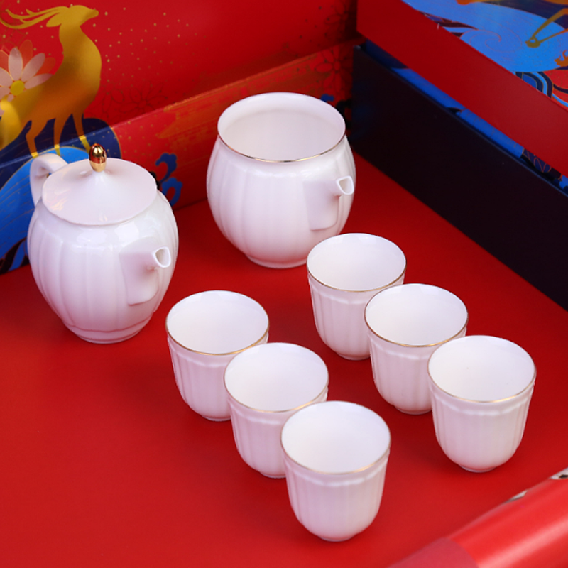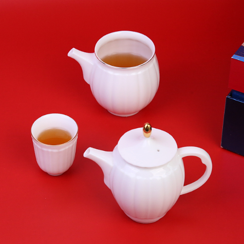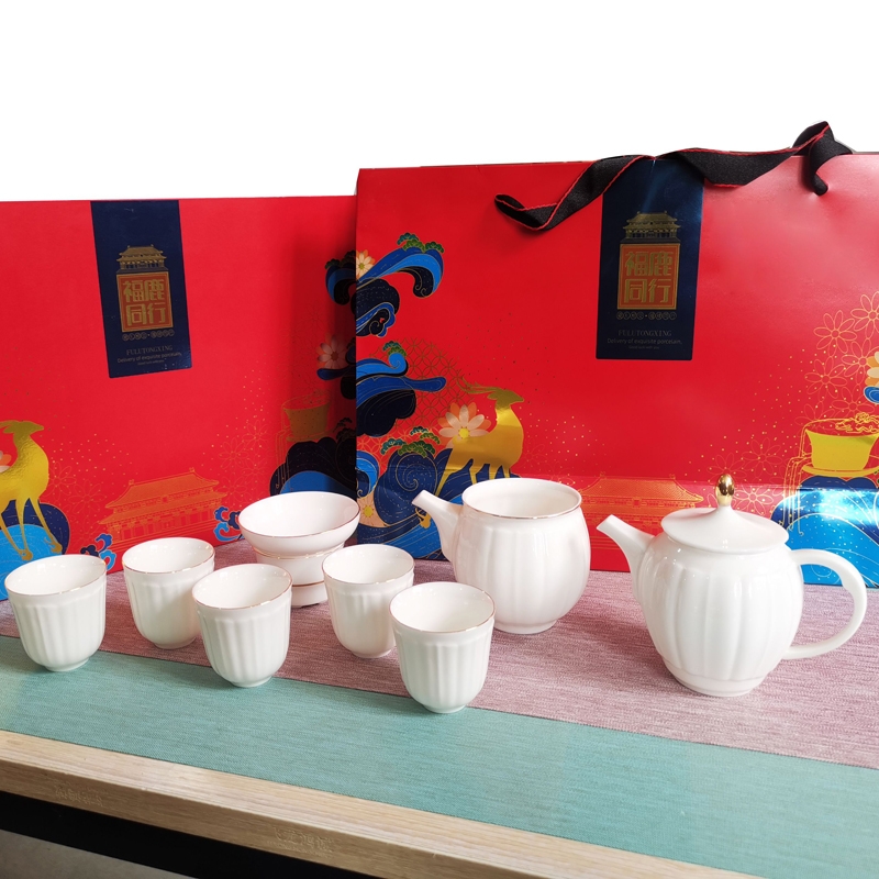 高档描金羊脂玉瓷,精选优质高价瓷土;瓷质细腻润滑,似凝脂,如美玉。茶具描真金,尽显高档;高档礼盒手提袋装