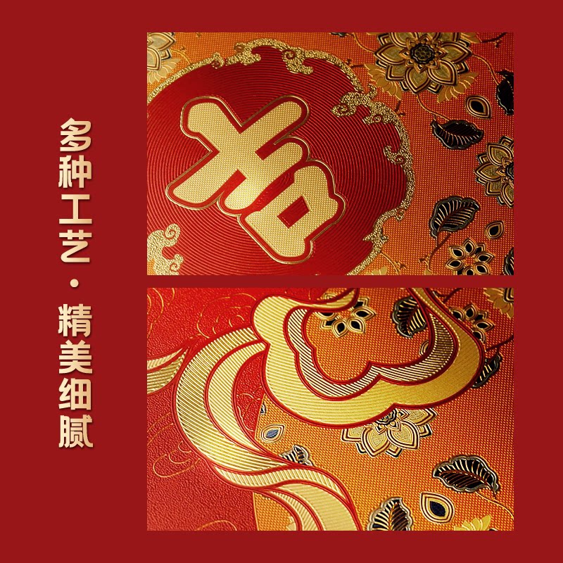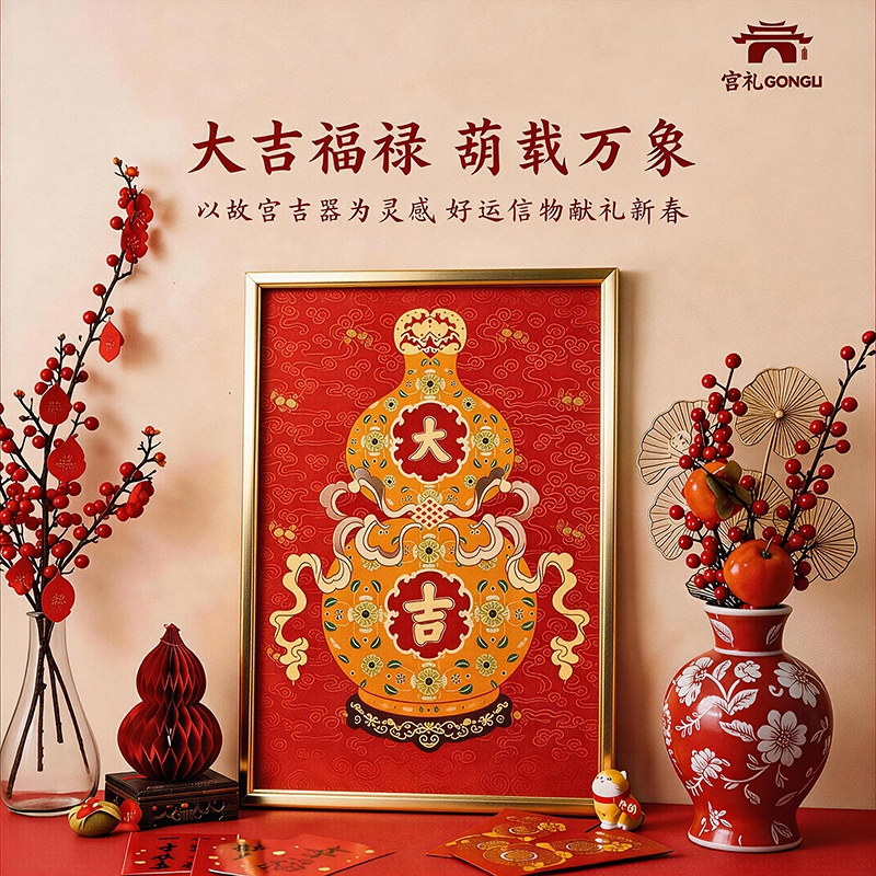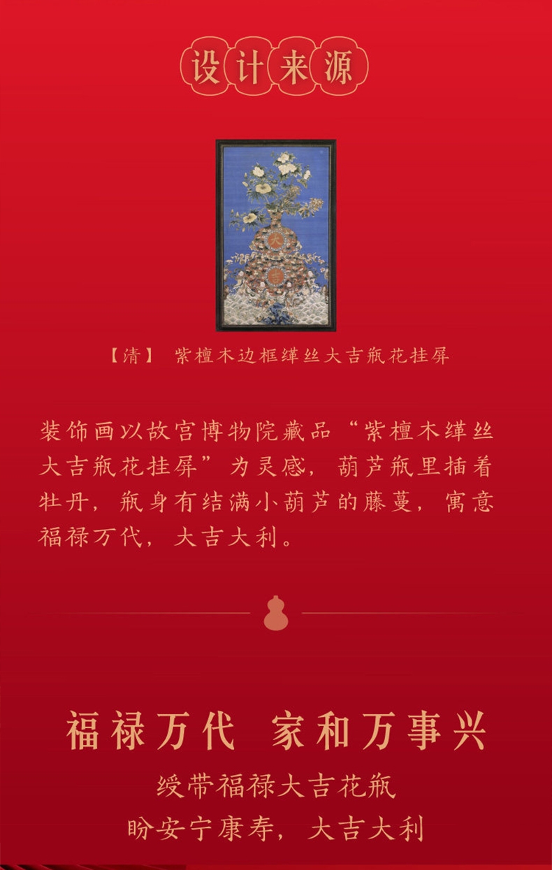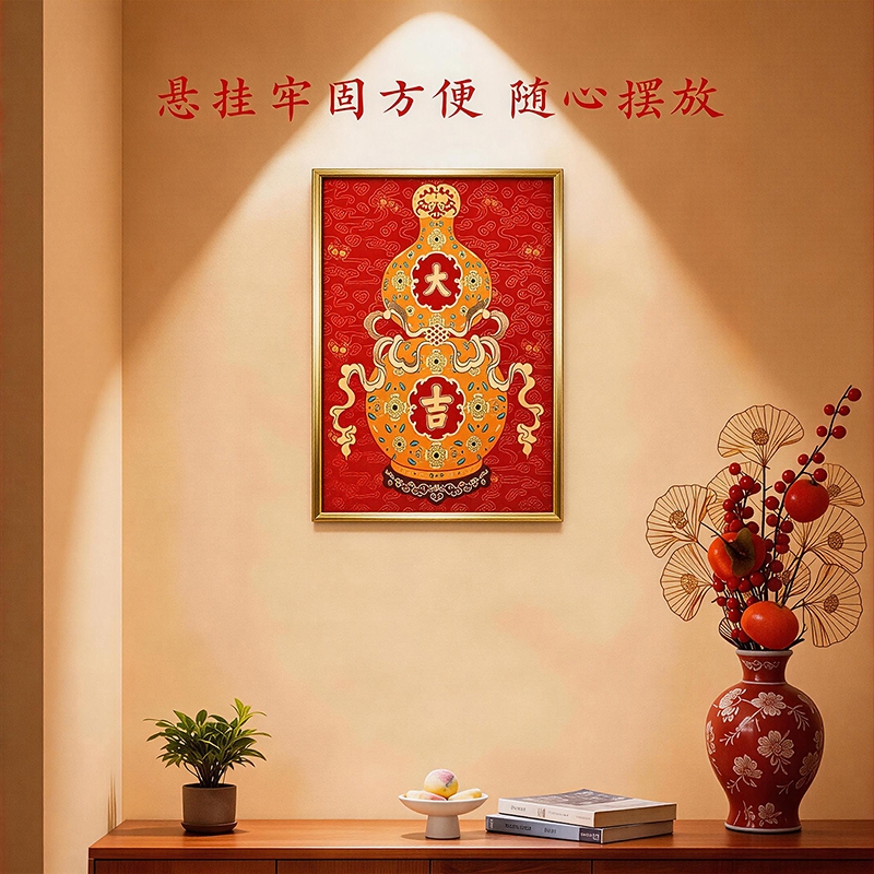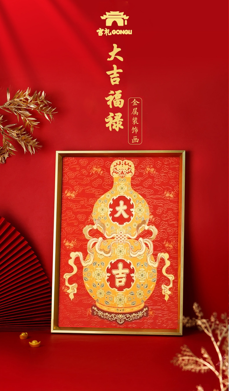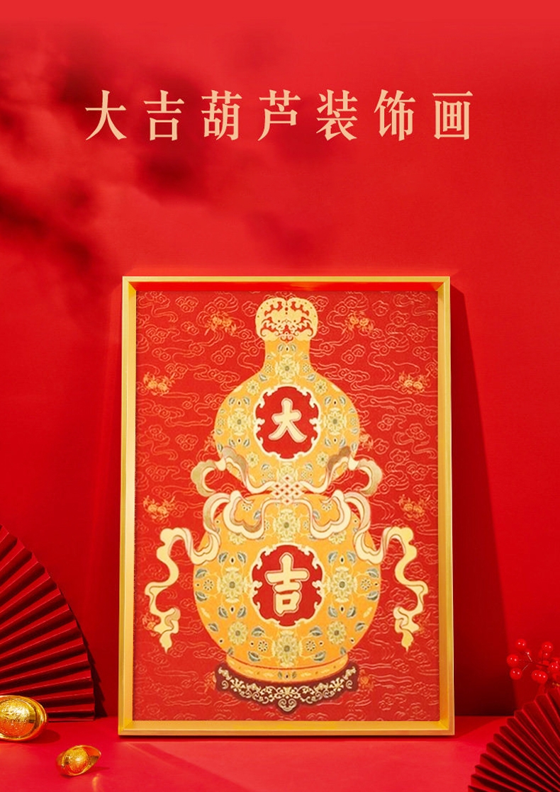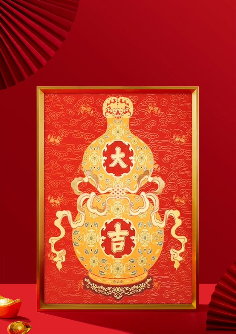 福禄双全:葫芦纳千祥,金纹绘福禄。;红运满盈:朱红衬金辉,方寸见吉庆。一幅装饰画;承祥:以金为绘,以红纳福。