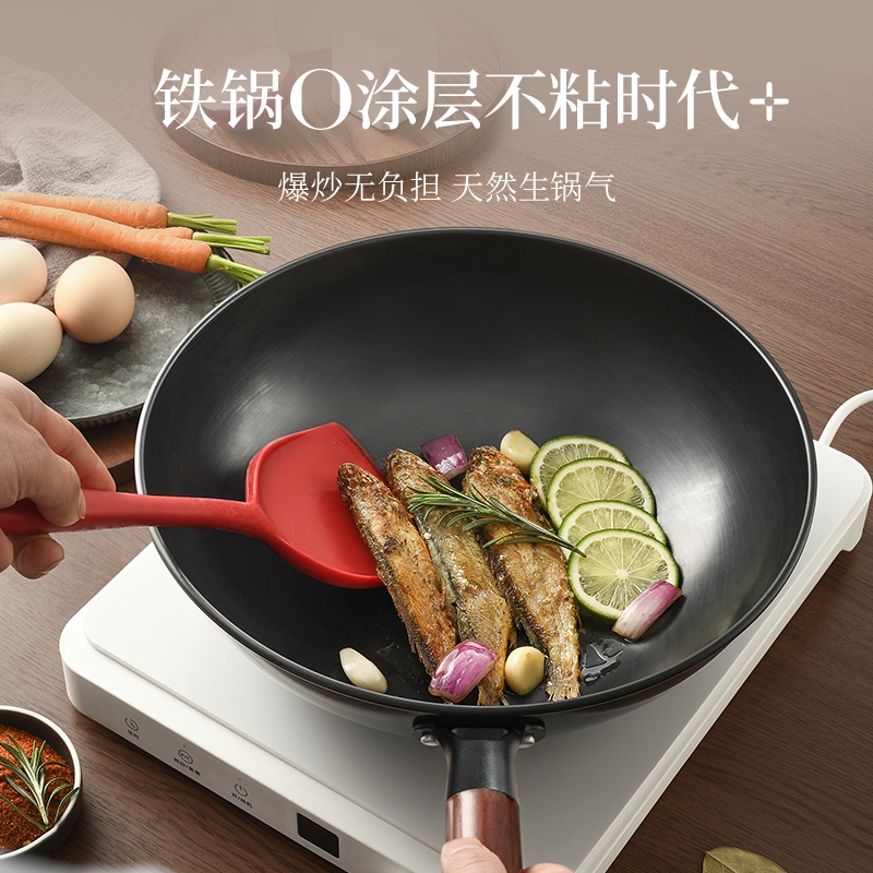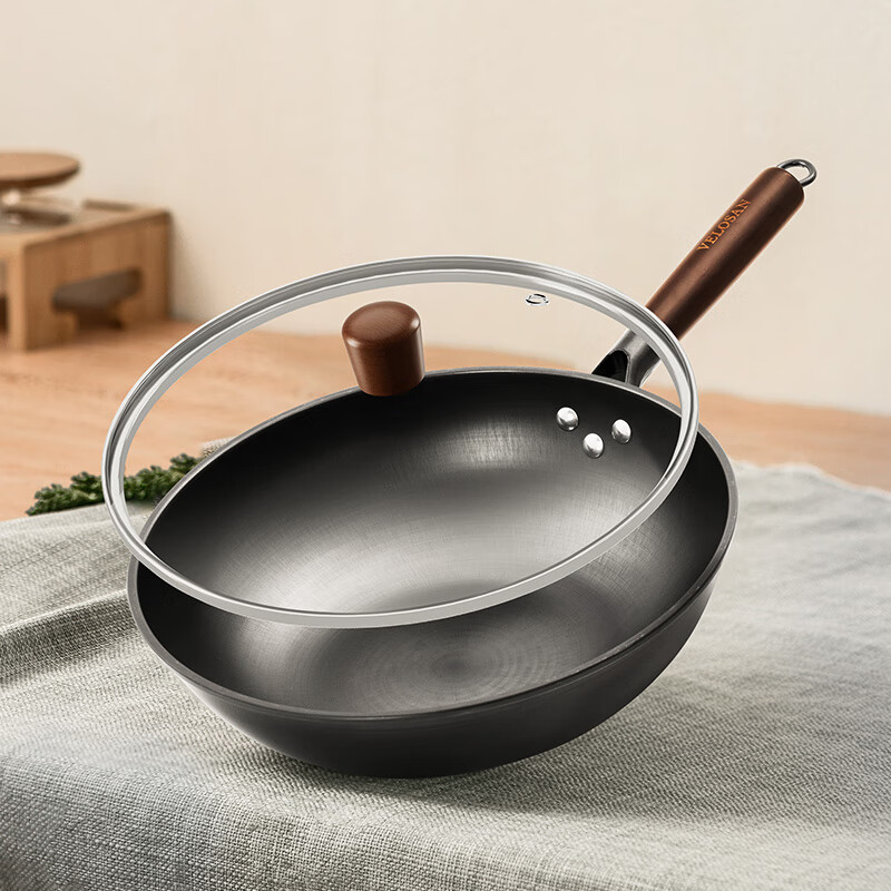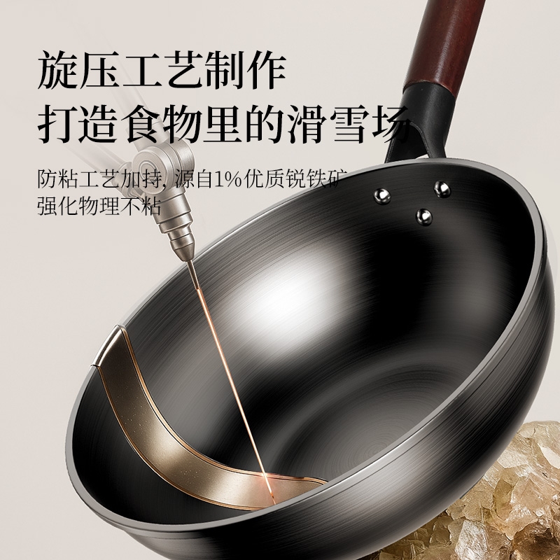 精铁材质,无化学涂层使用更放心;;内壁窒氮技术,耐蚀耐磨,不易生锈;透明锅盖,烹饪可视化