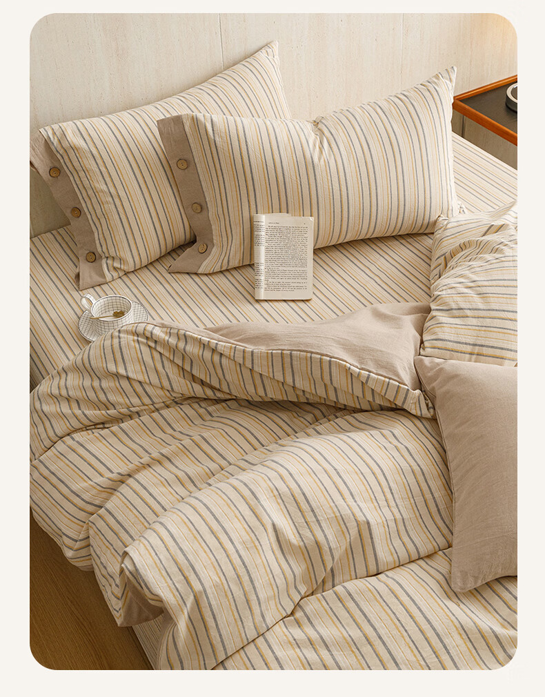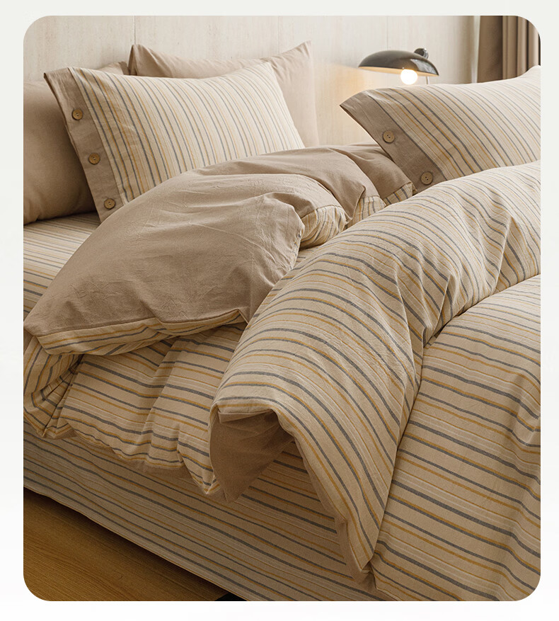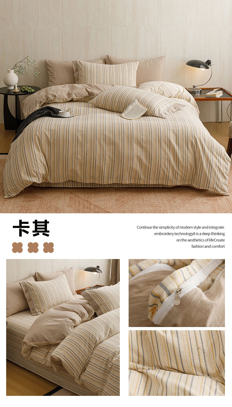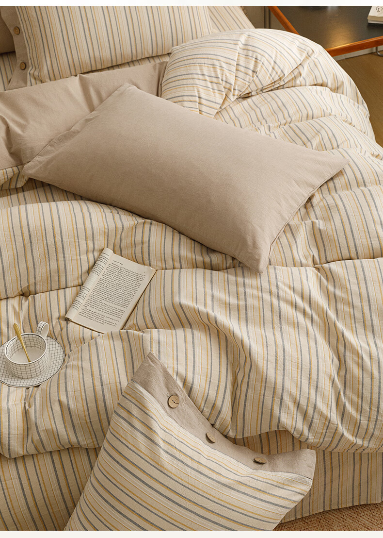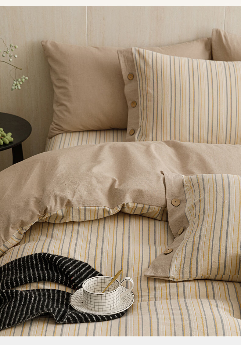 全棉色织水洗棉,甄选高密度全棉色织水洗棉面料制作;纤维长质地柔软光泽度好,赋予床品柔滑触感;纽扣设计美感源于生活。精致纽扣设计;打理方便装点床品:做工细腻,一针一线都用心
