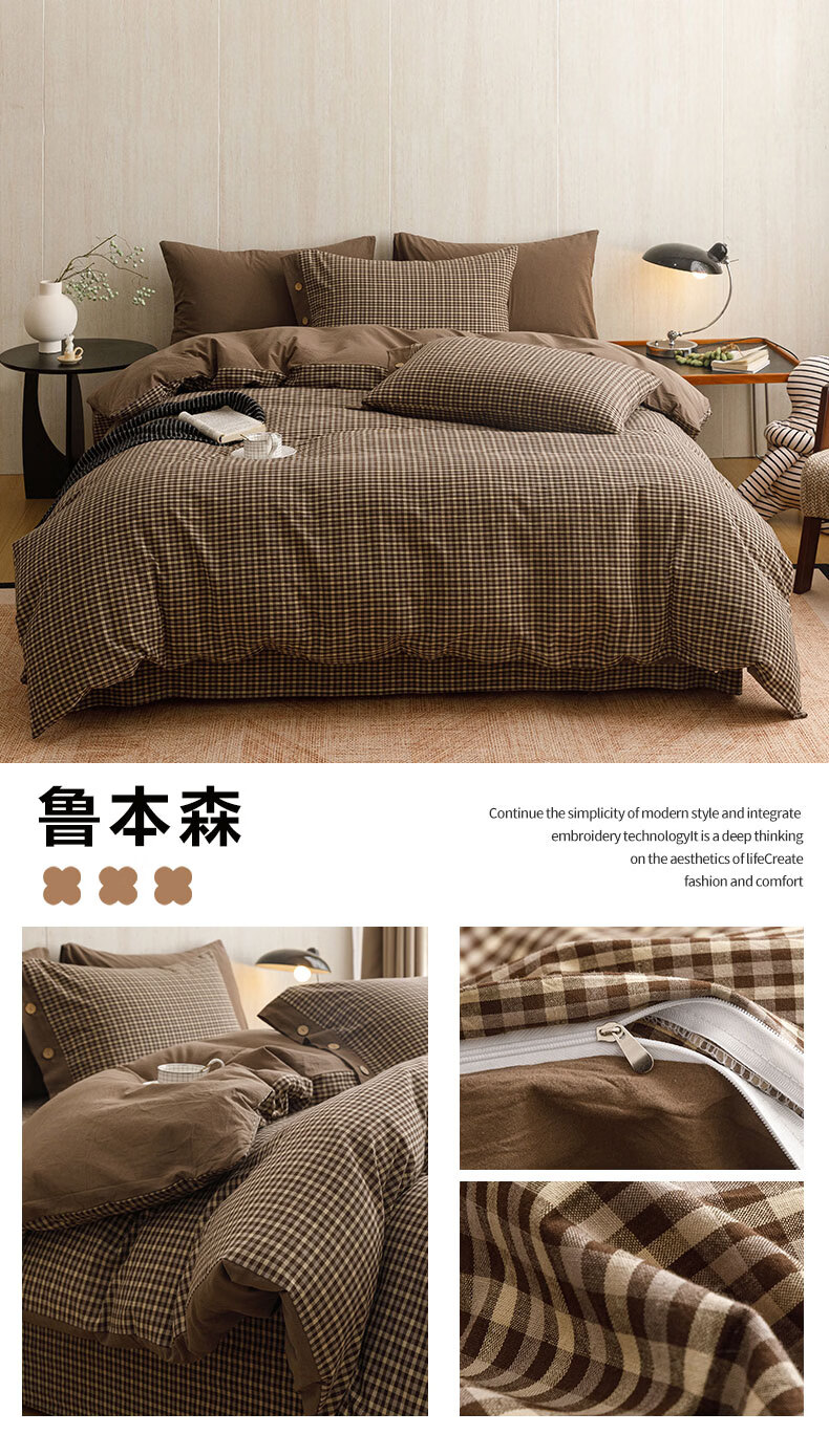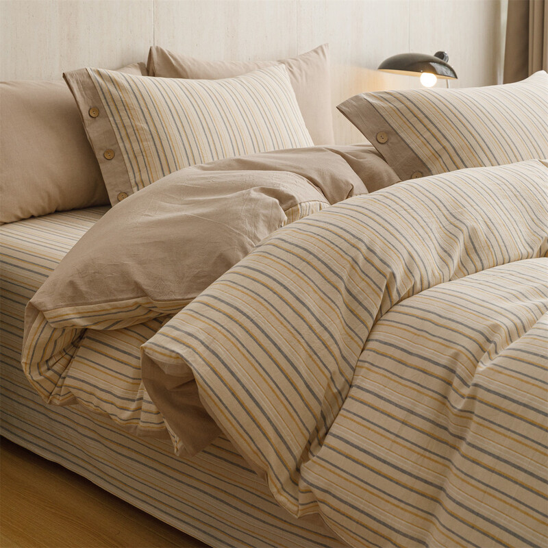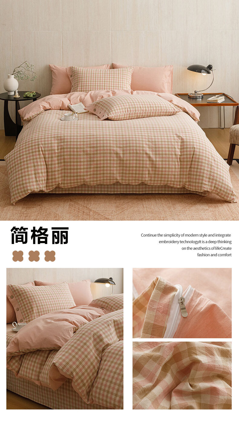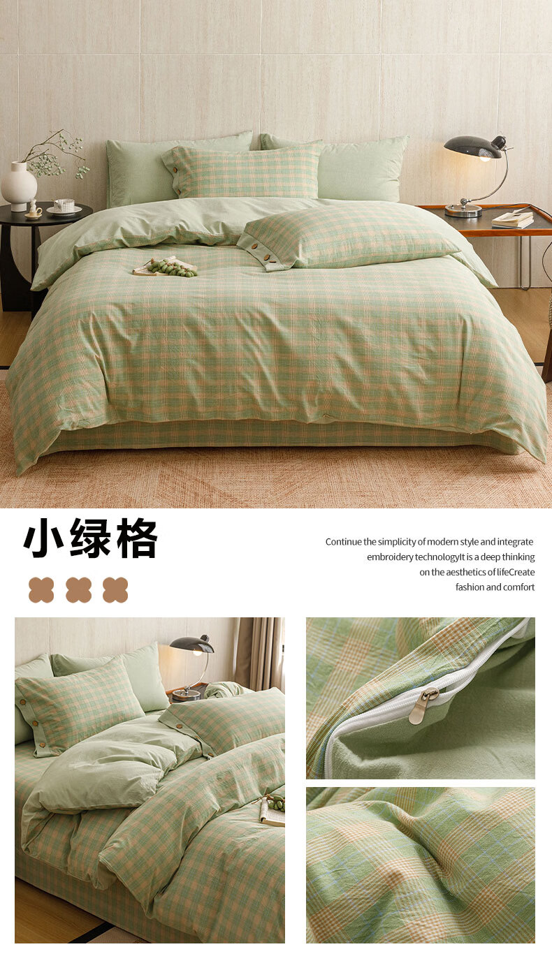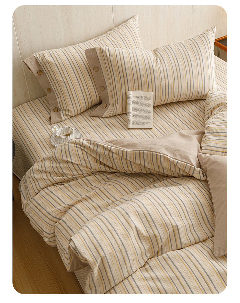 全棉色织水洗棉,甄选高密度全棉色织水洗棉面料制作;纤维长质地柔软光泽度好,赋予床品柔滑触感;纽扣设计美感源于生活。精致纽扣设计;打理方便装点床品:做工细腻,一针一线都用心