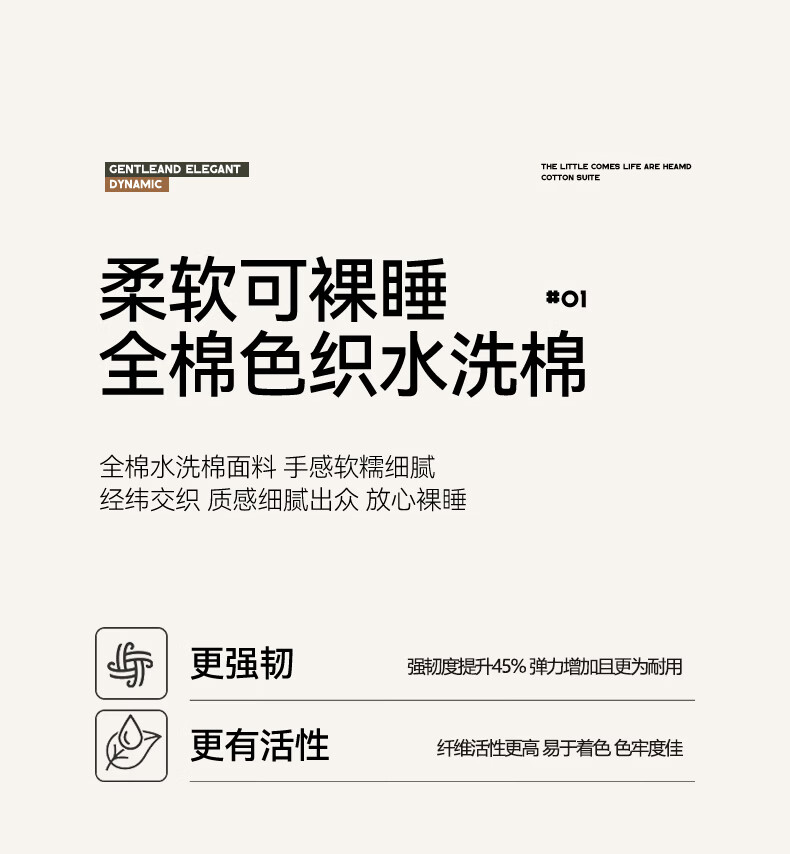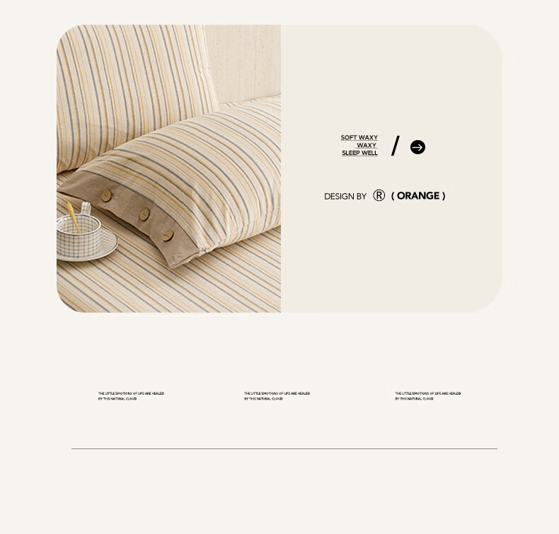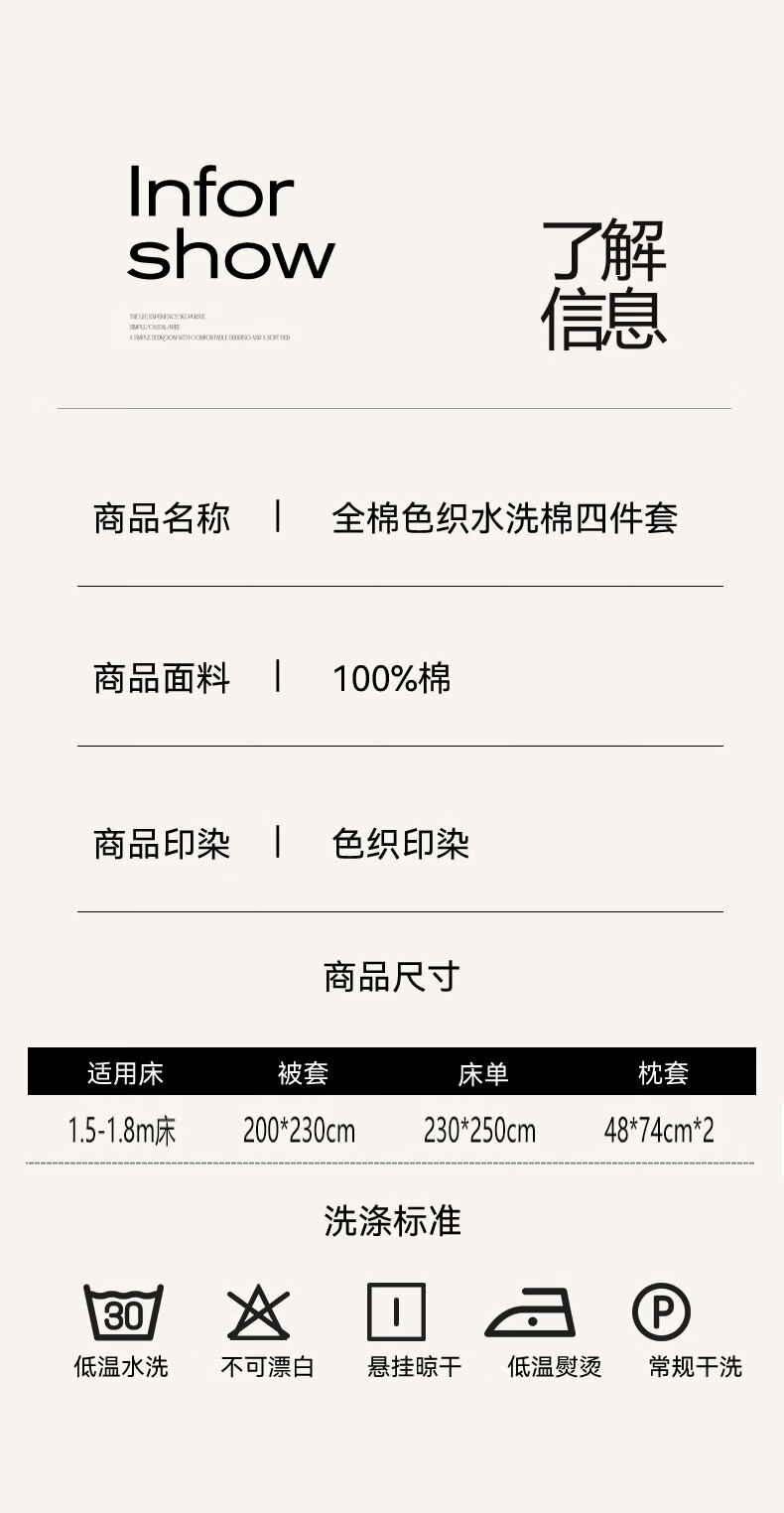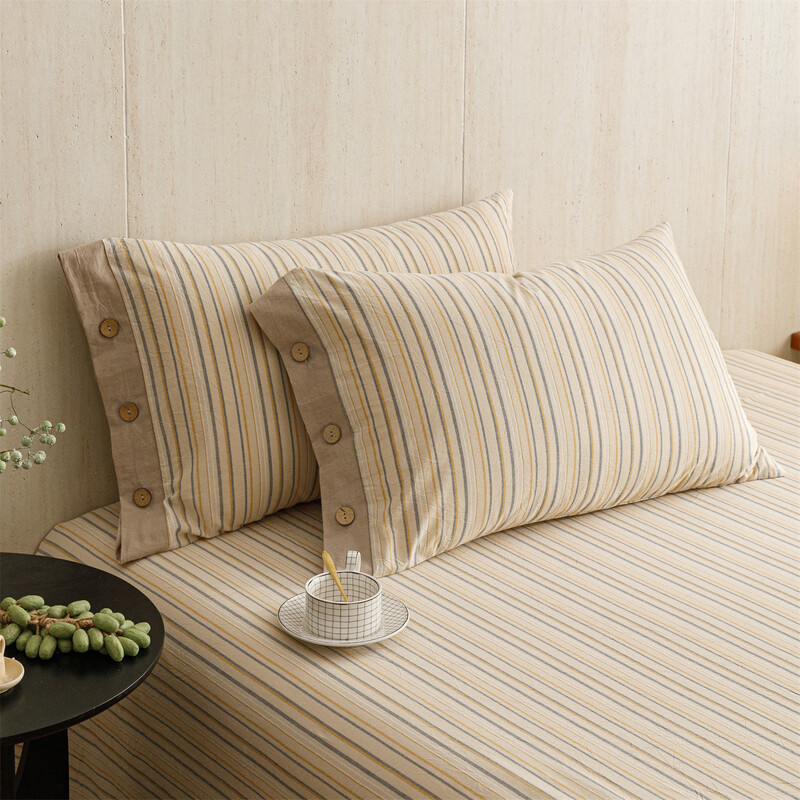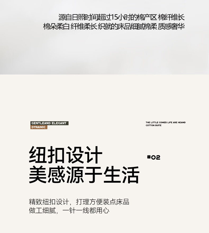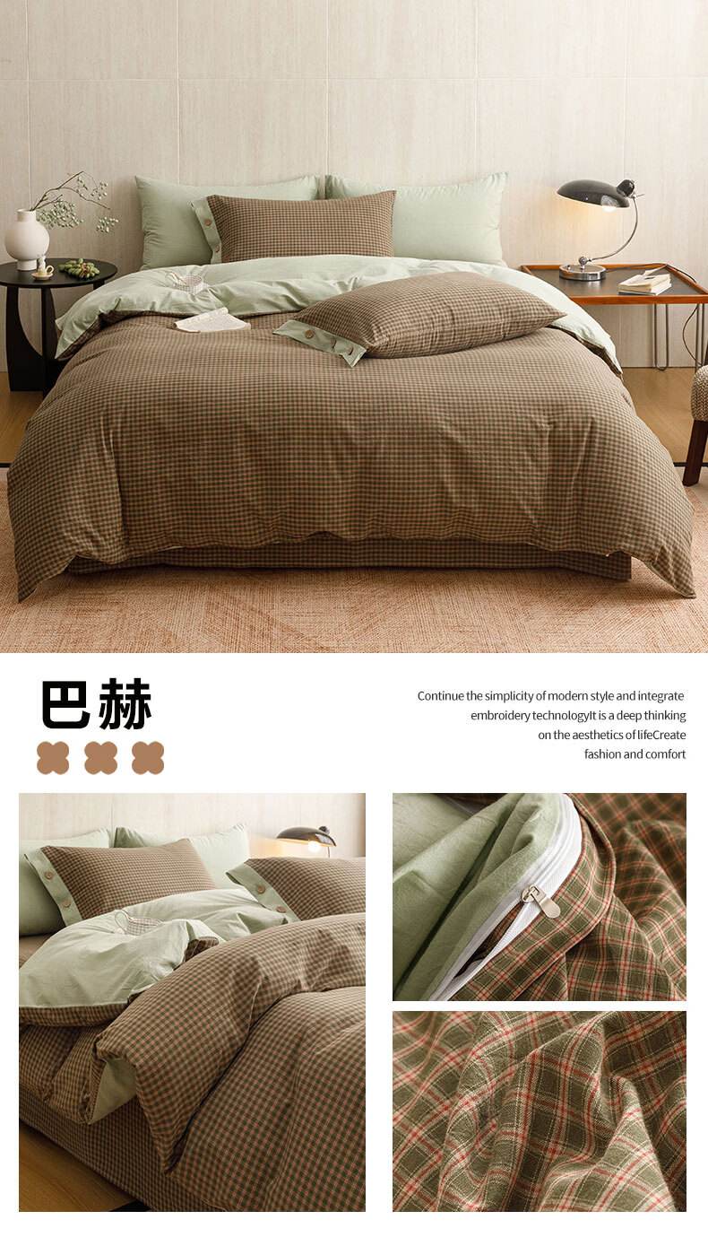 全棉色织水洗棉,甄选高密度全棉色织水洗棉面料制作;纤维长质地柔软光泽度好,赋予床品柔滑触感;纽扣设计美感源于生活。精致纽扣设计;打理方便装点床品:做工细腻,一针一线都用心