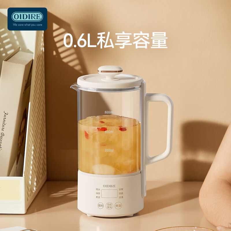 小巧机身,时尚百搭;高硼硅玻璃壶体,无惧冷热骤变;600W功率,600mL黄金容量
