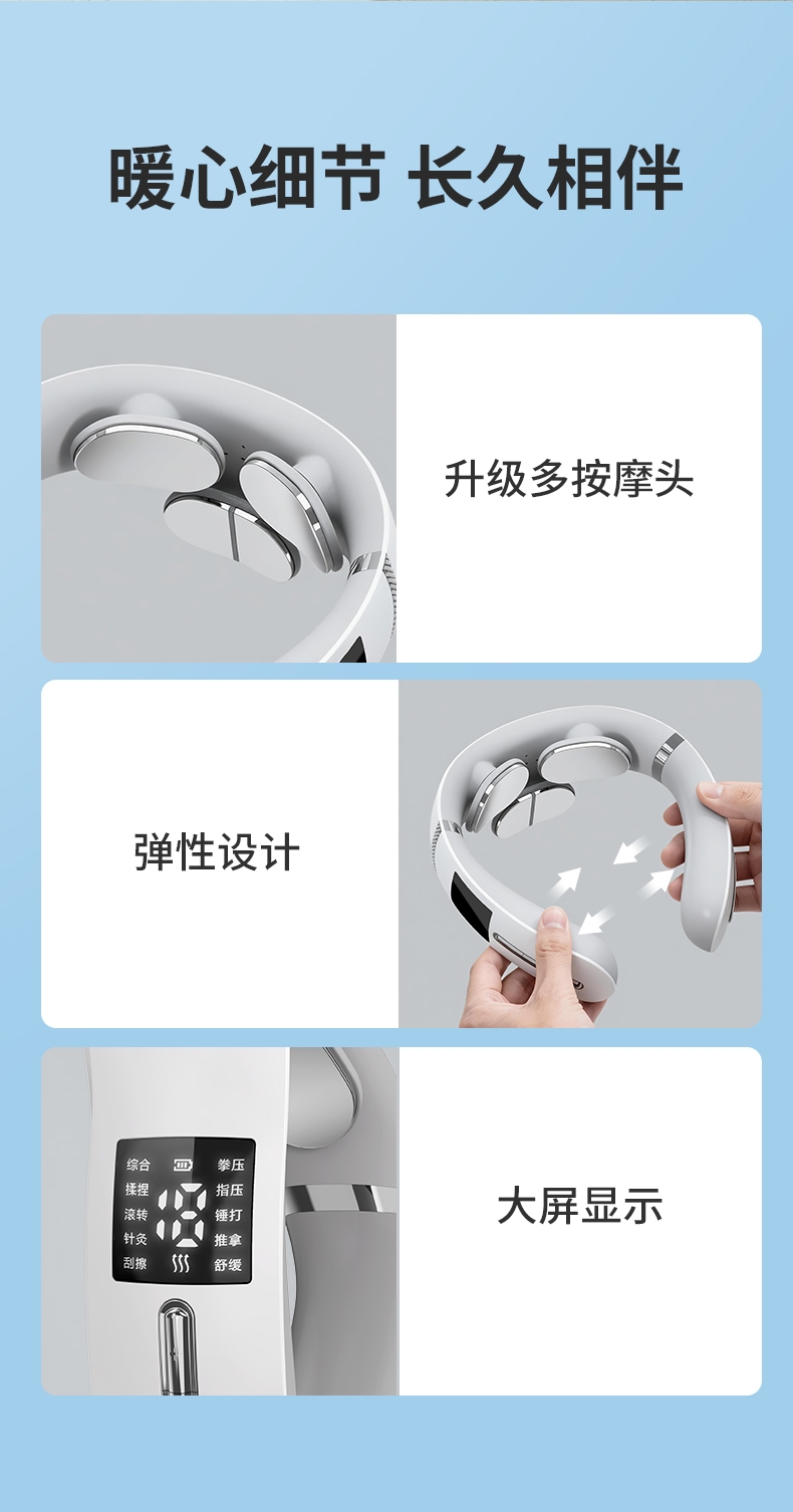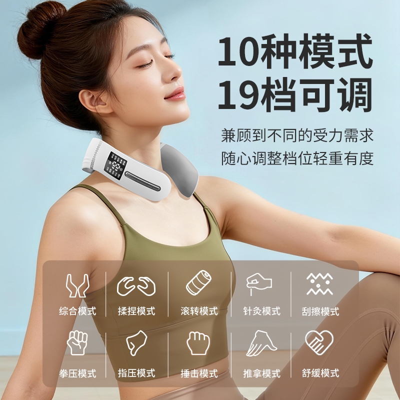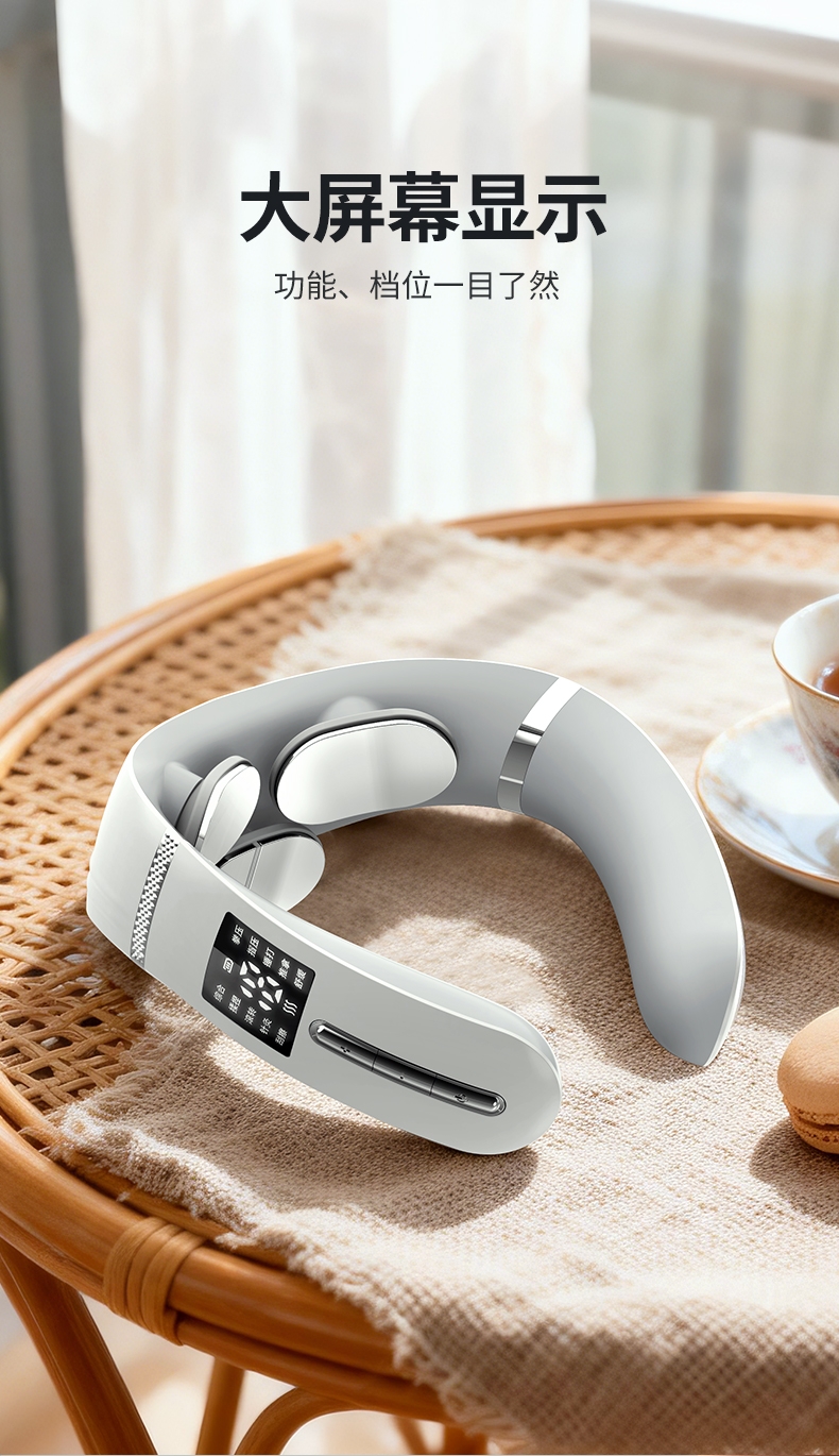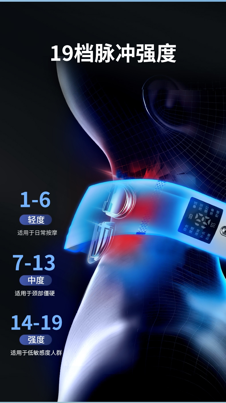 10种按摩方式19档位强度,液晶屏显。满足不同人群;一键智能热敷;调整颈椎及周围组织机能,缓解颈周