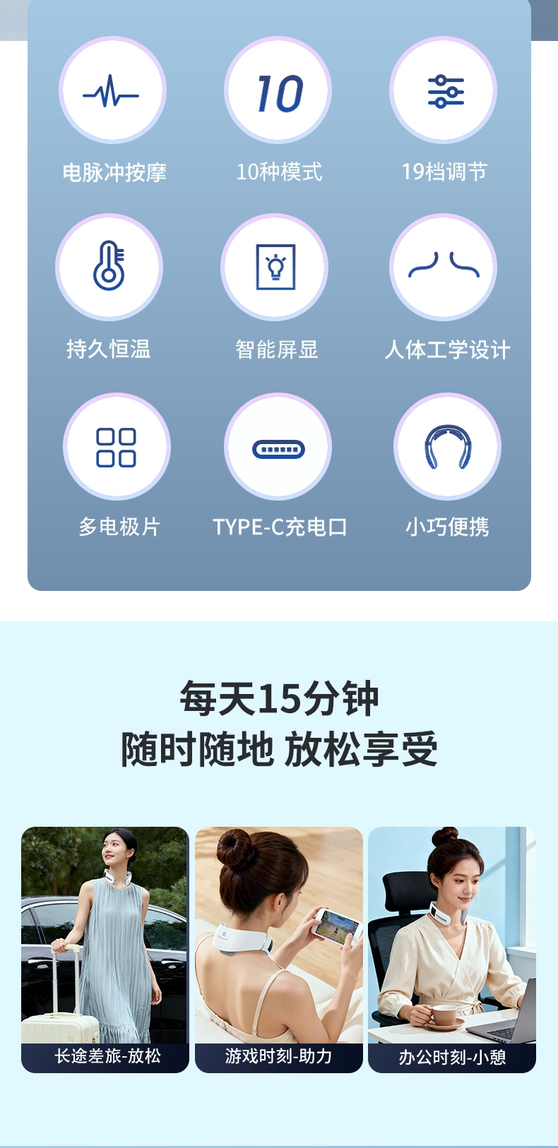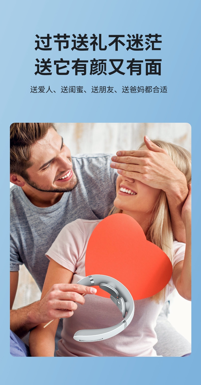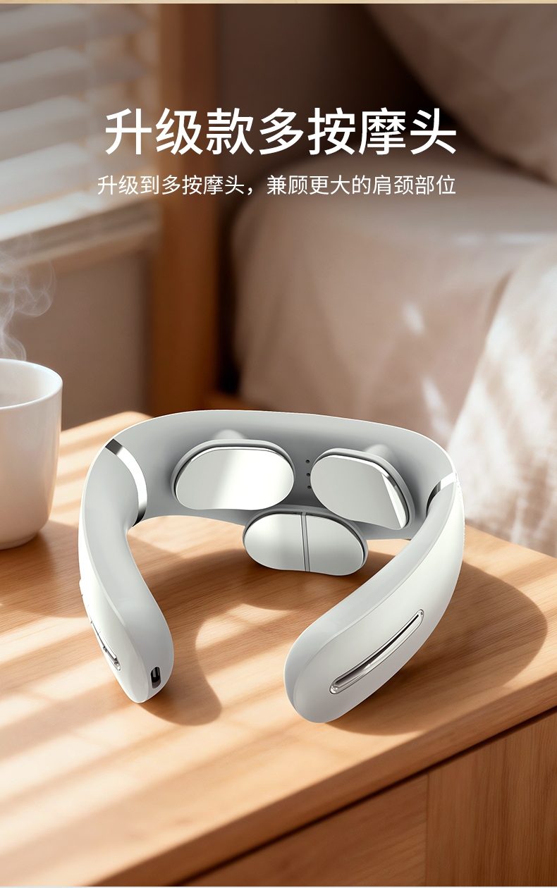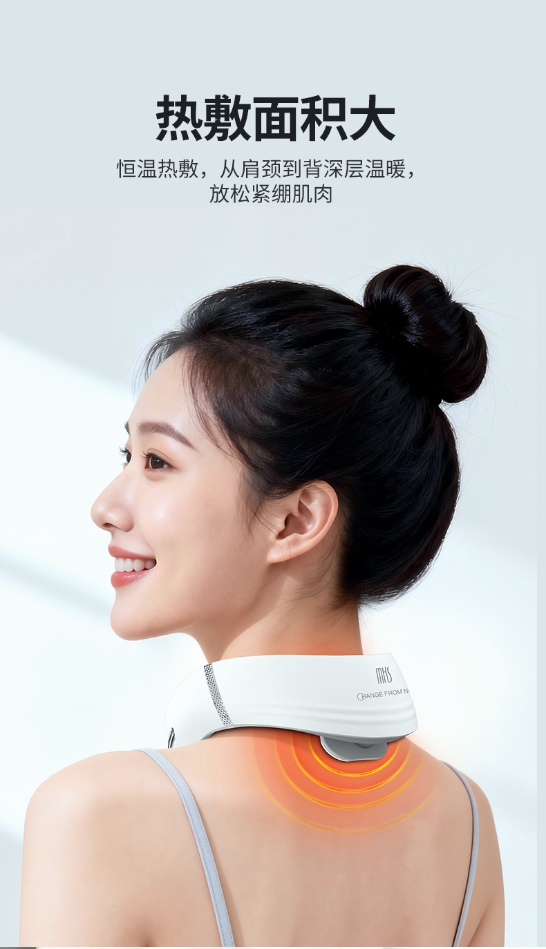 10种按摩方式19档位强度,液晶屏显。满足不同人群;一键智能热敷;调整颈椎及周围组织机能,缓解颈周