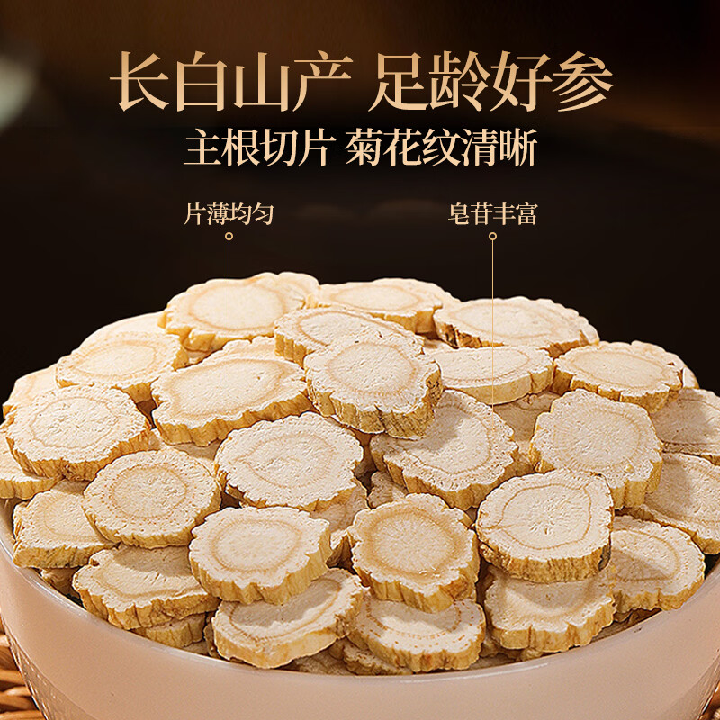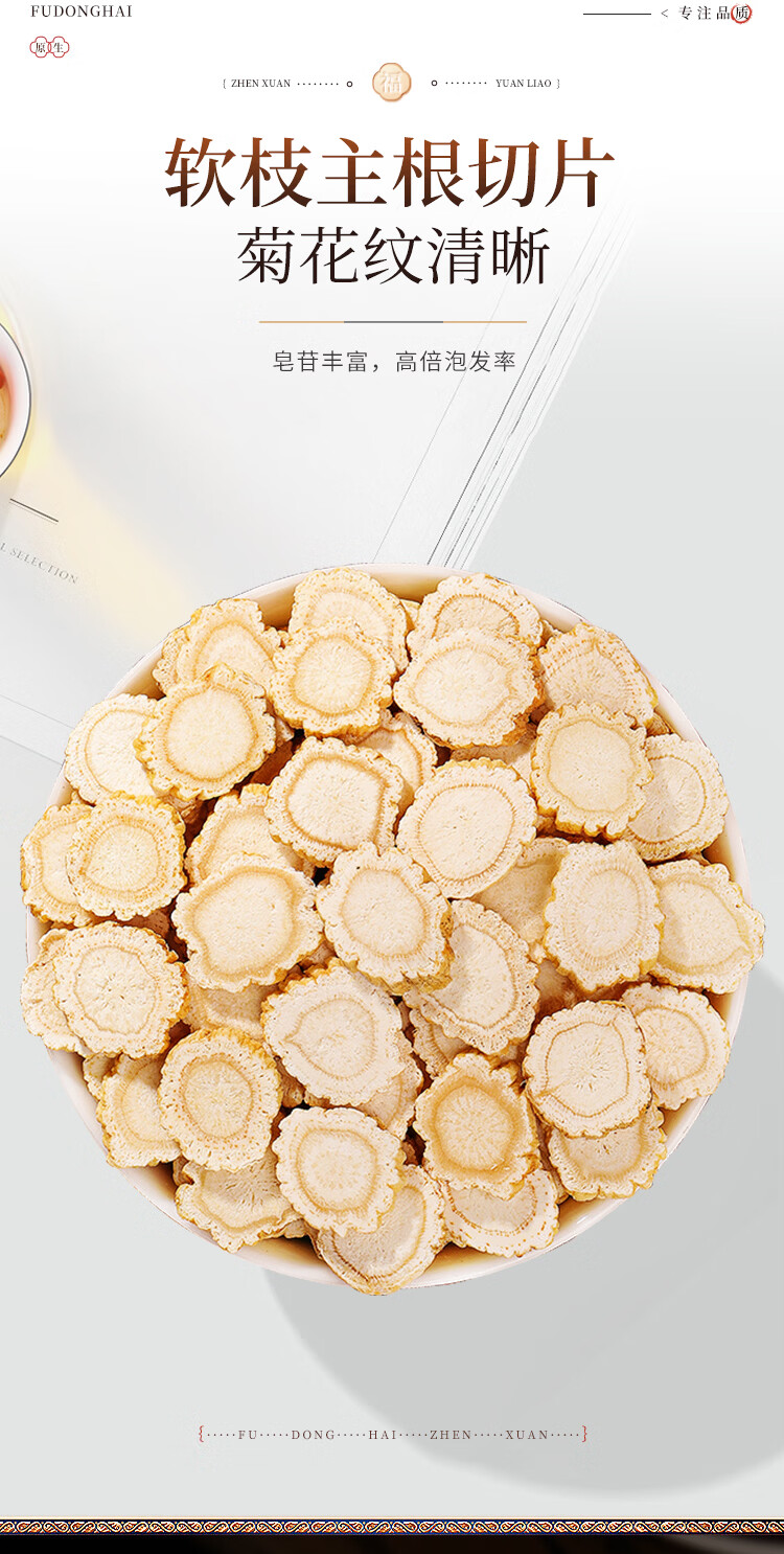 软枝主根切片,菊花纹清晰;皂苷丰富,高倍泡发率;45°斜切,片薄均匀营养易释放