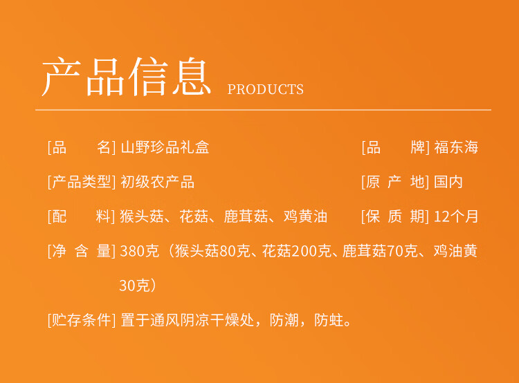 配置:山野珍品礼盒380克(猴头菇80克+花菇200克+鹿茸菇70克+鸡油黄30克)/盒