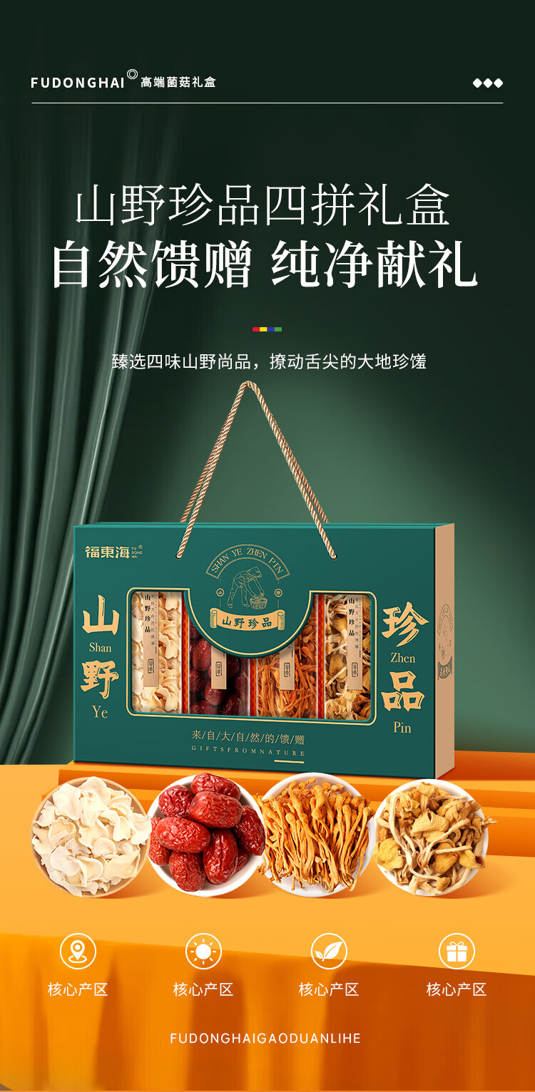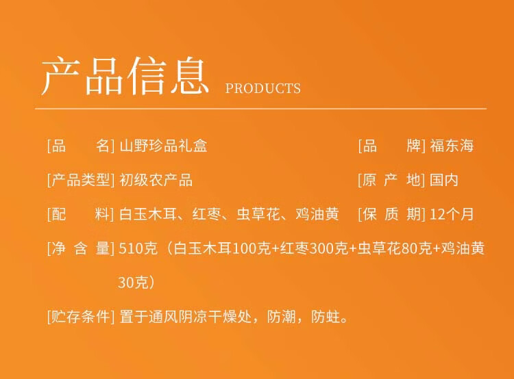 配置:山野珍品礼盒510克(白玉木耳100克+红枣300克+虫草花80克+鸡油黄30克)/盒