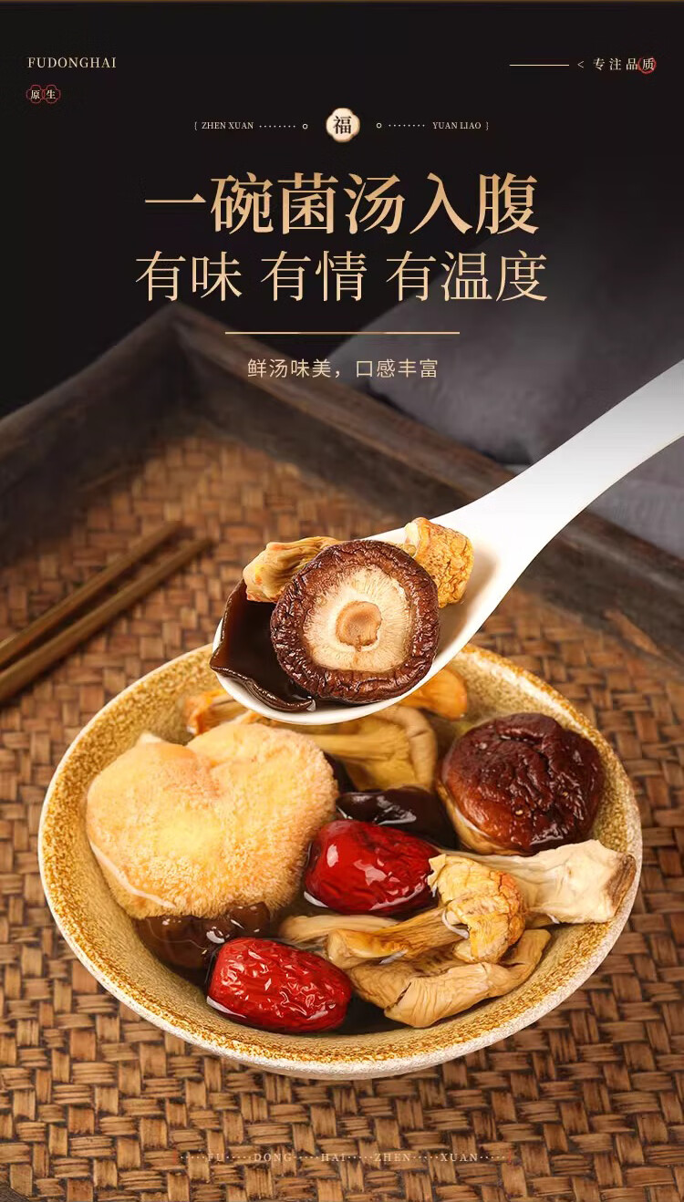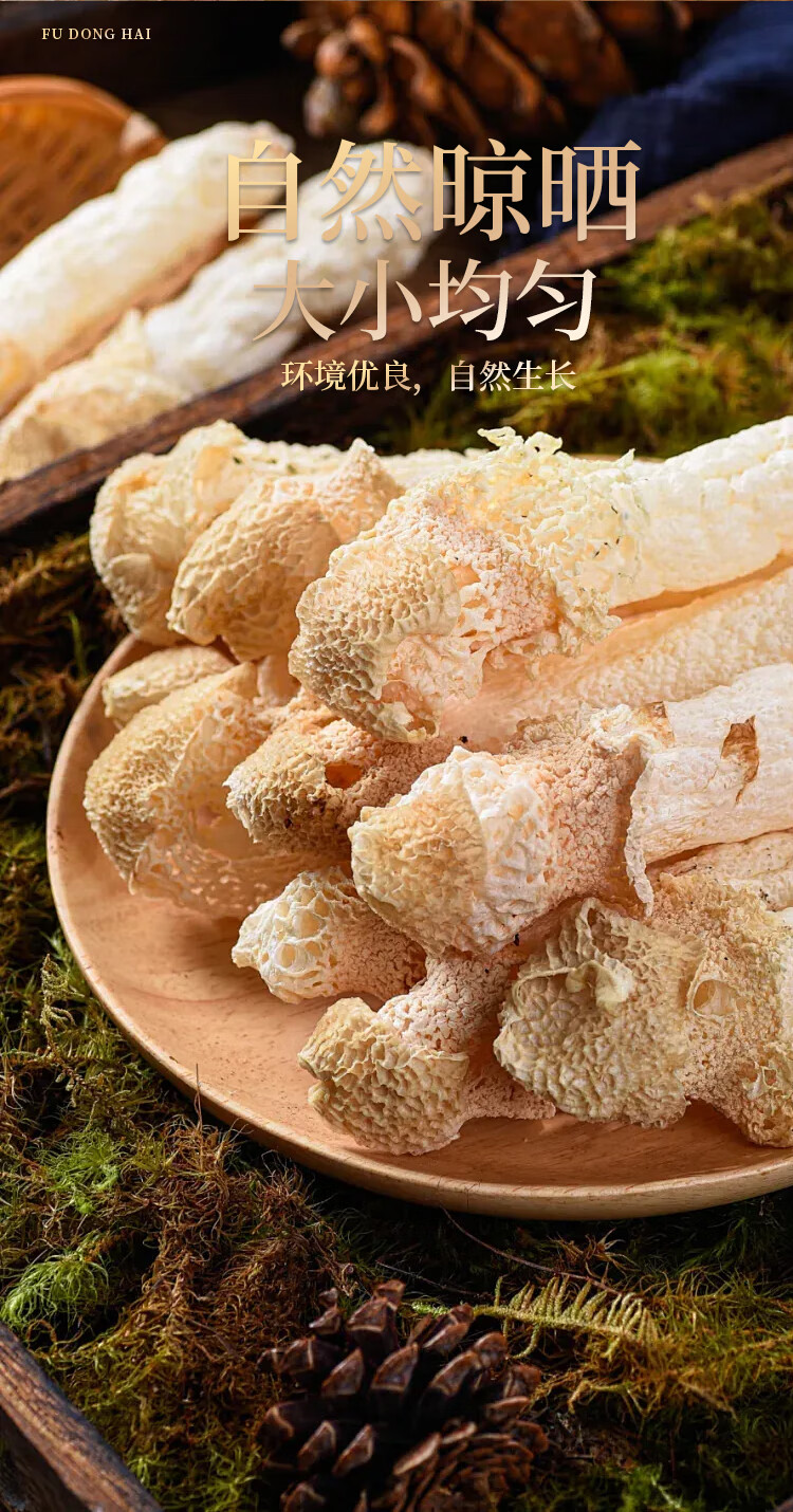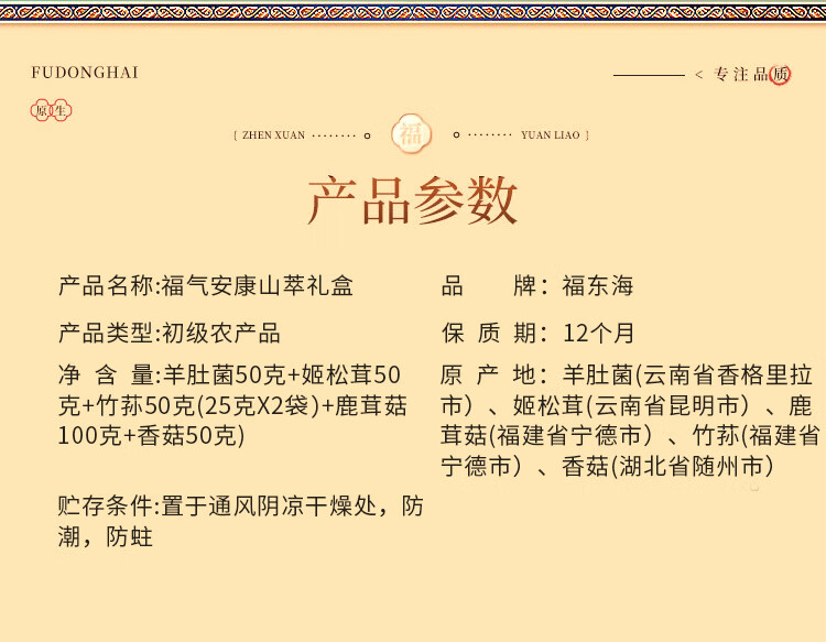 配置:300克(羊肚菌50克+姬松茸50克+竹荪50克(25克x2袋)+鹿茸菇100克+香菇50克)/盒