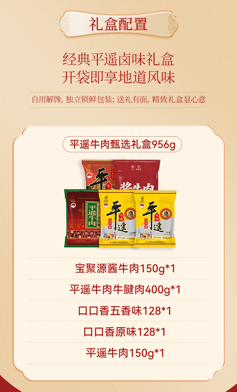 配置清单:宝聚源平遥牛肉150g*1袋 宝聚源平遥牛肉牛腱肉400g*1袋 宝聚源平遥牛肉口口香原味128*1袋 宝聚源平遥牛肉口口香五香味128*1 袋 宝聚源平遥酱牛肉(新)150g*1袋