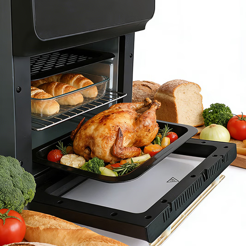 12L大容量,双层设计一次烤多份,满足4~6人使用;一机多用,空气炸、烘培、烧烤、干果、披萨、五大功能;大可视窗面板,食物情况一目了然