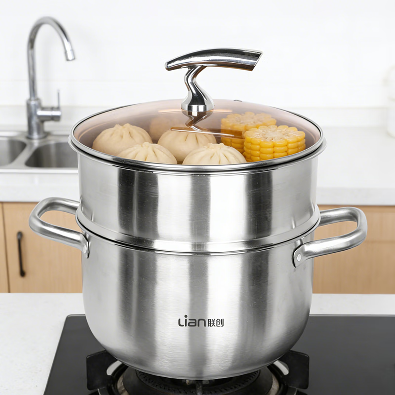 锅身采用不锈钢材料,表面亚光拉丝,内部镜面抛光;锅盖不锈钢包钢化玻璃,蒸煮可视;单层加厚设计,适合多种炉具:电磁炉,煤气炉,电炉