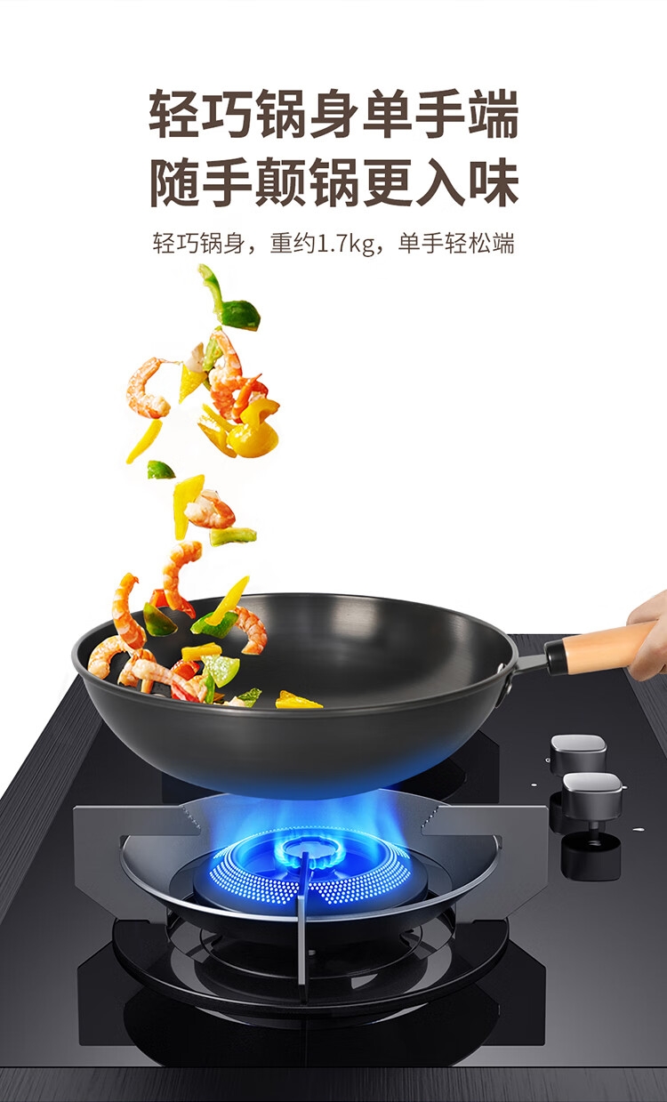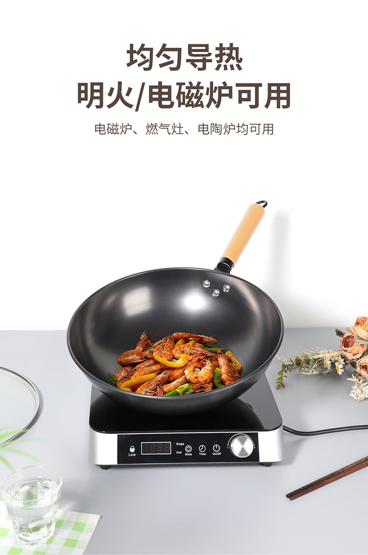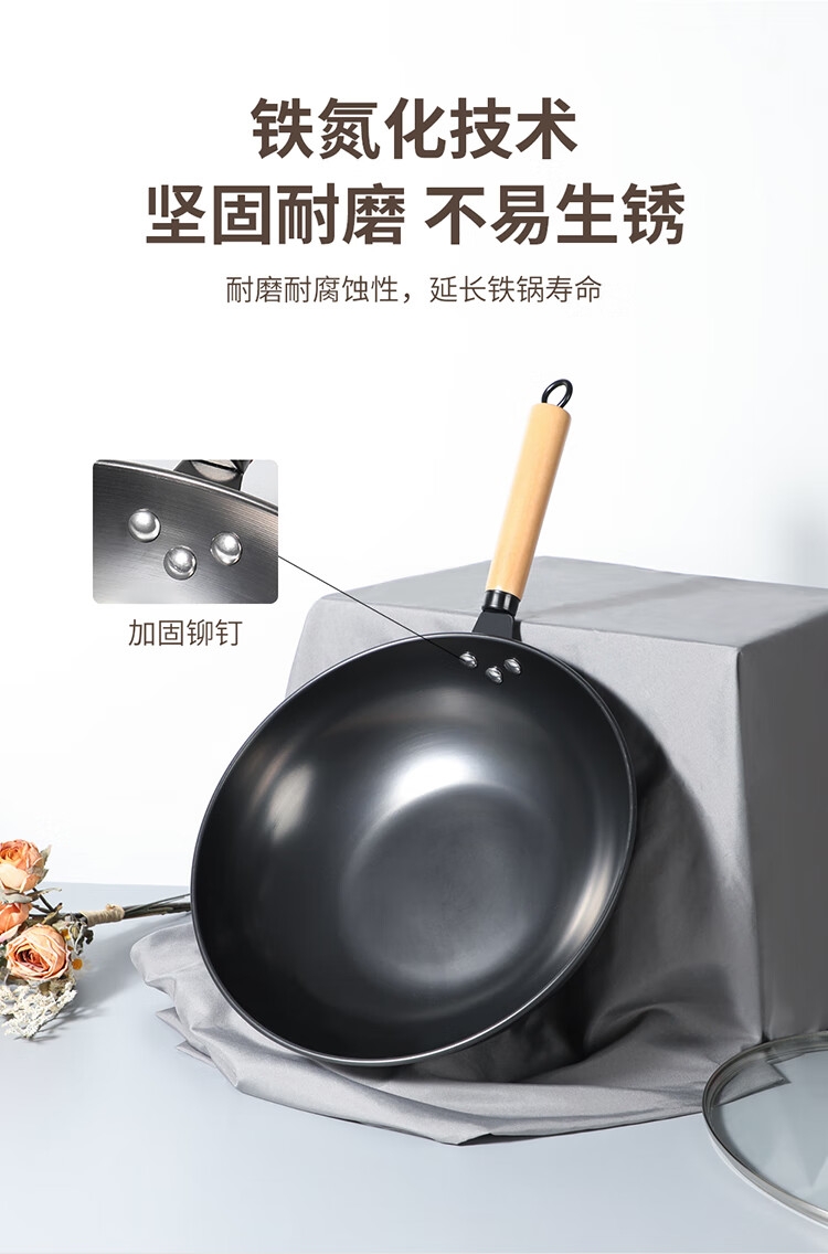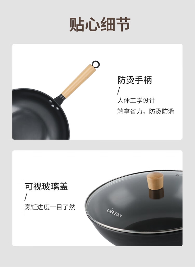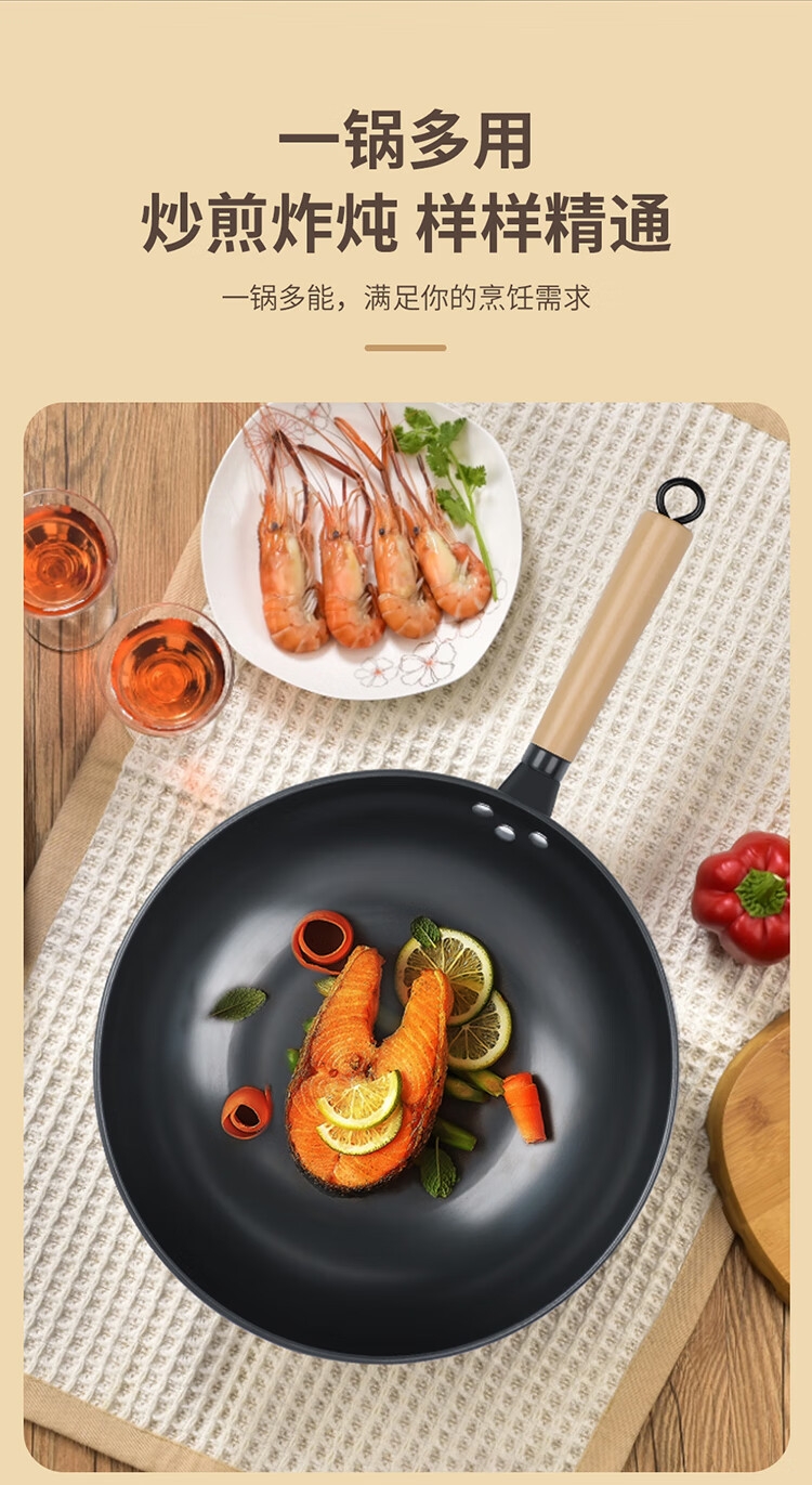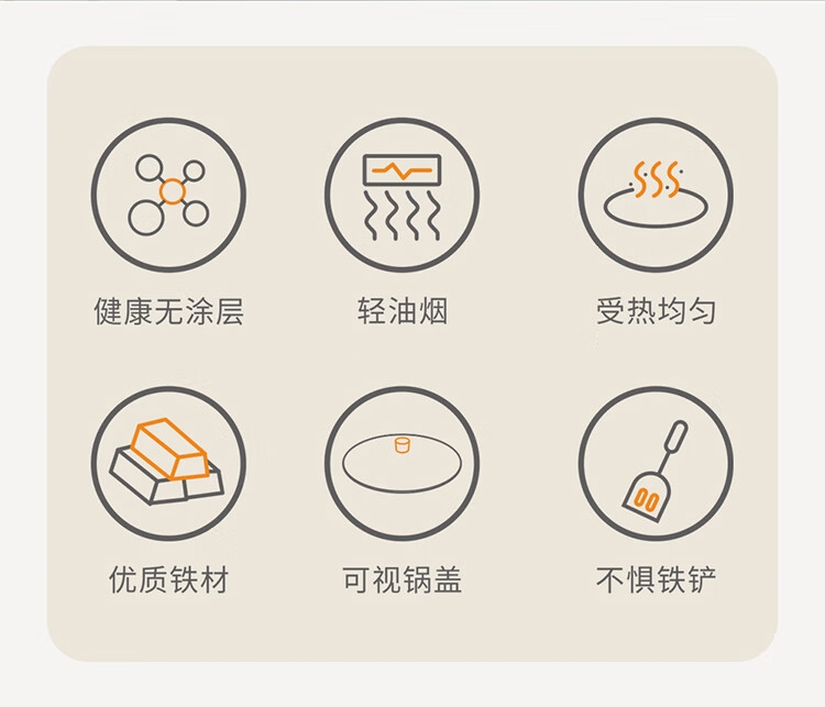 锅身精铁材质,坚固耐用,健康安全;锅身一次成型,无化学涂层;精铁锅独具的导热特性、导热均匀、物理不粘