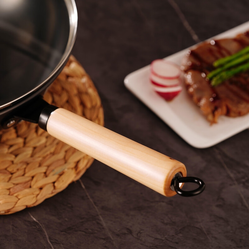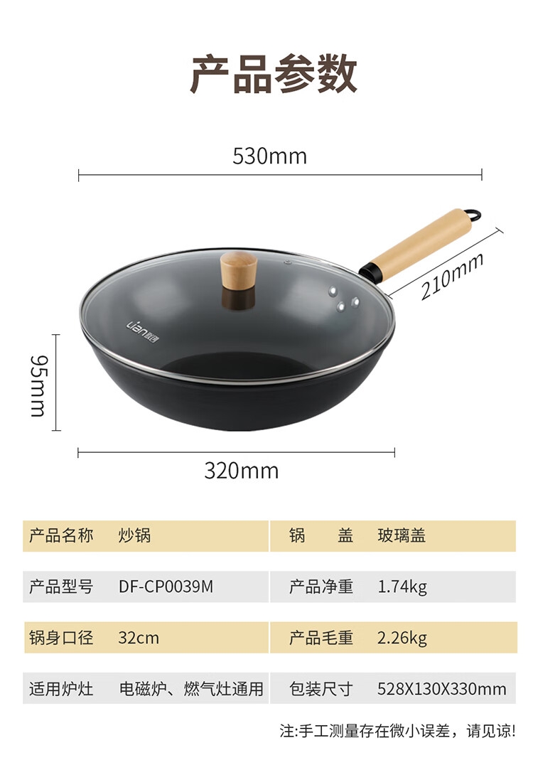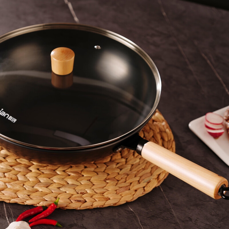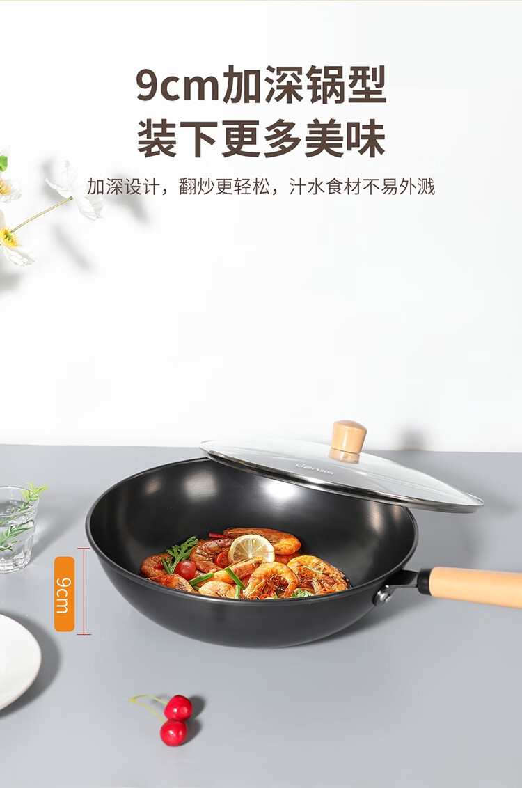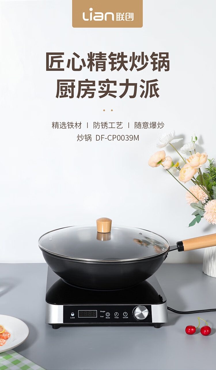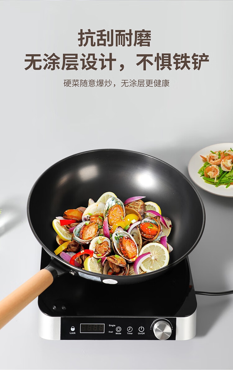 锅身精铁材质,坚固耐用,健康安全;锅身一次成型,无化学涂层;精铁锅独具的导热特性、导热均匀、物理不粘