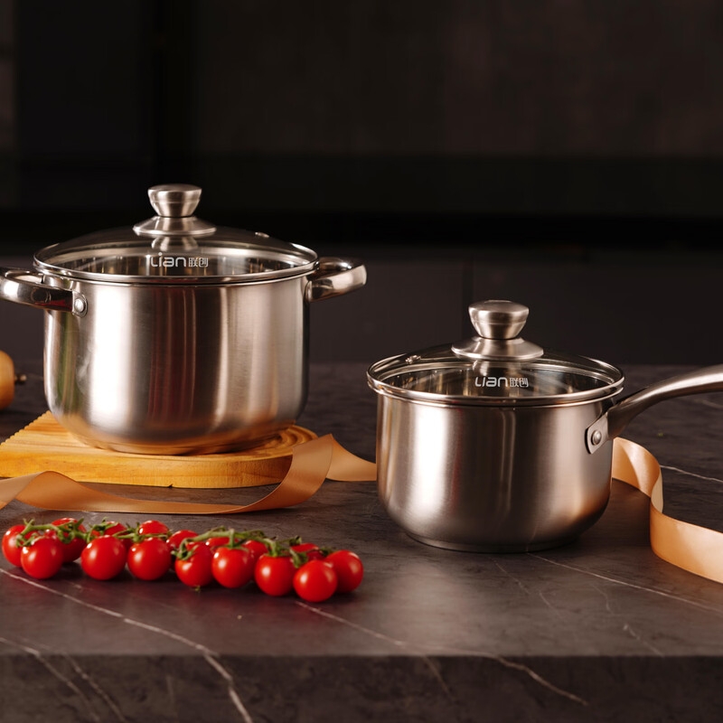 优选食品级不锈钢入口安心,无涂层健康烹饪;16cm奶锅、20cm汤锅,两件套锅具搭配更全面;全景可视玻璃盖,防爆耐热,可视烹饪不锈钢包边