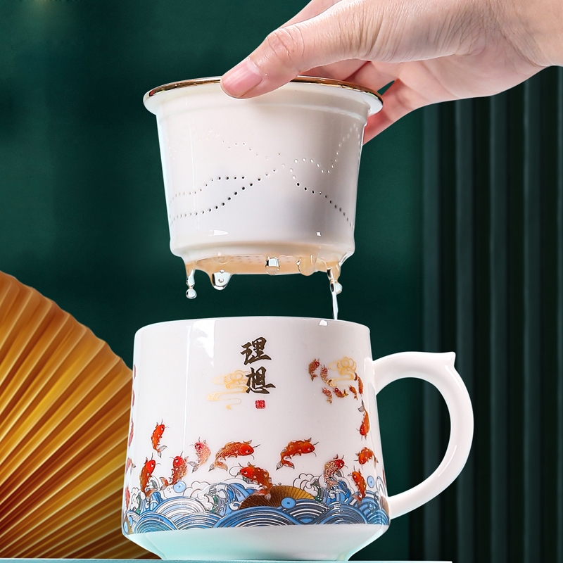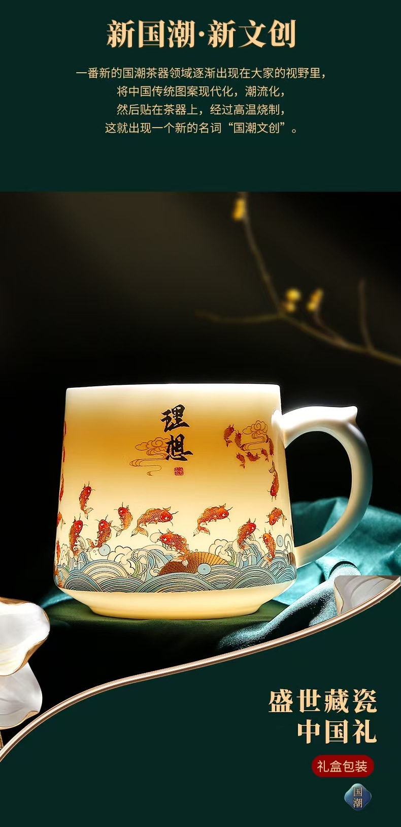 奢华羊脂玉瓷茶具,描金装饰,做工精致,品质高档非凡;鱼跃龙门,为理想而奋斗。杯身可定制图案LOGO;高档礼盒手提袋装