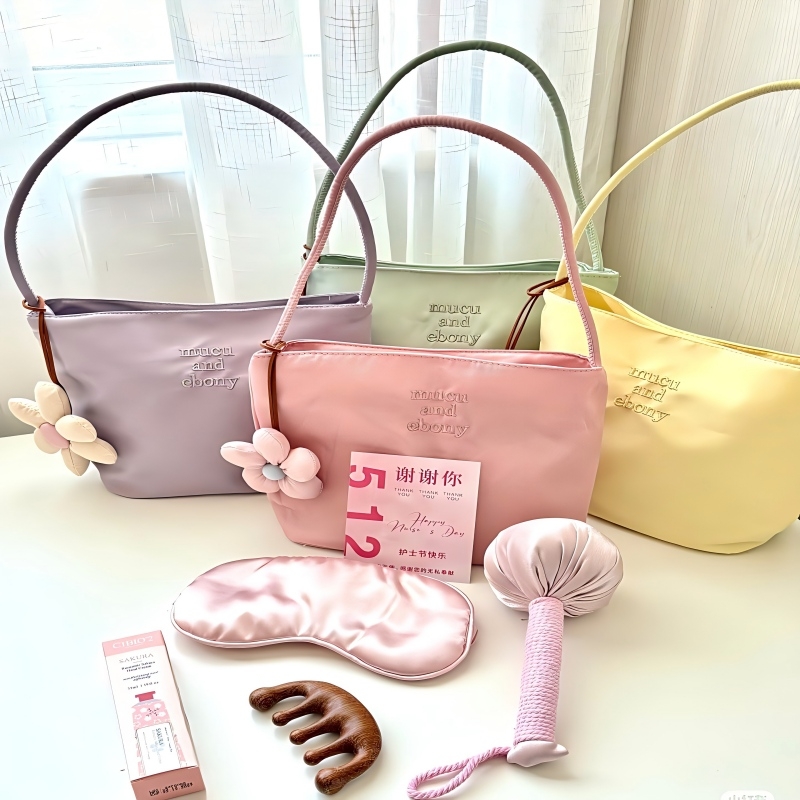 配置清单:-1.马卡龙色刺绣托特包2.缎面按摩捶3.木质按摩梳4.真丝眼罩5.泰国樱花护手霜6.护士节专属贺卡