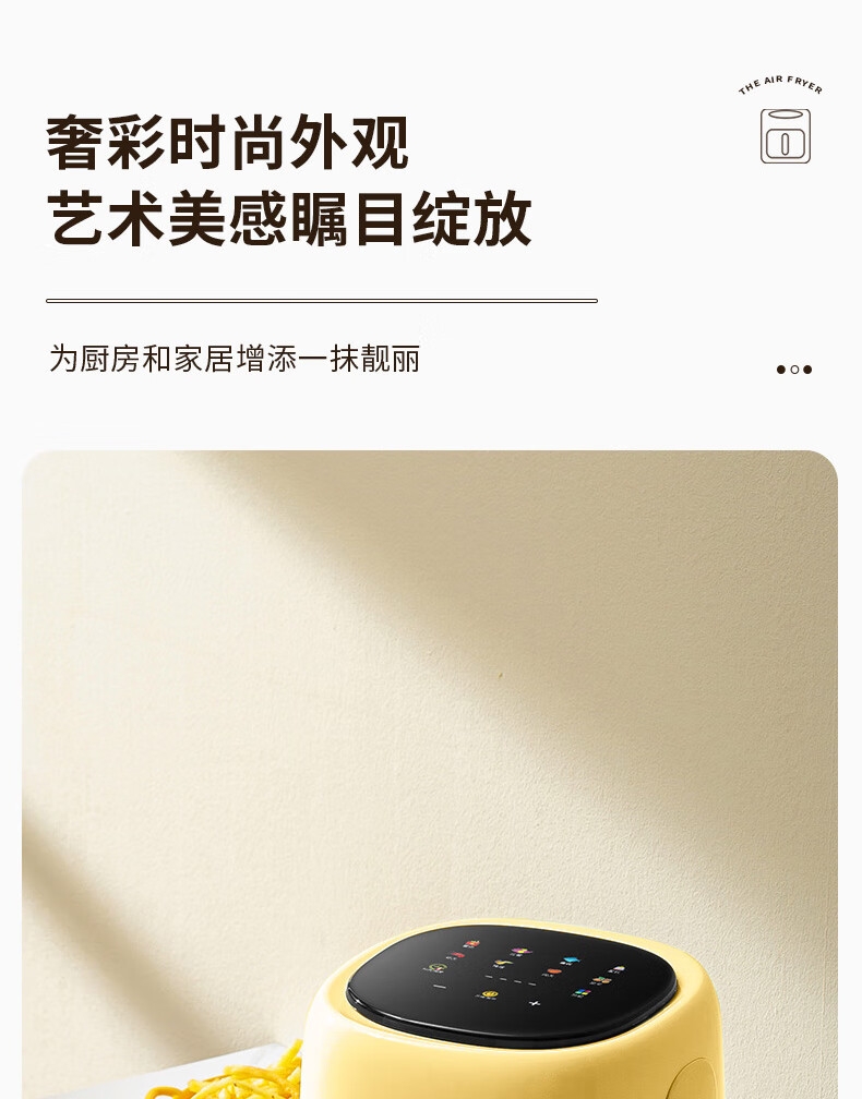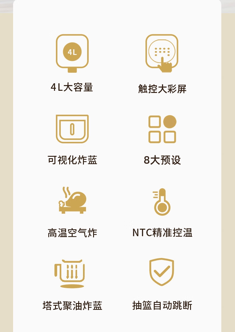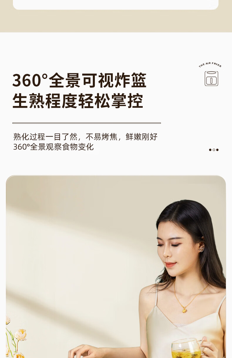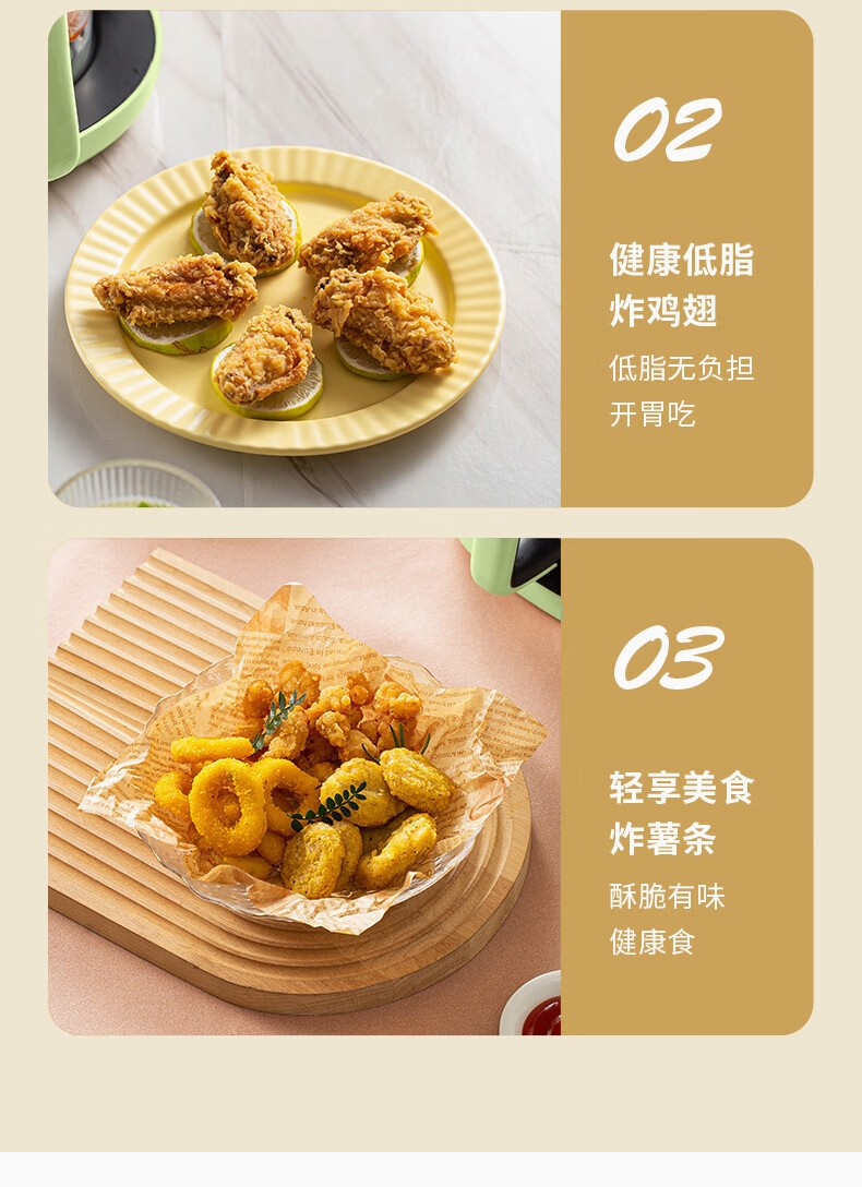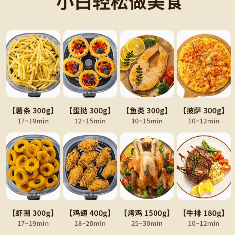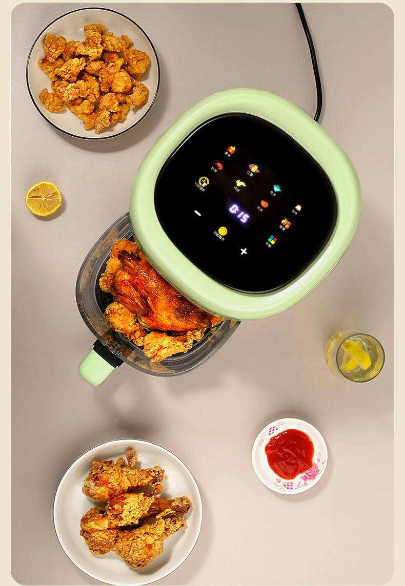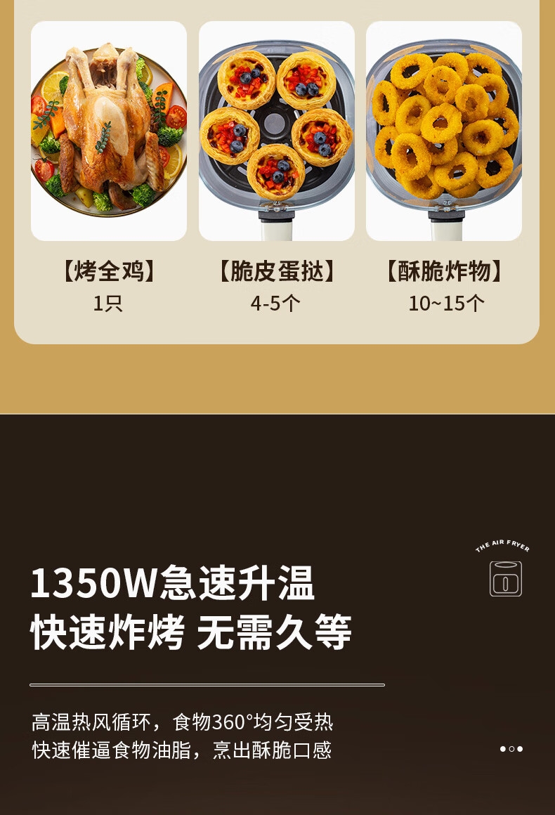 360°全景可视炸蓝;4L黄金大容量,可烤全鸡,三餐四季,满足全家需求;1350W大功率,急速升温