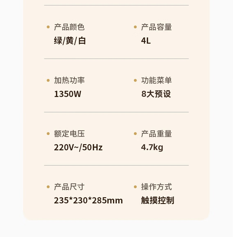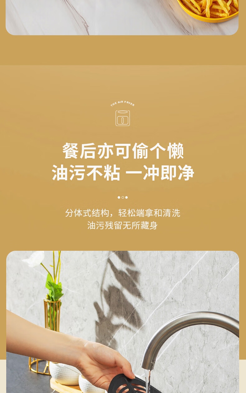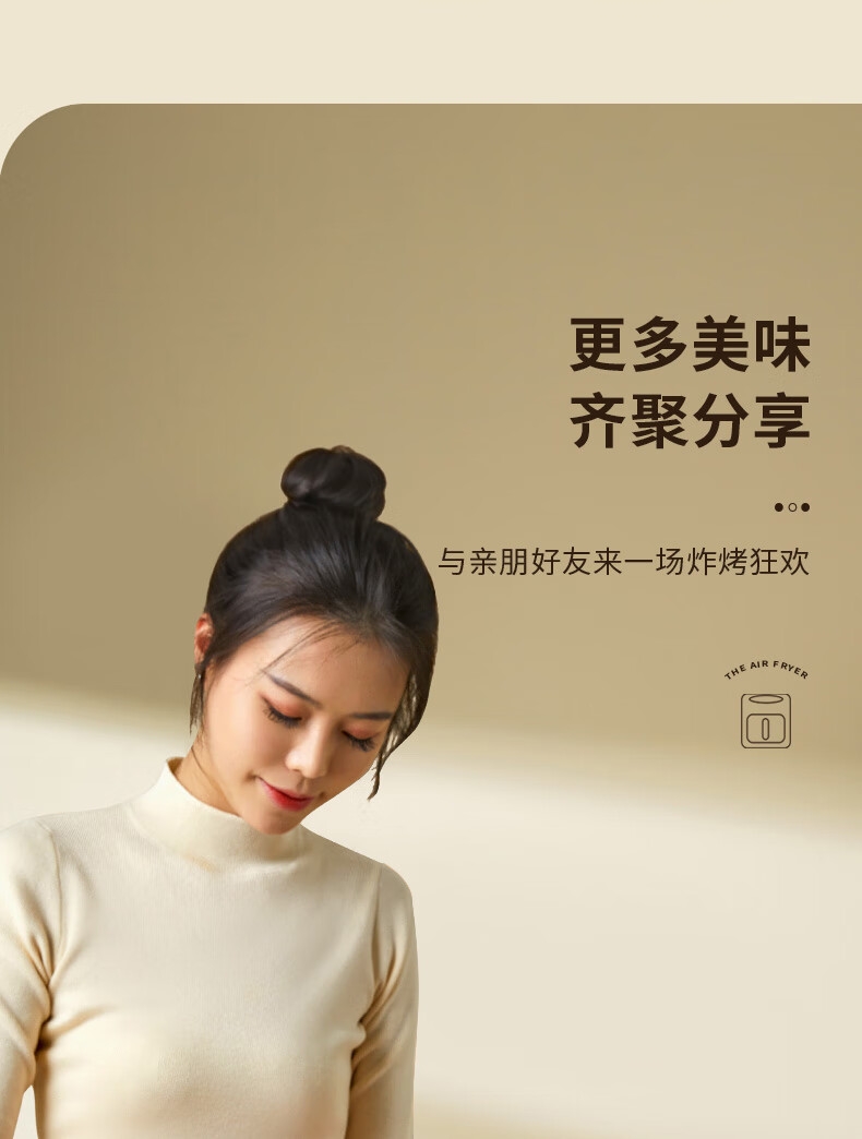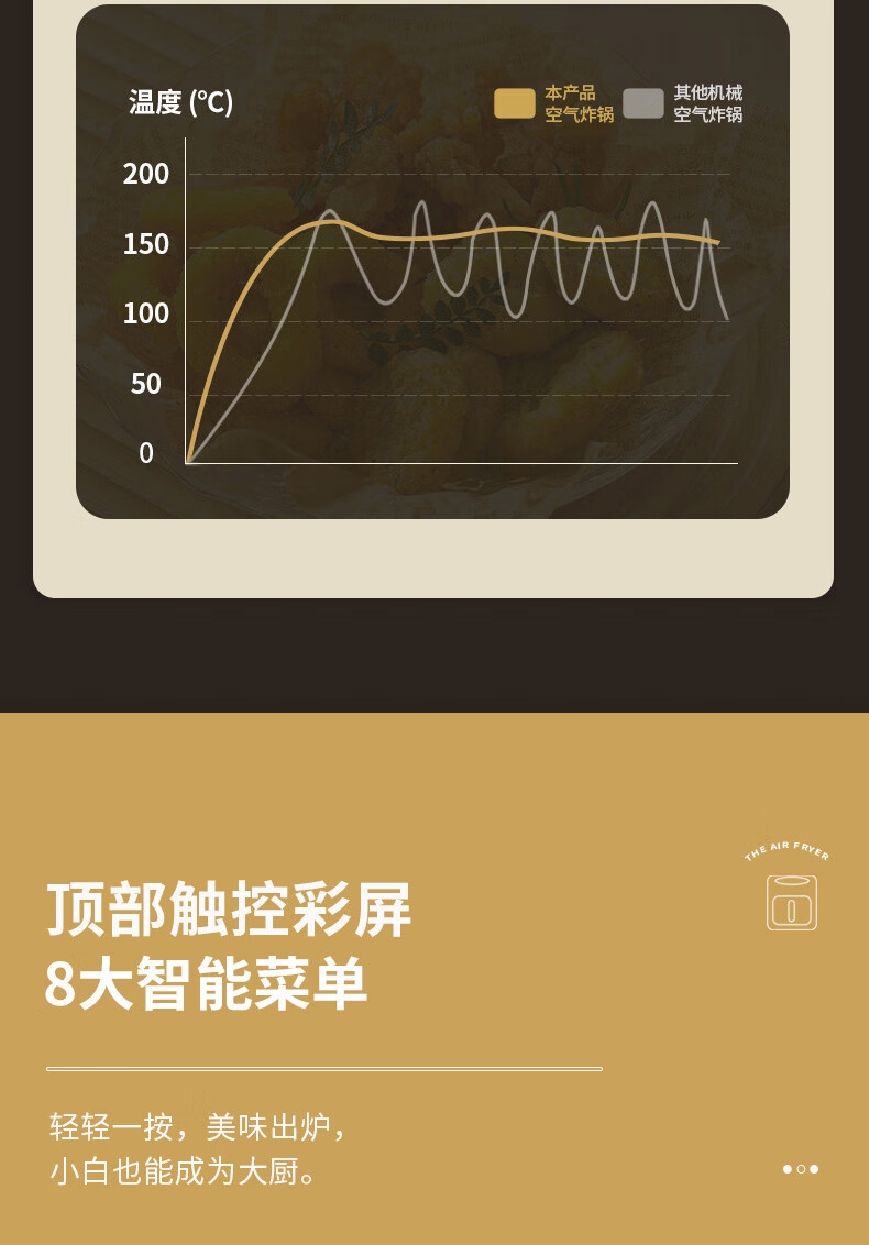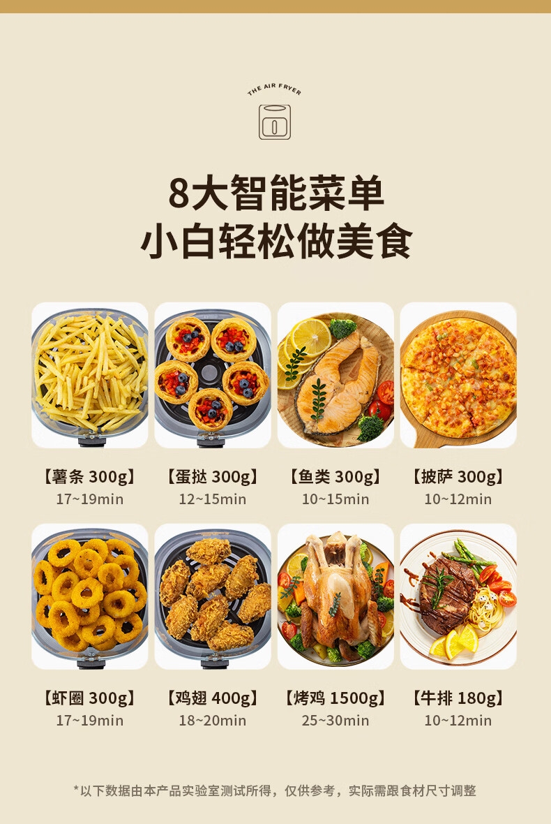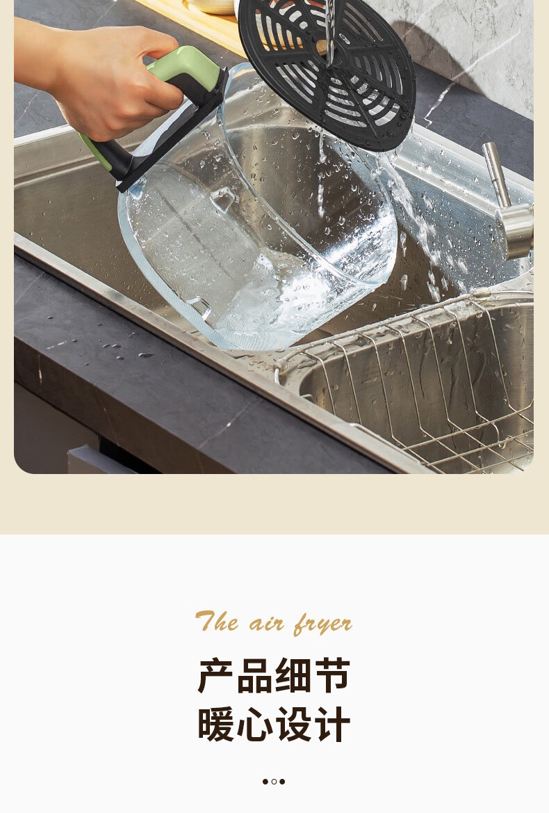 360°全景可视炸蓝;4L黄金大容量,可烤全鸡,三餐四季,满足全家需求;1350W大功率,急速升温