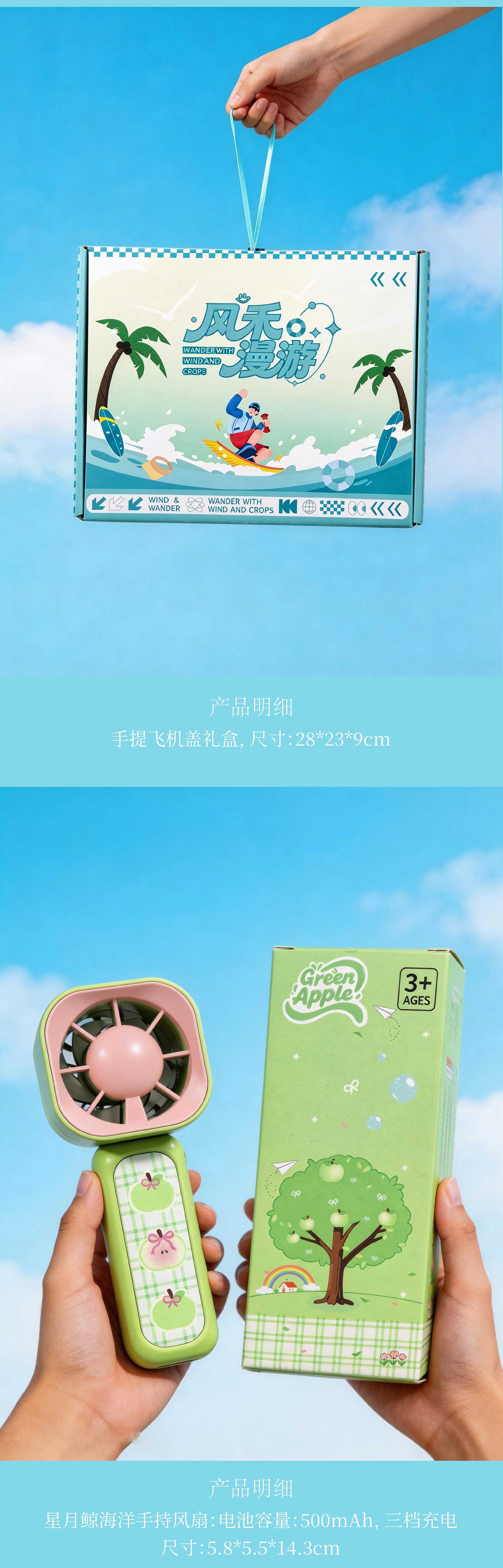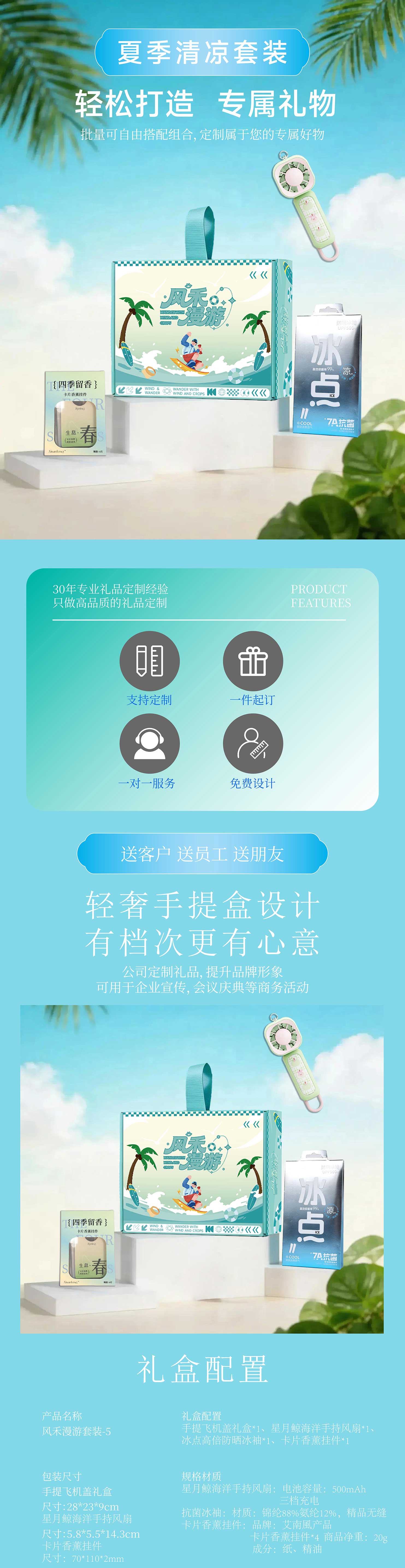 飞机盖手提礼盒;冰袖:材质:锦纶88%氨纶12%;手持风扇:电池容量:500mAh 三档充电