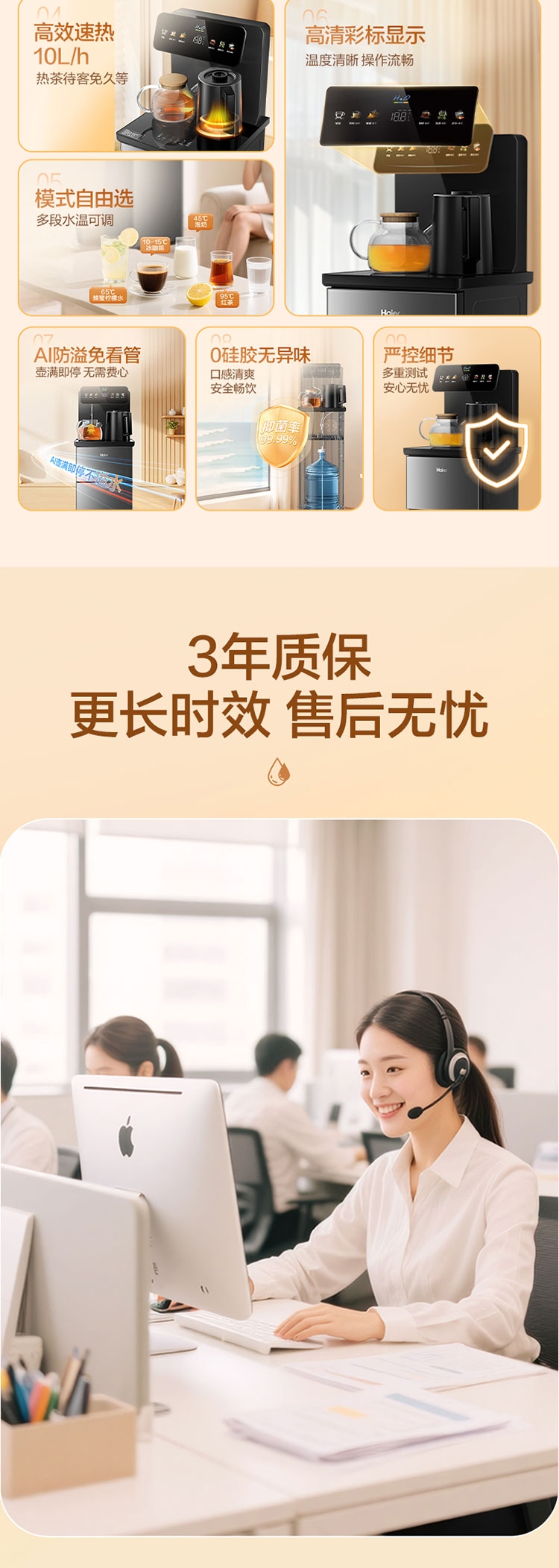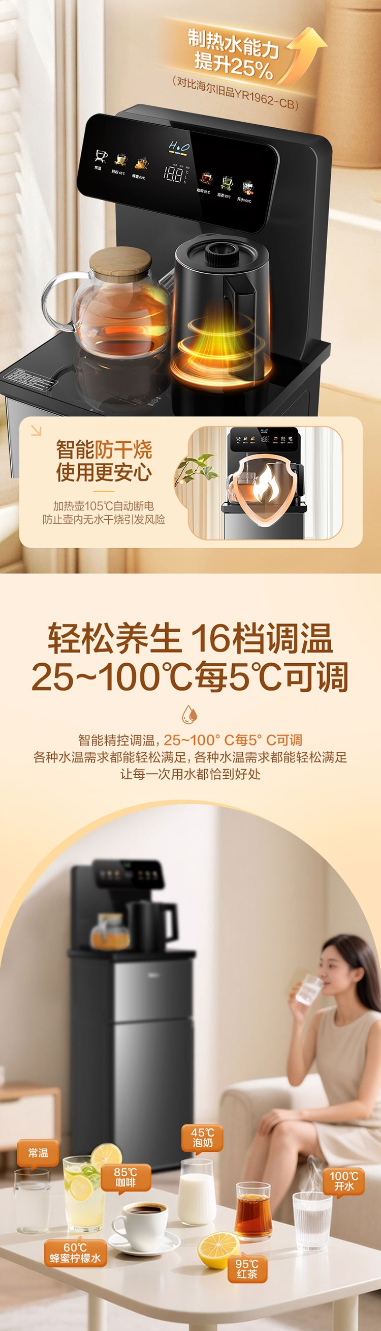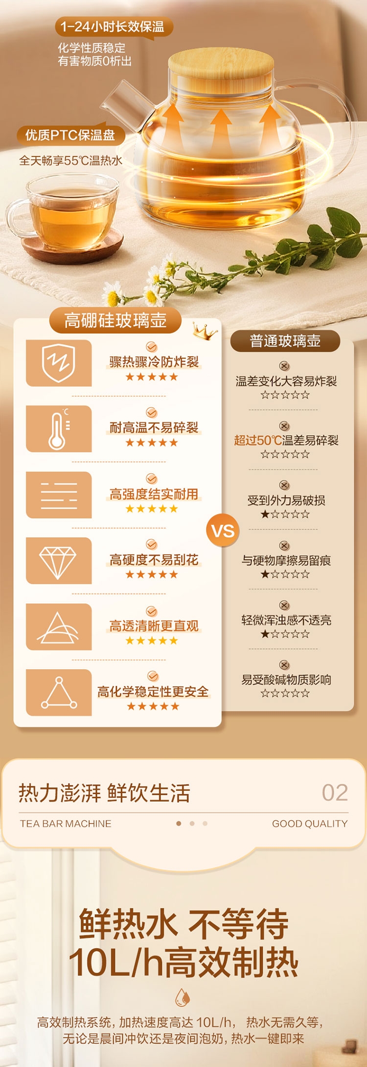 高效速热10L/h热茶待客免久等;高清彩标显示温度清晰操作流畅;模式自由选多段水温可调